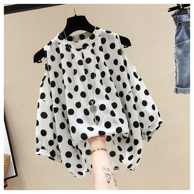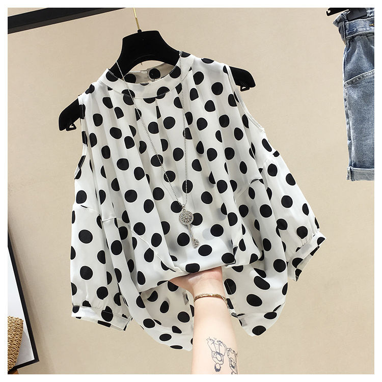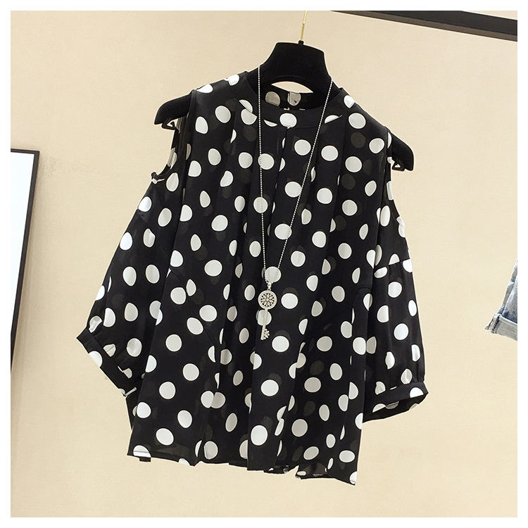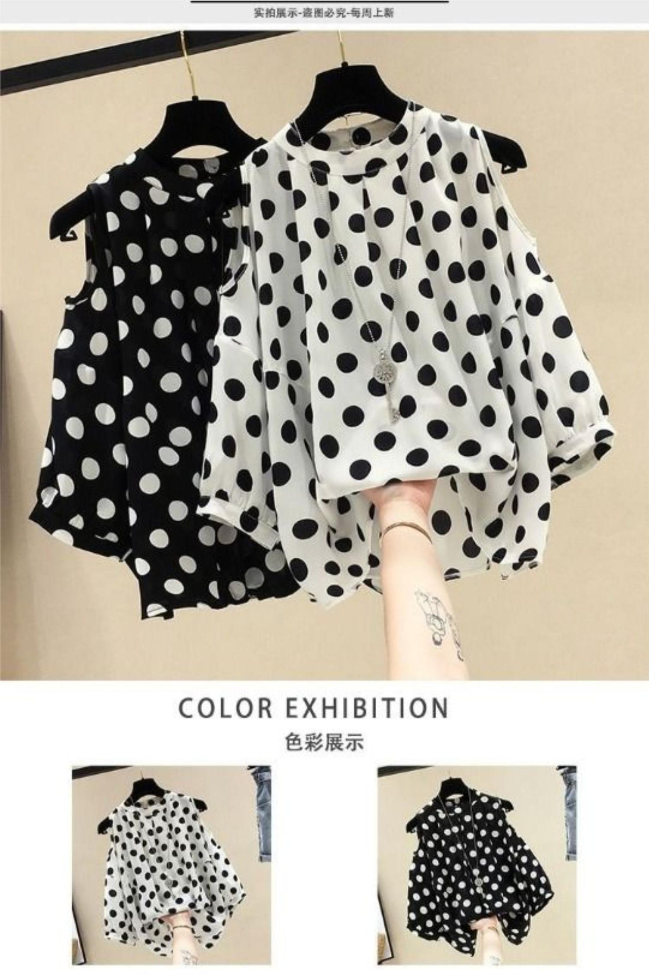 플러스 사이즈 여성 여름 신작 뚱뚱한 소녀 루즈 슬리밍 배 커버 탑 폴카 도트 오프 숄더 반팔 쉬폰 셔츠