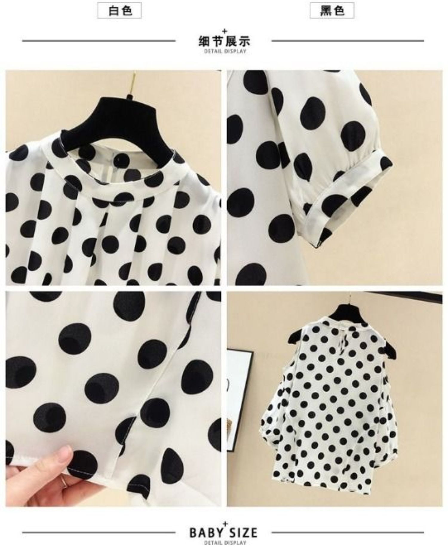 플러스 사이즈 여성 여름 신작 뚱뚱한 소녀 루즈 슬리밍 배 커버 탑 폴카 도트 오프 숄더 반팔 쉬폰 셔츠스토어 가기