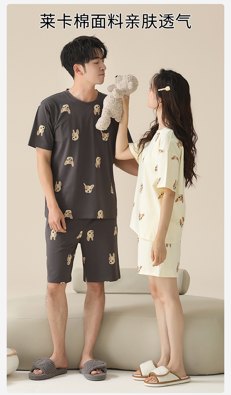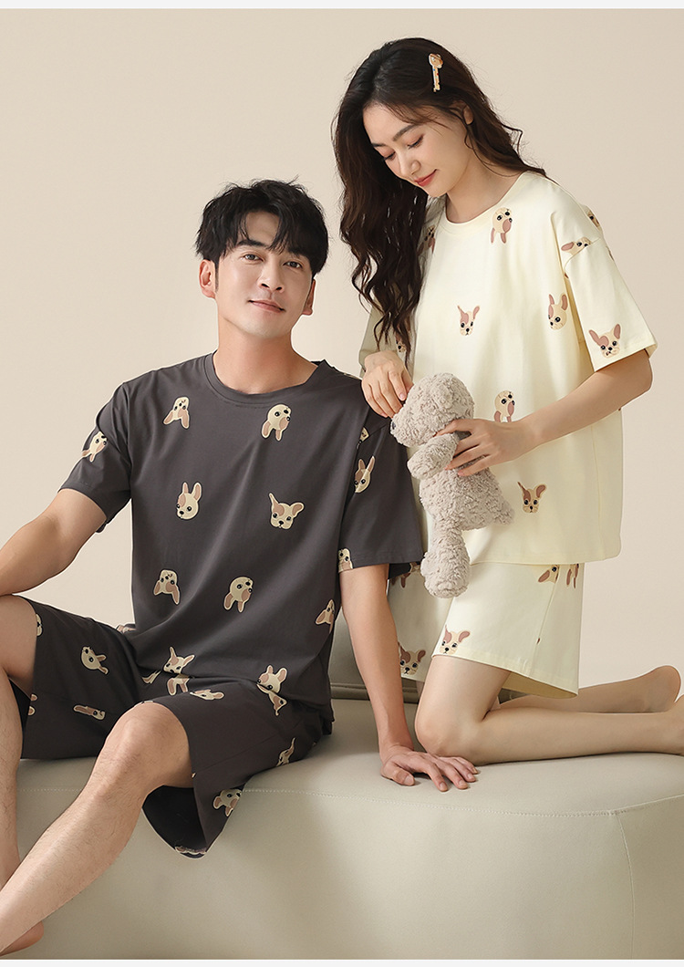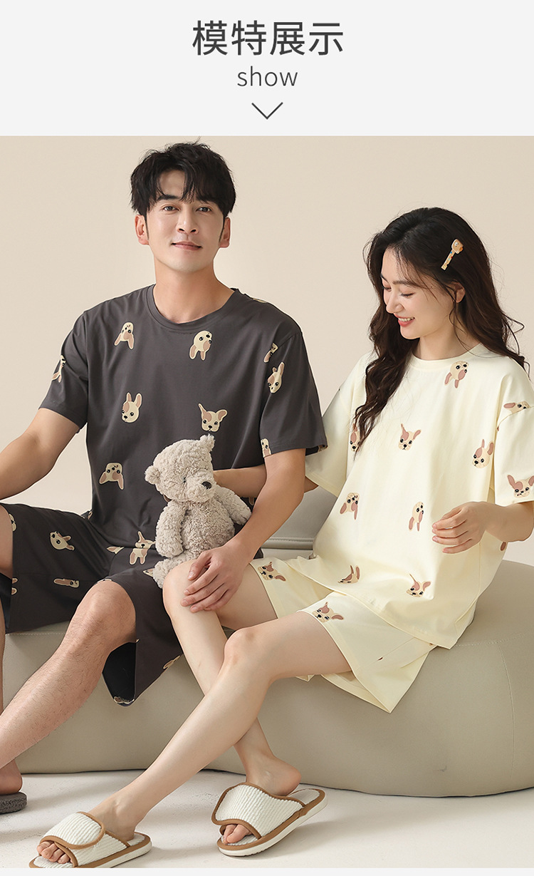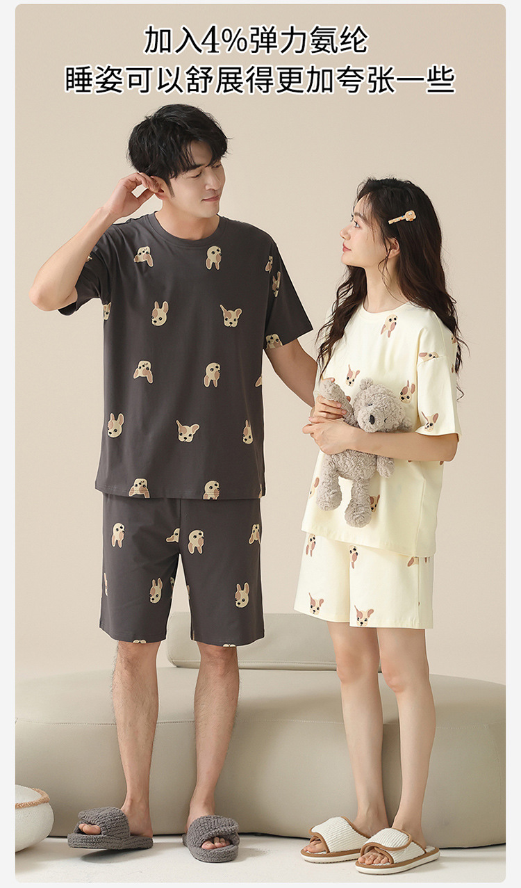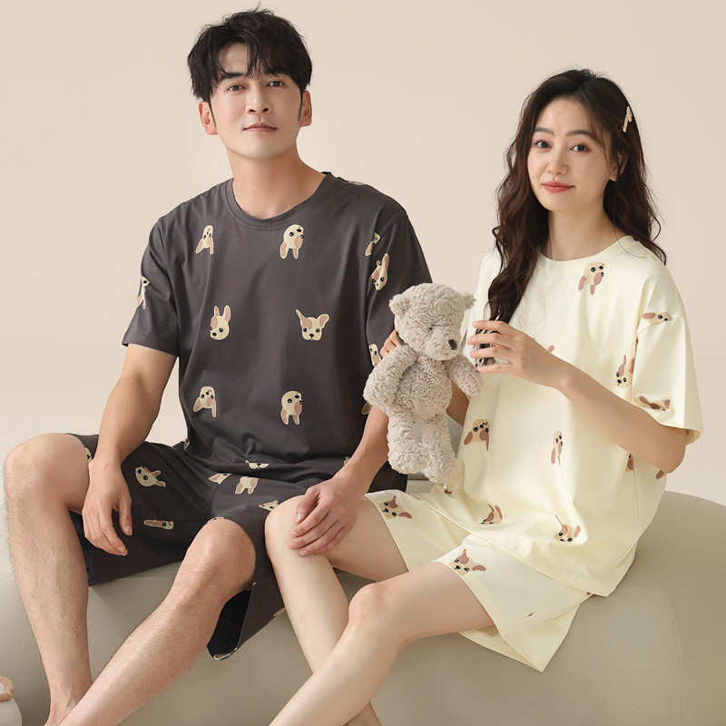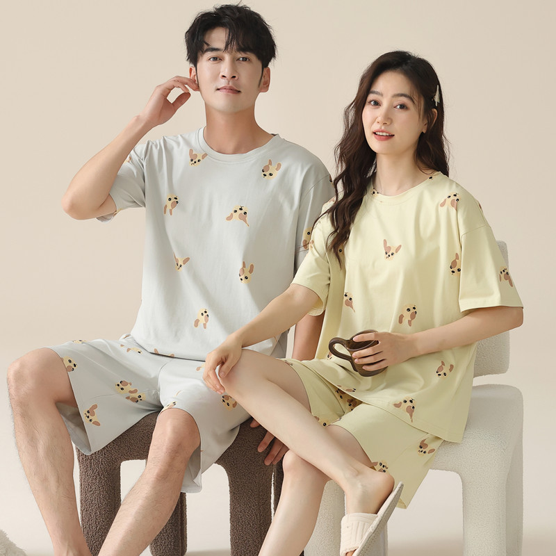 순면 홈 착용 세트 얇은 짧은 소매 반바지 커플의 둥근 목 느슨한 한국 인쇄 잠옷 여름