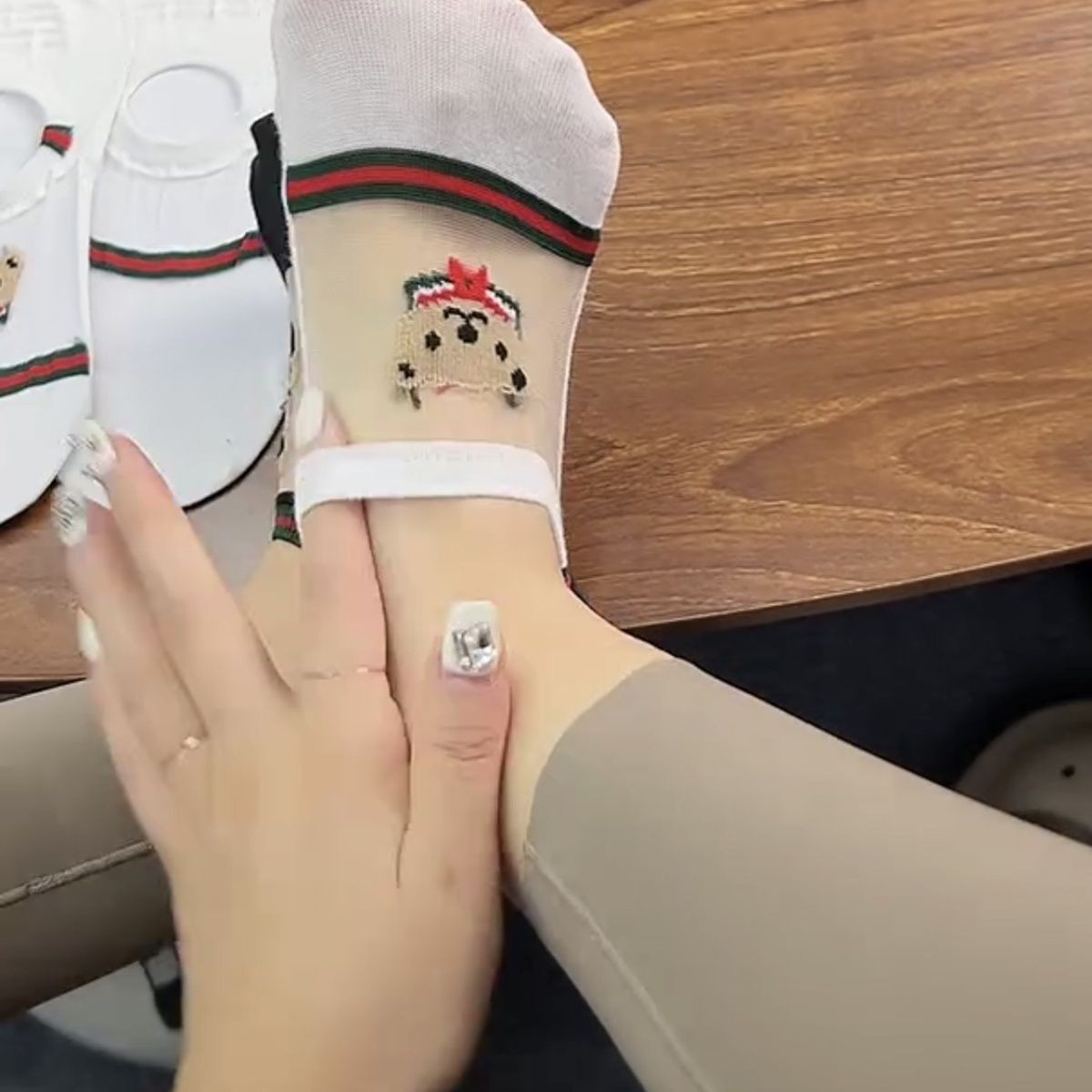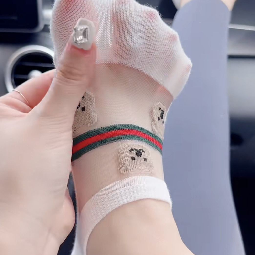 유럽 곰 빨간색과 녹색 줄무늬 얼음 실크 보이지 않는 여성용 양말 인터넷 연예인 초박형 땀 흡수 통기성 미끄럼 방지 떨어지지 않는 얕은 입 보트 양말