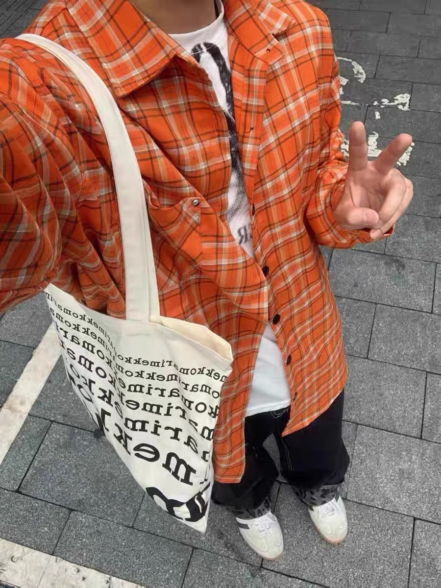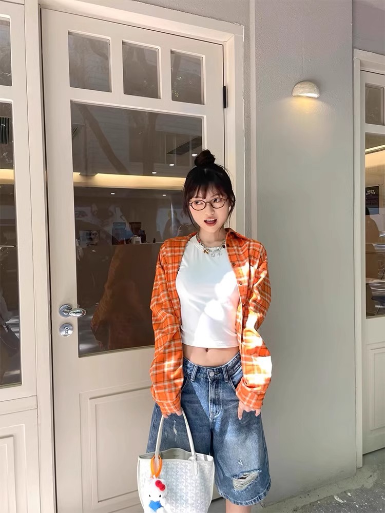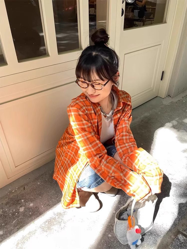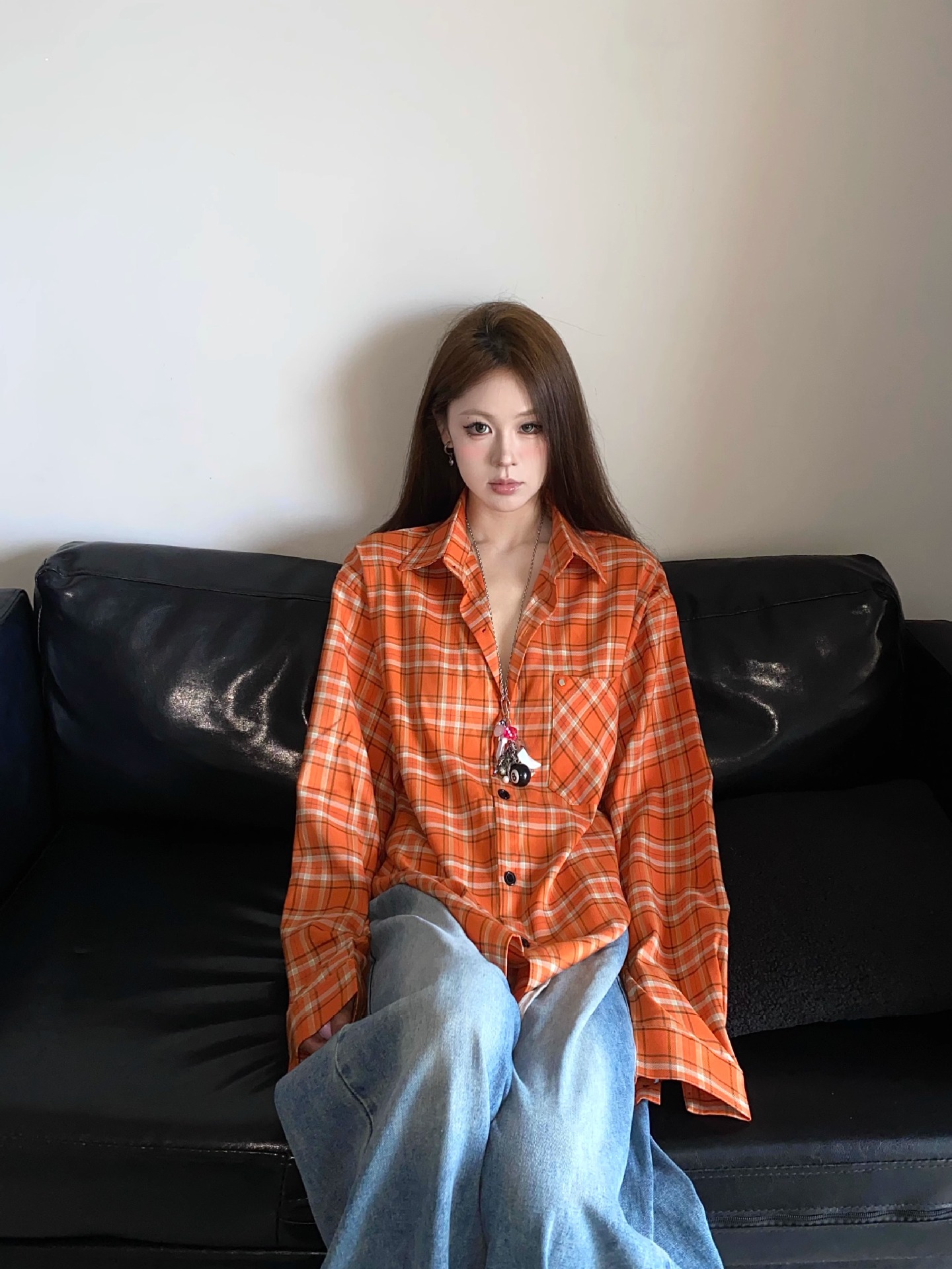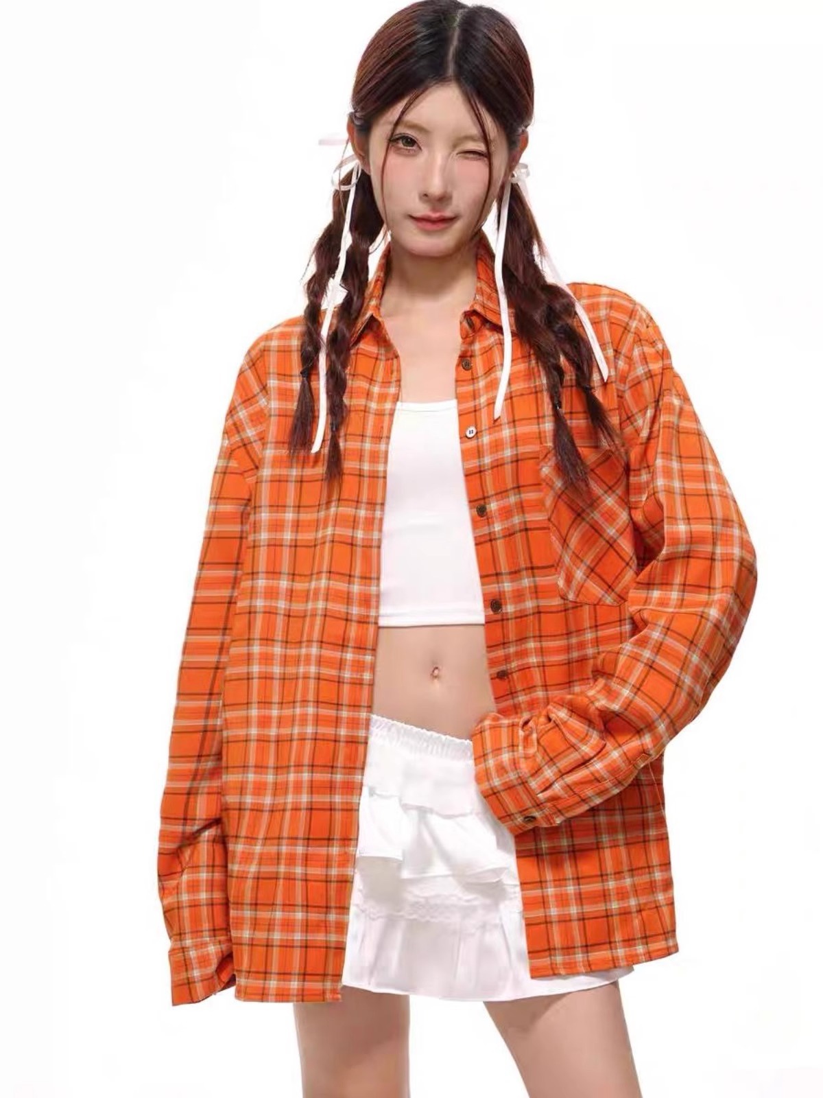 미국의 봄과 가을 복고풍 화이트 오렌지 격자 무늬 셔츠 여름 느슨한 재킷 최고 소녀의 선 스크린 셔츠 국경스토어 가기
