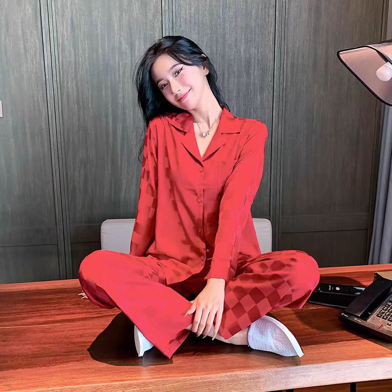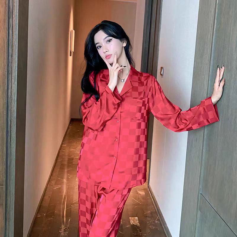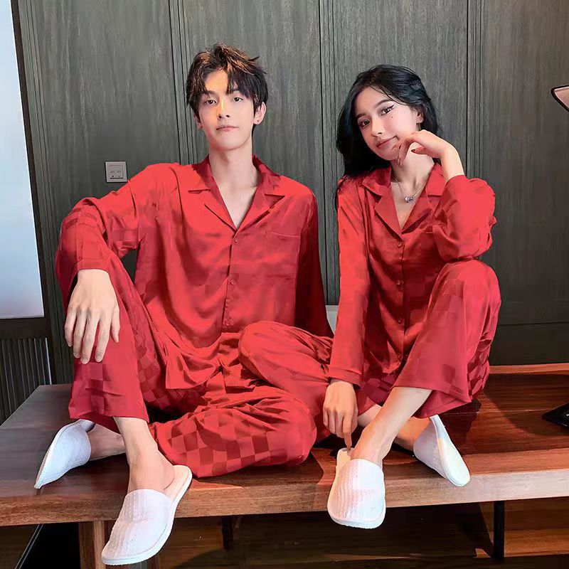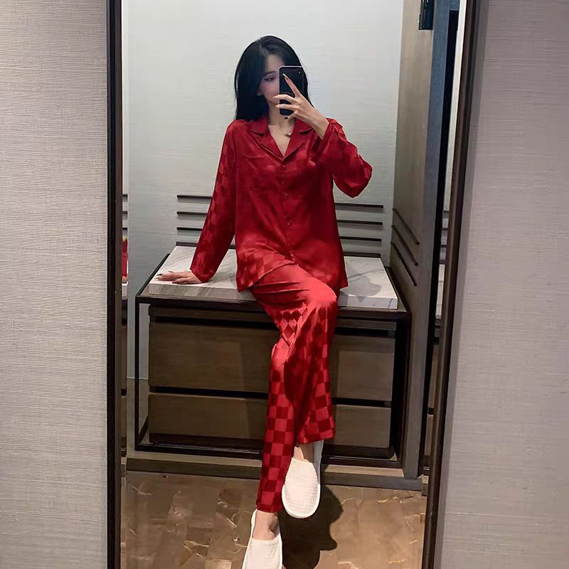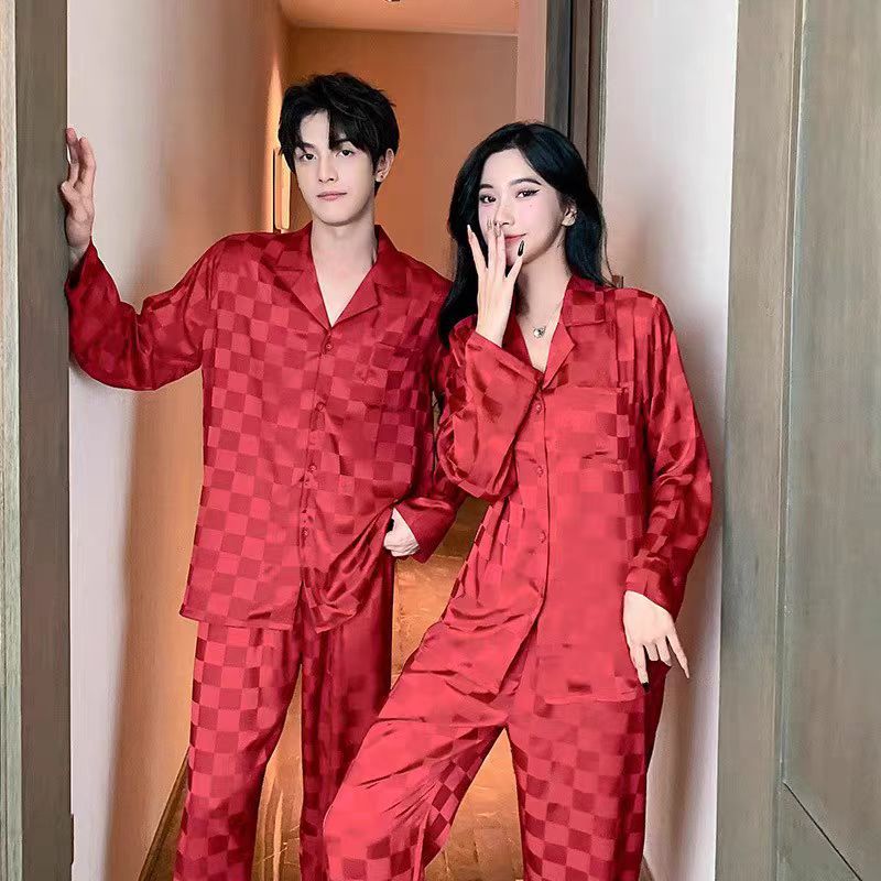 빨간 격자 무늬 커플 얇은 아이스 실크 파자마 긴 소매 바지 카디건 세트 패션 캐주얼 홈 옷 축제