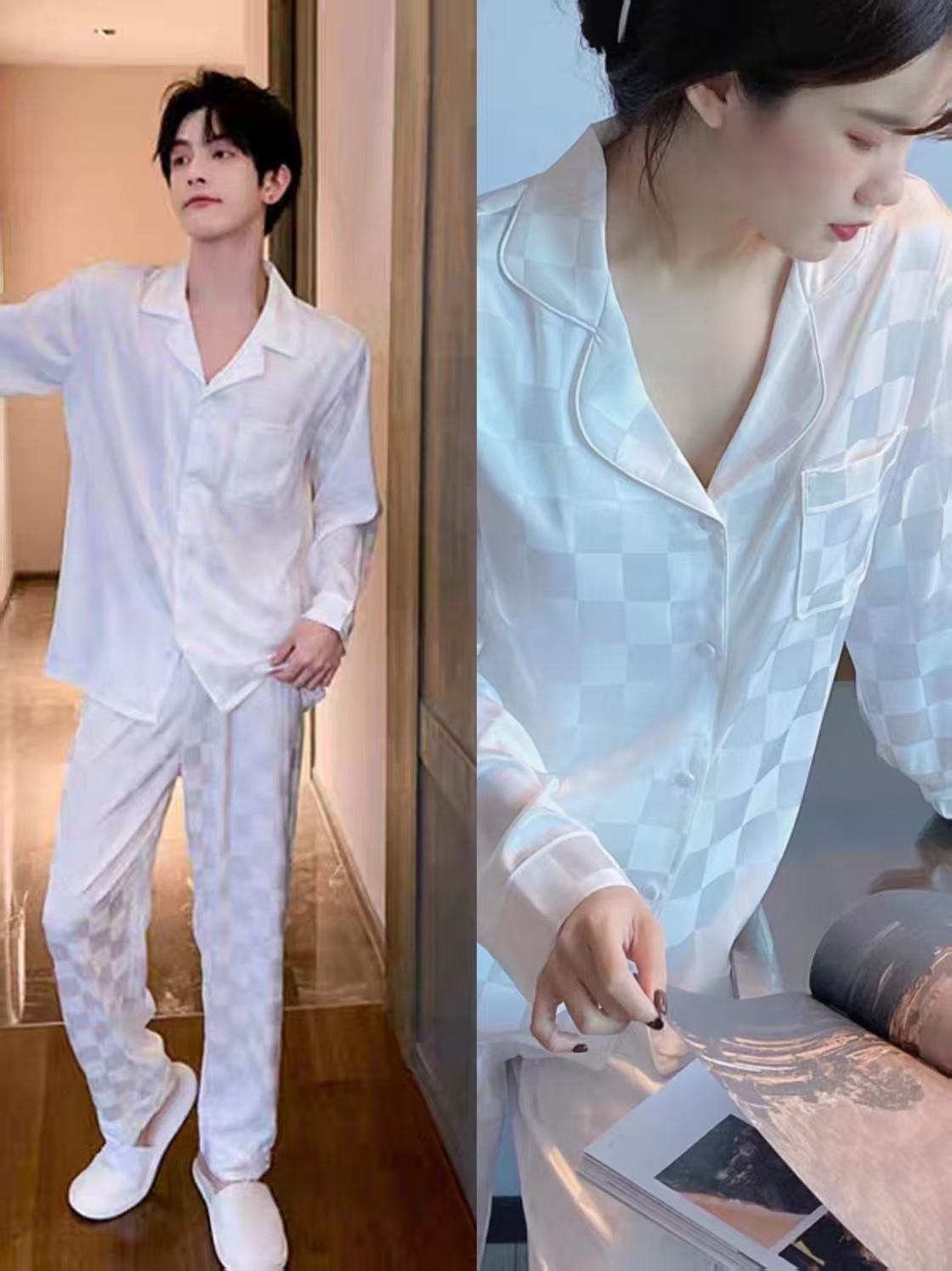 빨간 격자 무늬 커플 얇은 아이스 실크 파자마 긴 소매 바지 카디건 세트 패션 캐주얼 홈 옷 축제스토어 가기