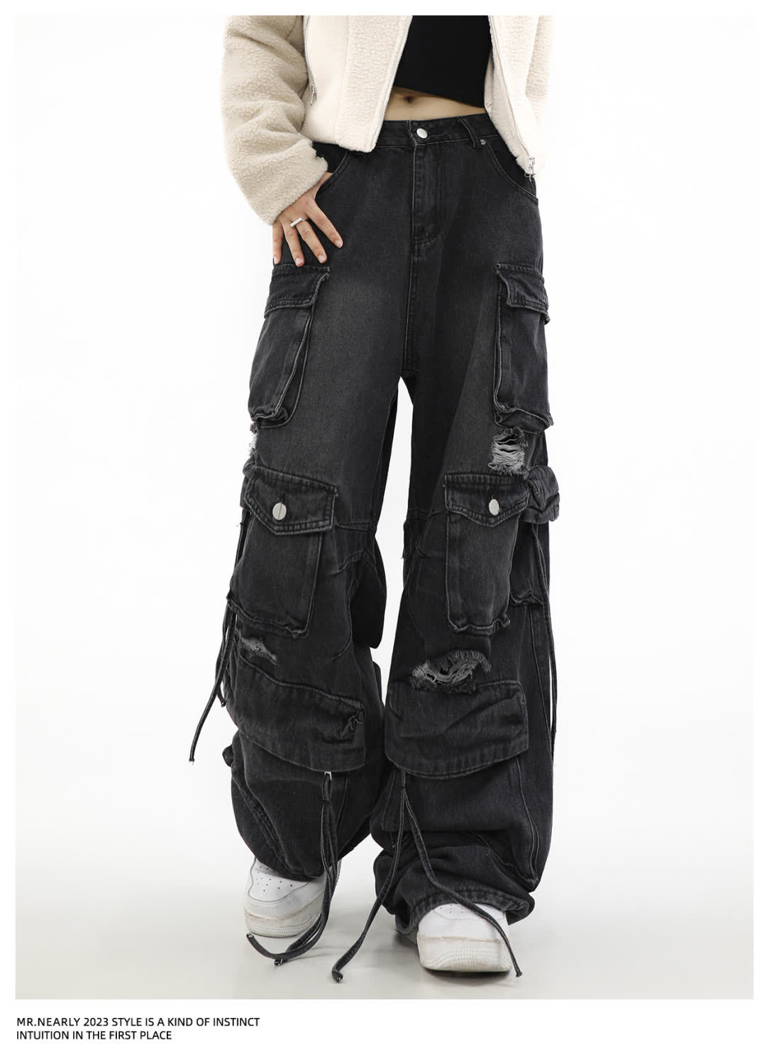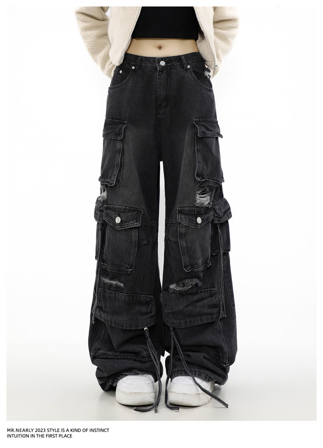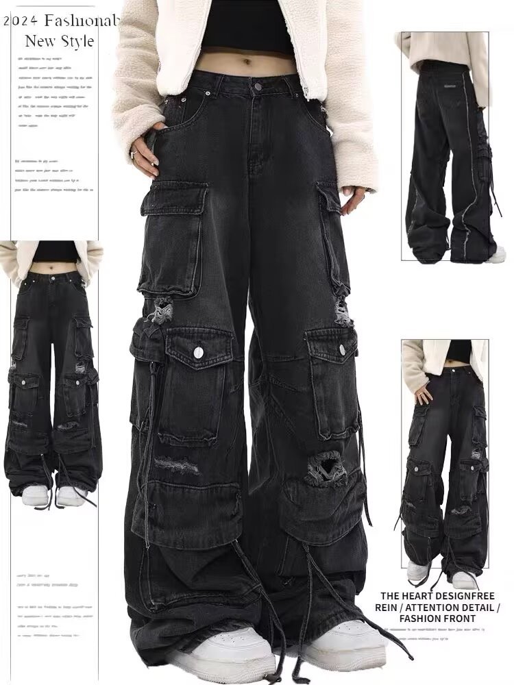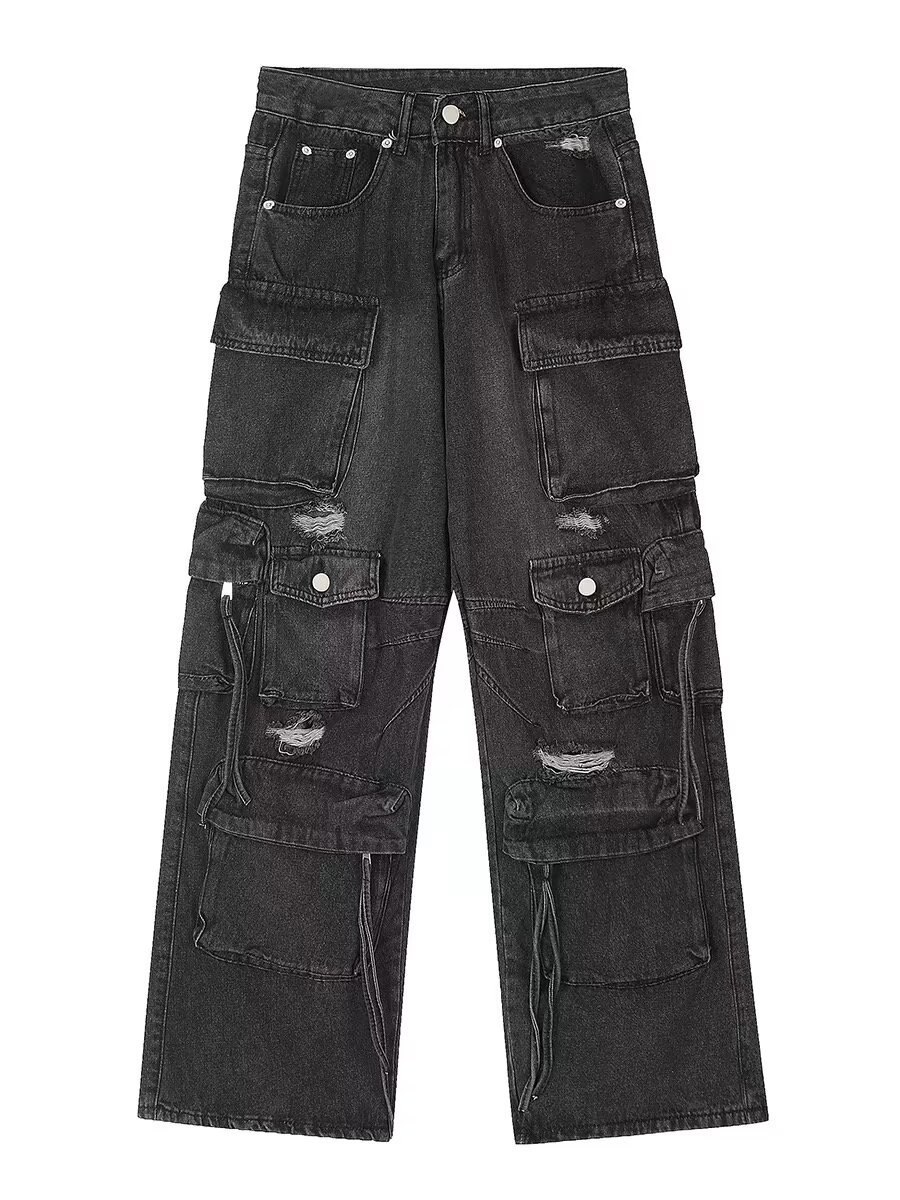 아메리칸 스타일 하이 스트리트 팬츠 중공업 리핑 멀티 포켓 청바지 남성용 루즈 스트레이트 툴링 와이드 레그 팬츠스토어 가기
