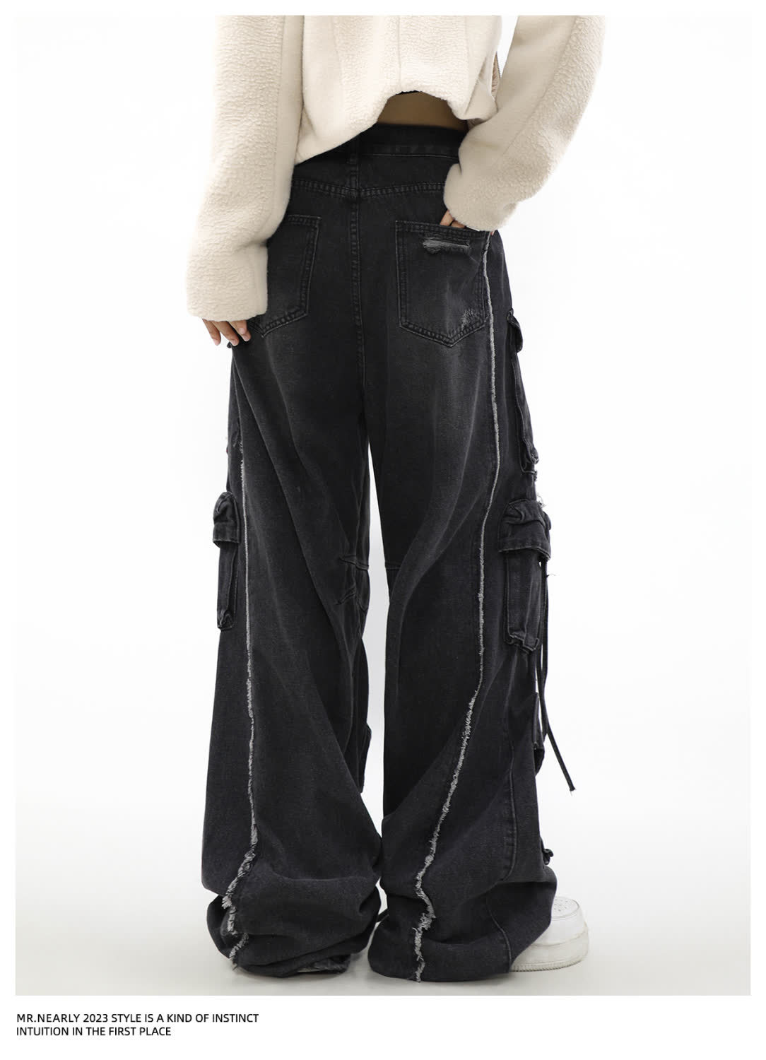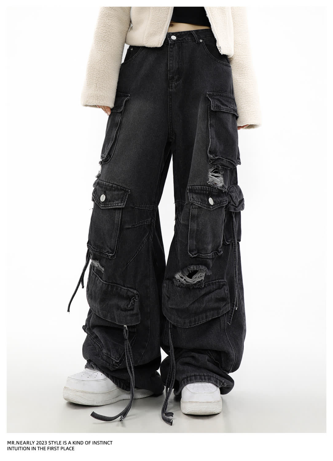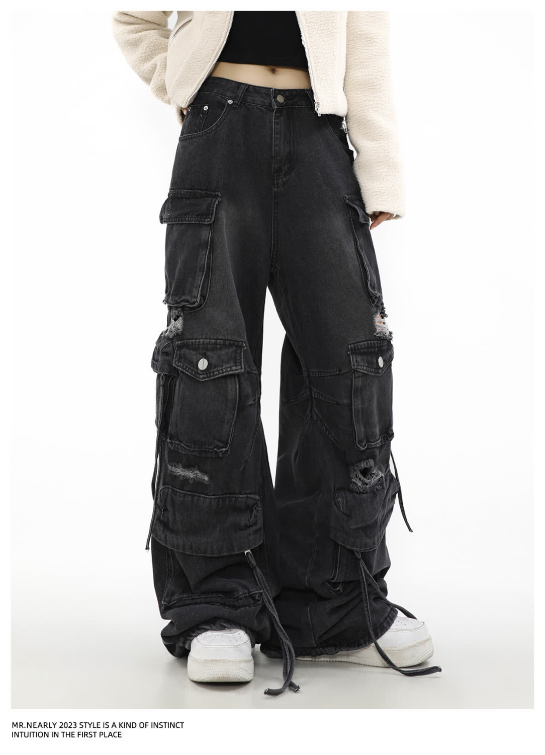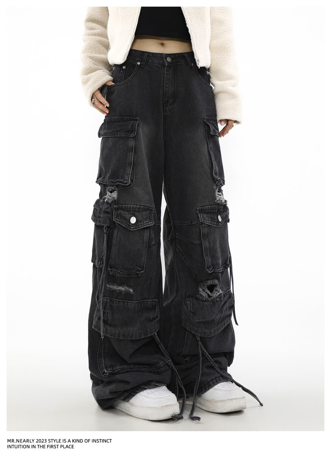 아메리칸 스타일 하이 스트리트 팬츠 중공업 리핑 멀티 포켓 청바지 남성용 루즈 스트레이트 툴링 와이드 레그 팬츠스토어 가기