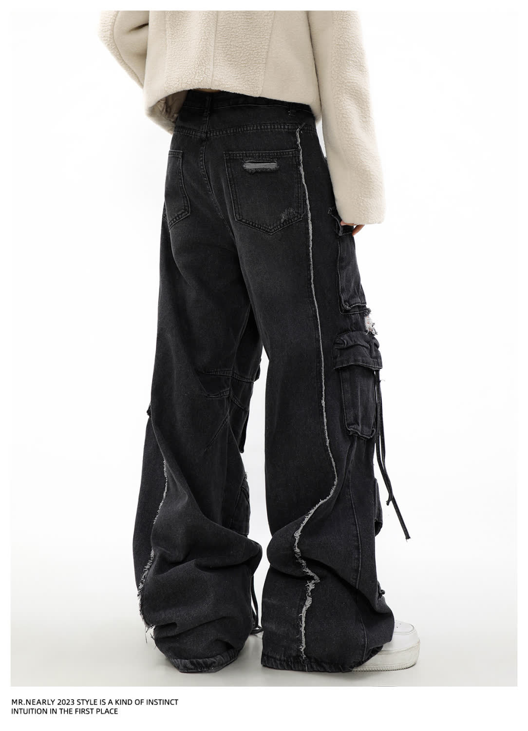 아메리칸 스타일 하이 스트리트 팬츠 중공업 리핑 멀티 포켓 청바지 남성용 루즈 스트레이트 툴링 와이드 레그 팬츠