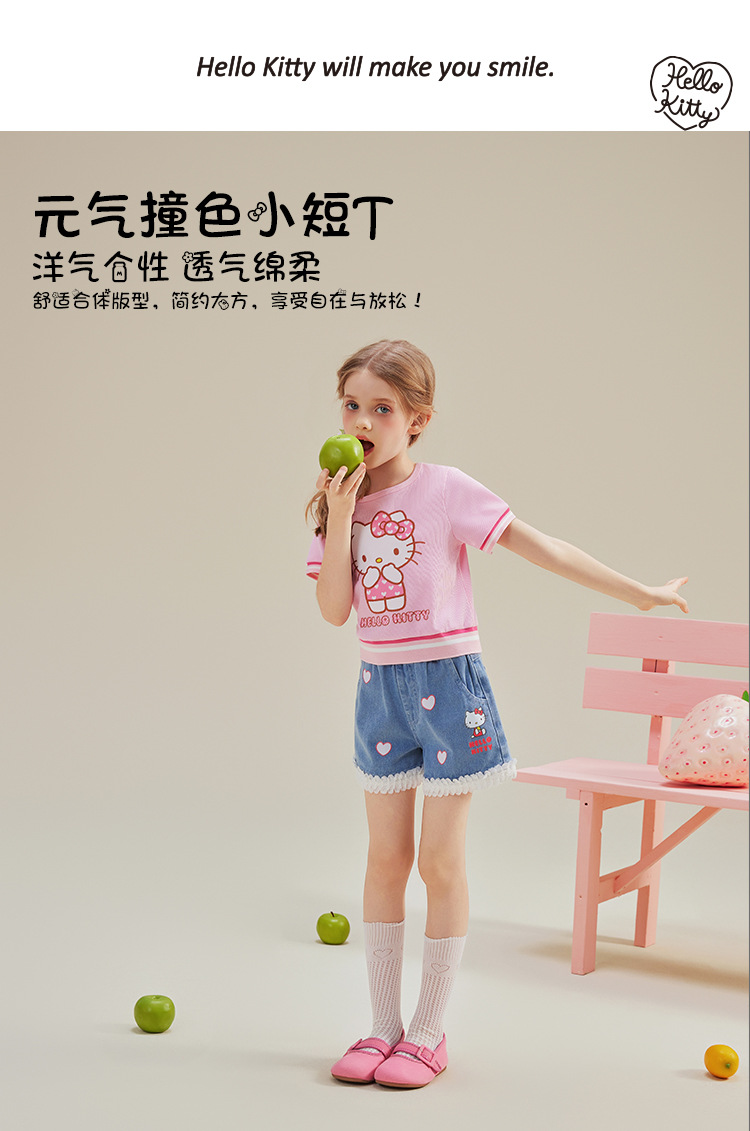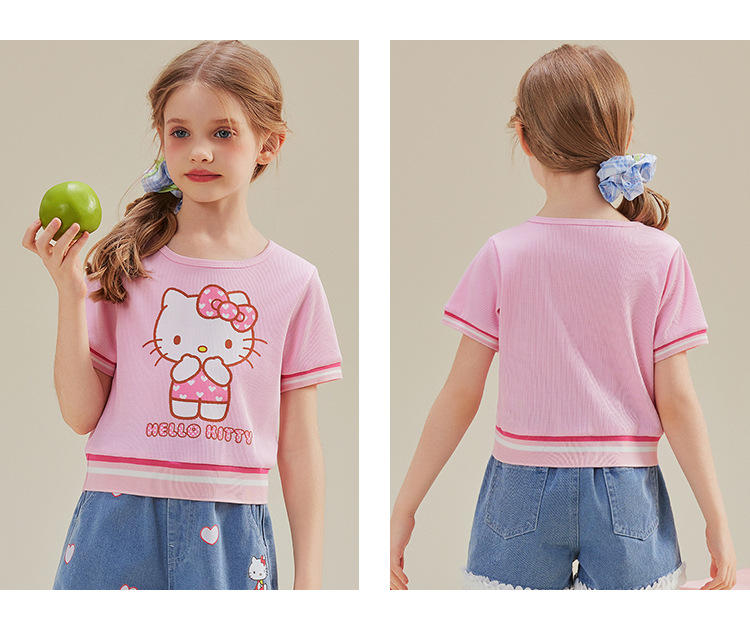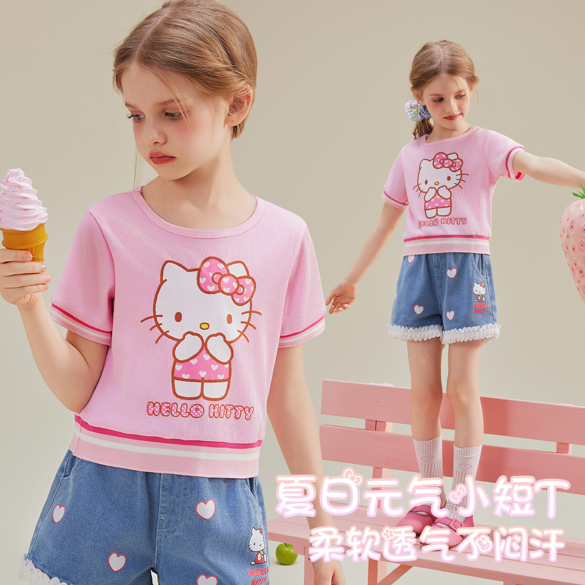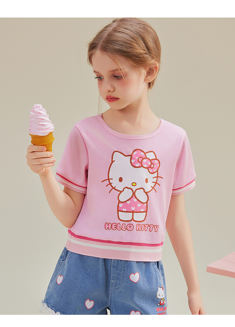 소녀 여름 반팔 티셔츠 2025 새로운 헬로 키티 인쇄 외국 스타일 대비 컬러 미디어와 대형 아동복 작은 짧은 T스토어 가기