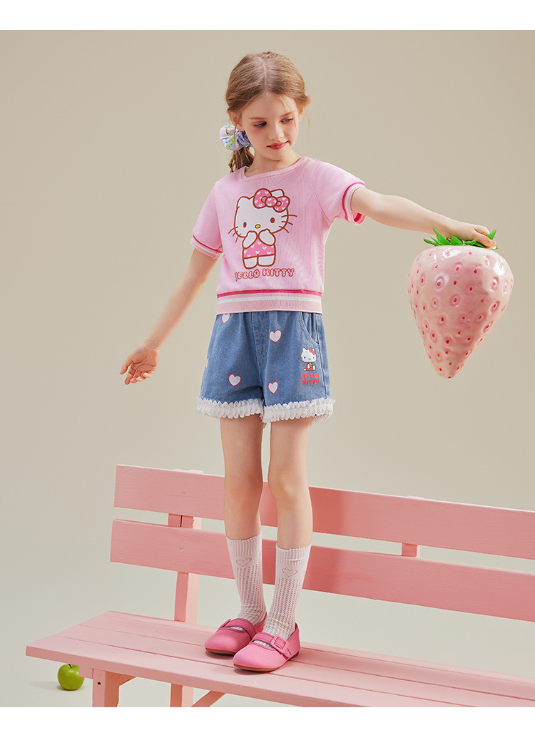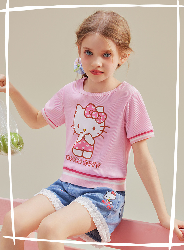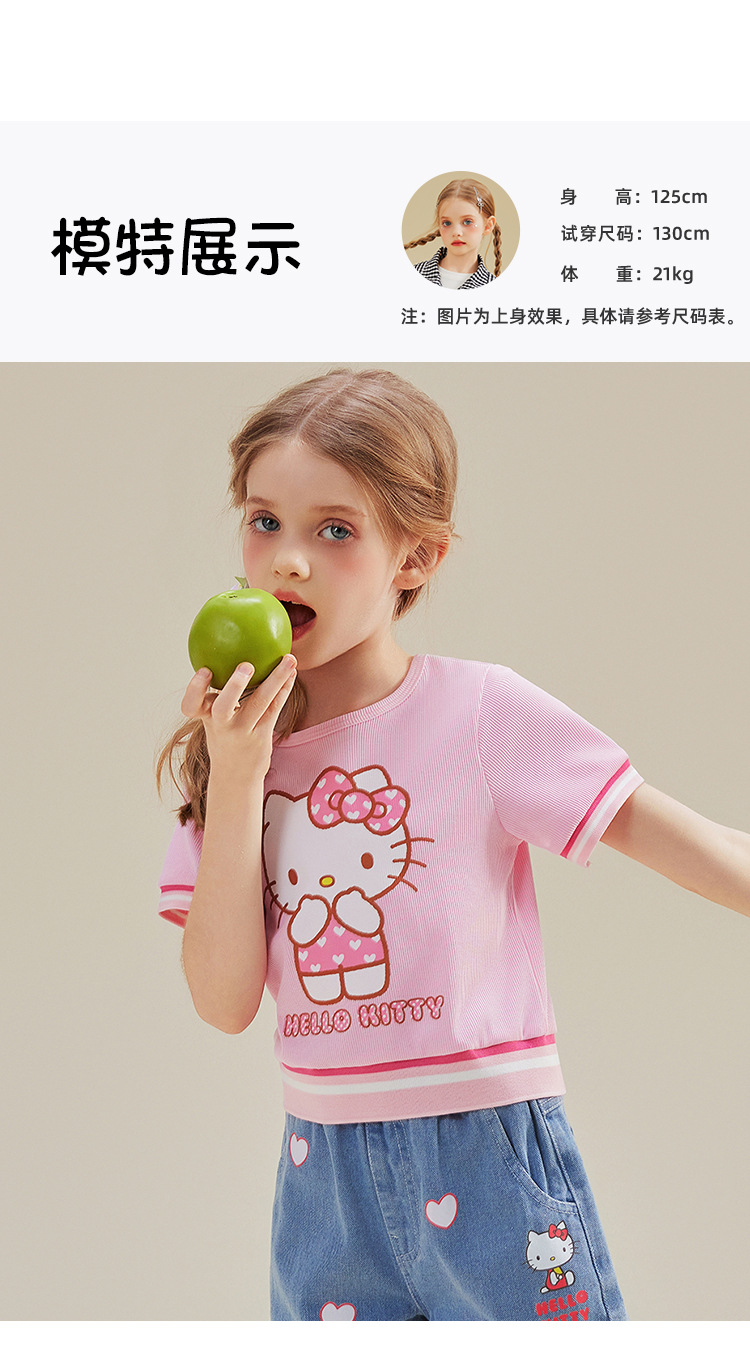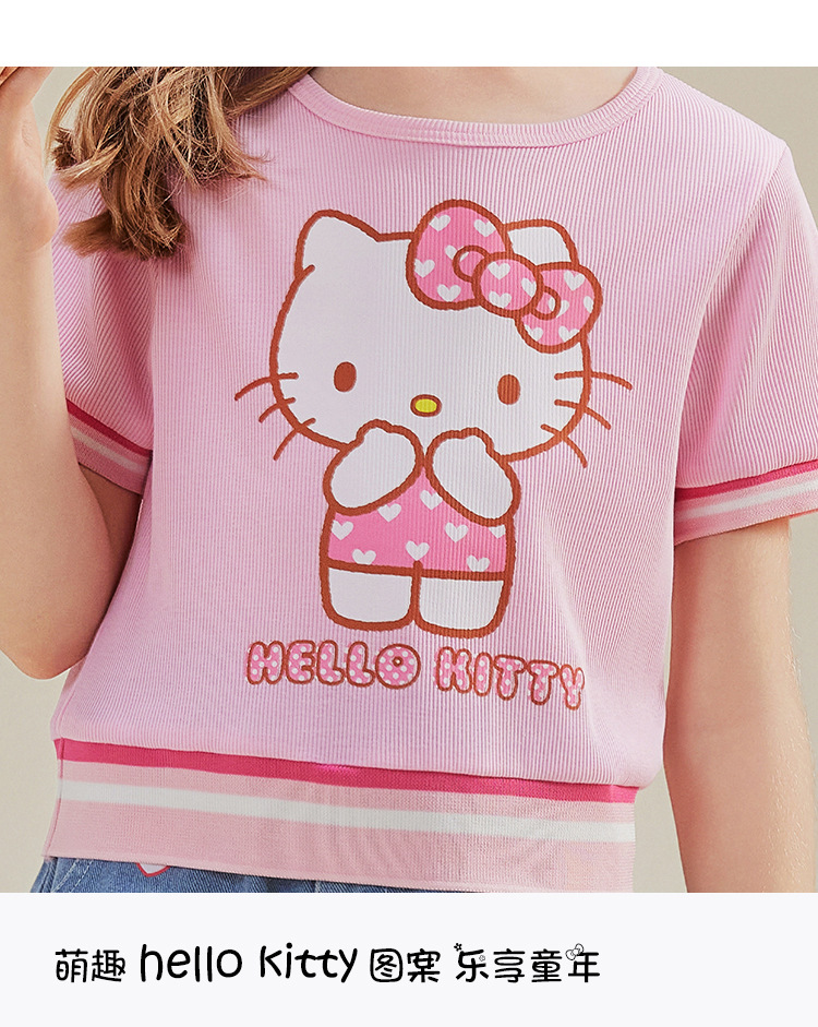 소녀 여름 반팔 티셔츠 2025 새로운 헬로 키티 인쇄 외국 스타일 대비 컬러 미디어와 대형 아동복 작은 짧은 T스토어 가기