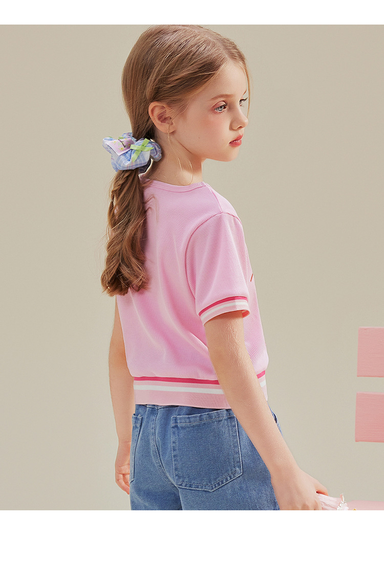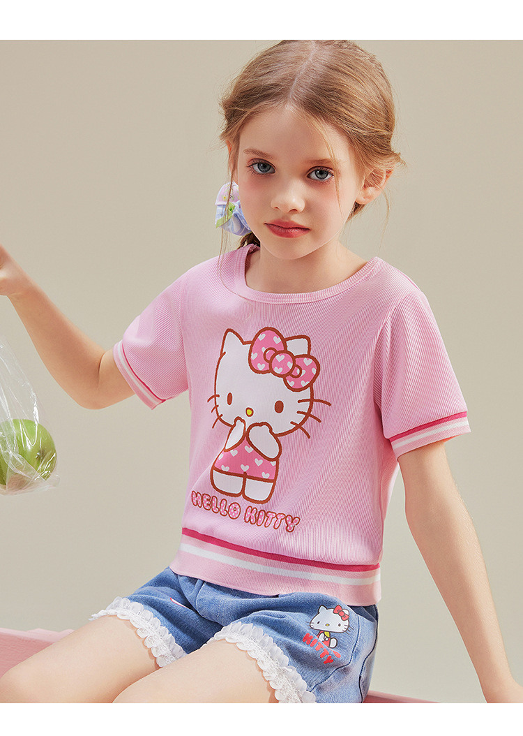 소녀 여름 반팔 티셔츠 2025 새로운 헬로 키티 인쇄 외국 스타일 대비 컬러 미디어와 대형 아동복 작은 짧은 T