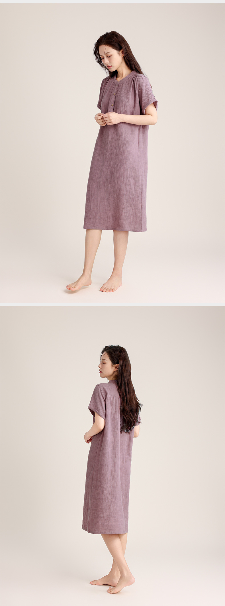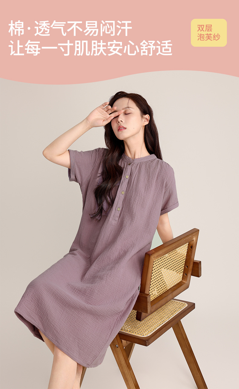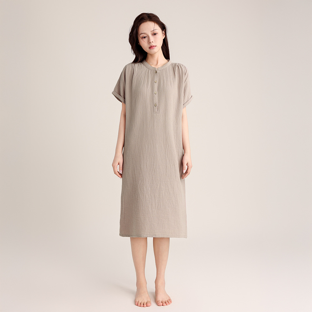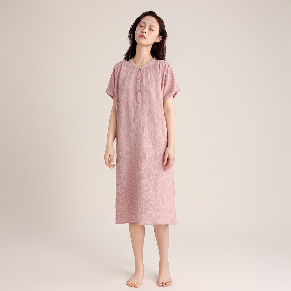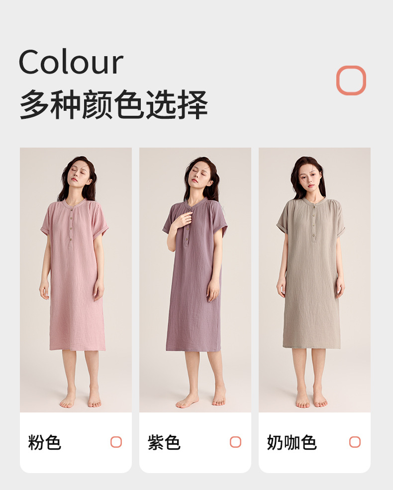 봄과 여름 반팔 나이트가운 더블 레이어 크레페 풀오버 여성의 간단한 긴 원피스 면 얇은 겉옷스토어 가기
