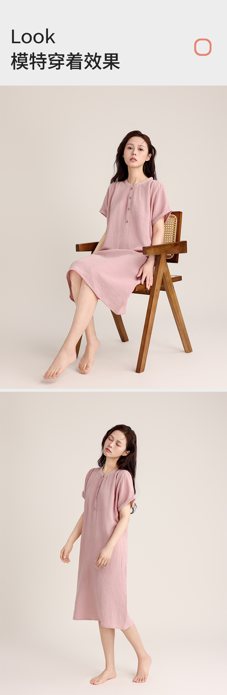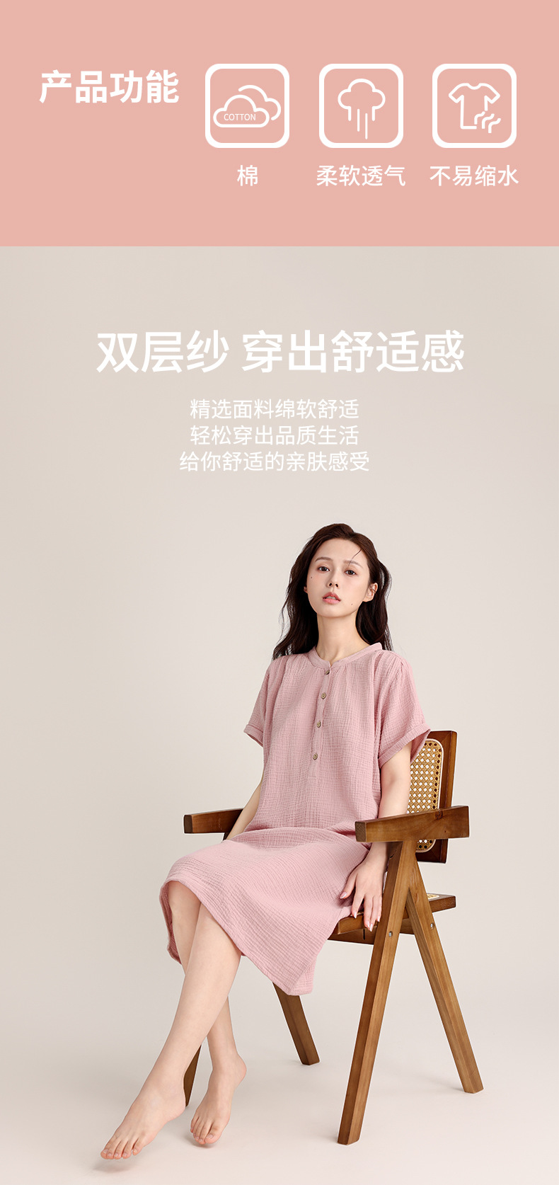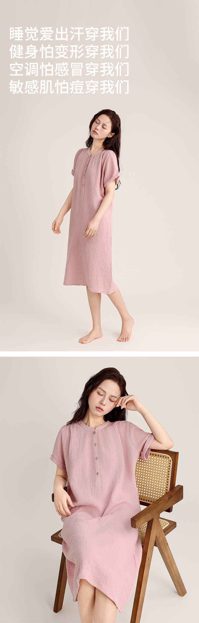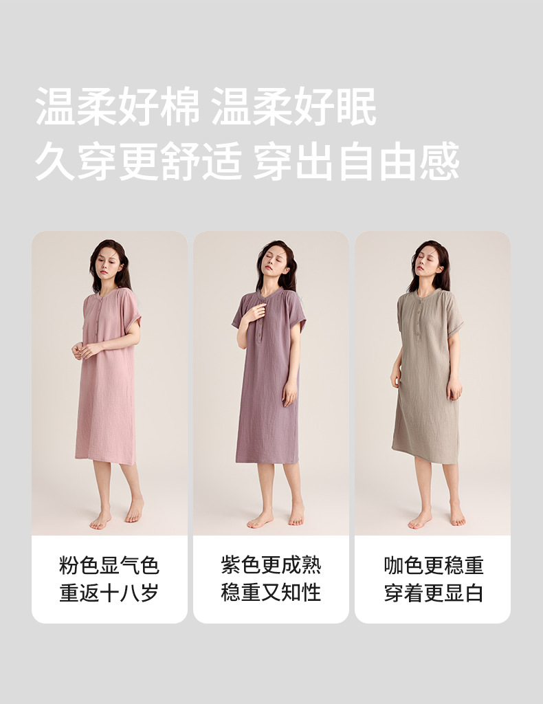 봄과 여름 반팔 나이트가운 더블 레이어 크레페 풀오버 여성의 간단한 긴 원피스 면 얇은 겉옷스토어 가기