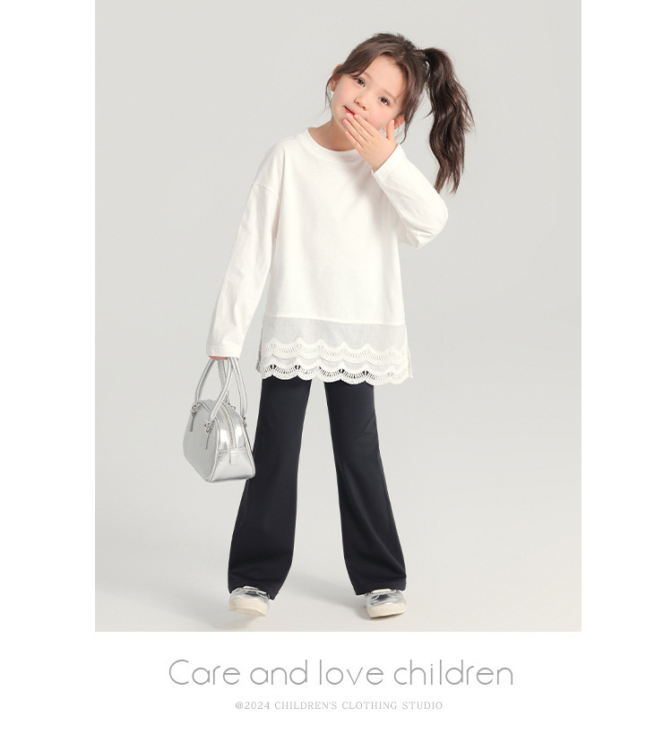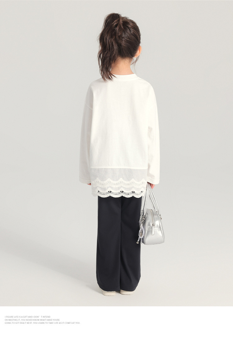 2025 봄 새로운 스타일 여자 바닥 셔츠 어린이 레이스 라운드 넥 티셔츠 유행 다목적 아기 소녀 긴 소매