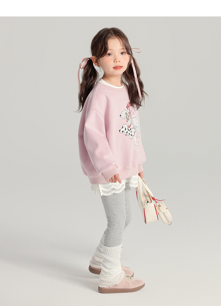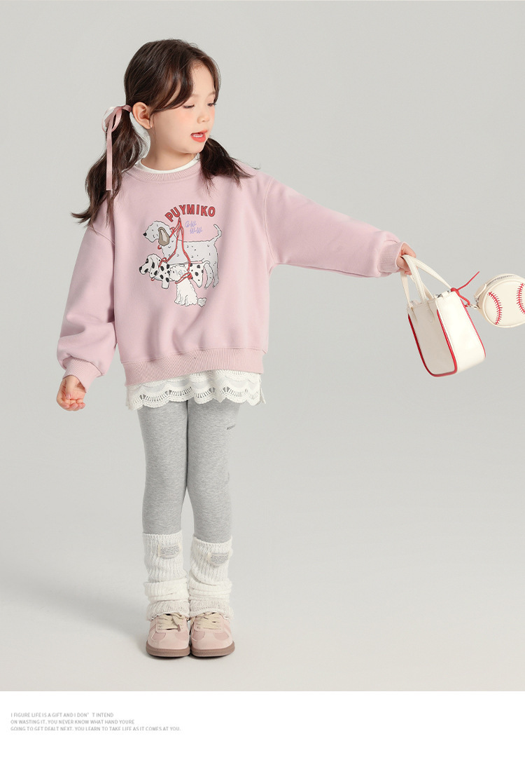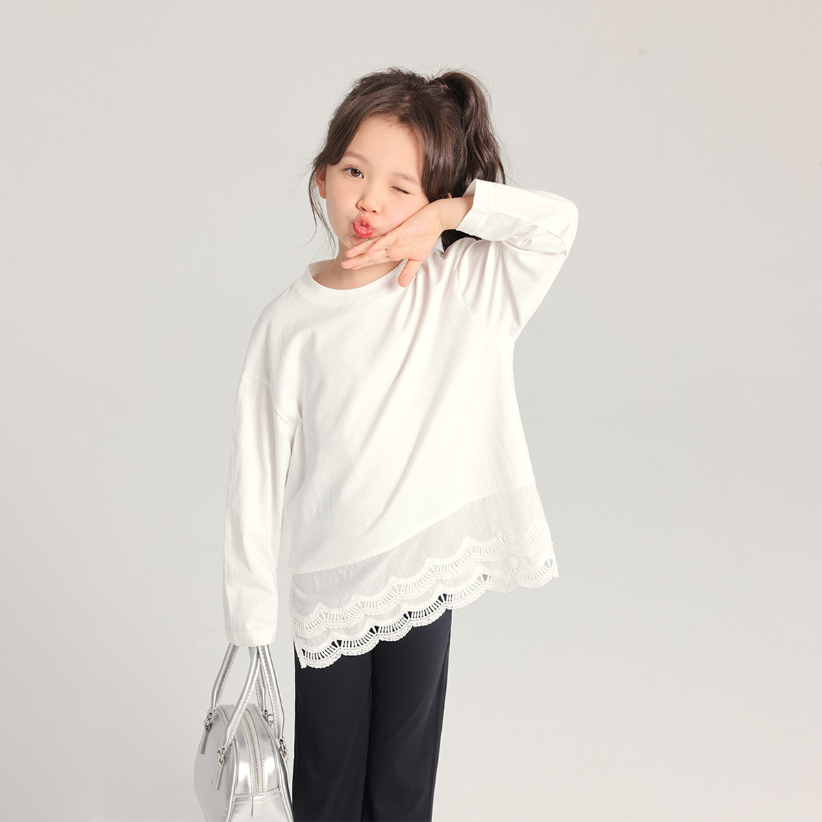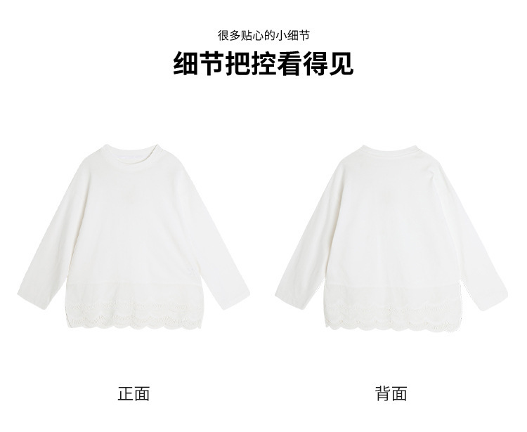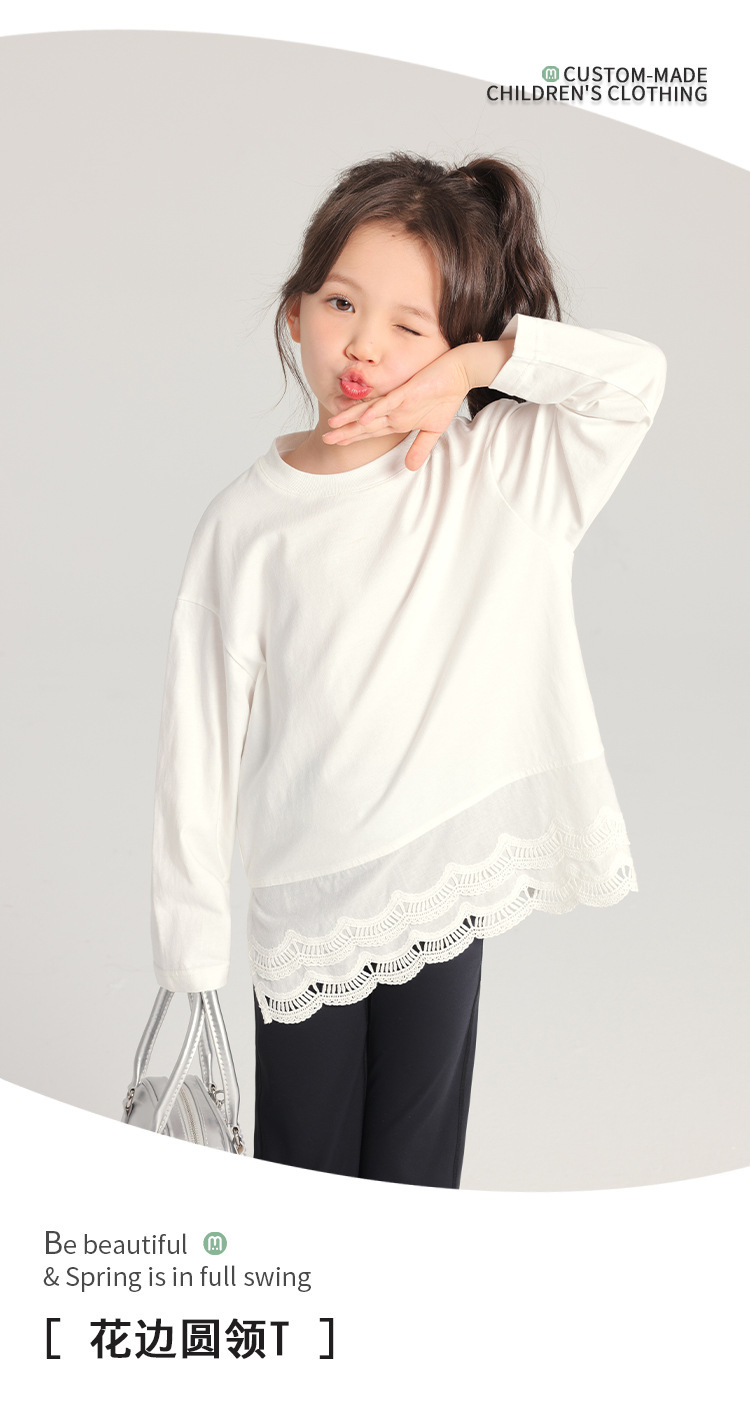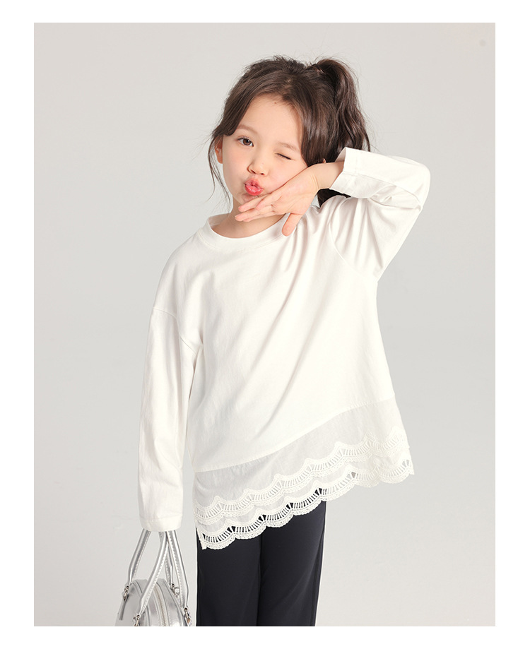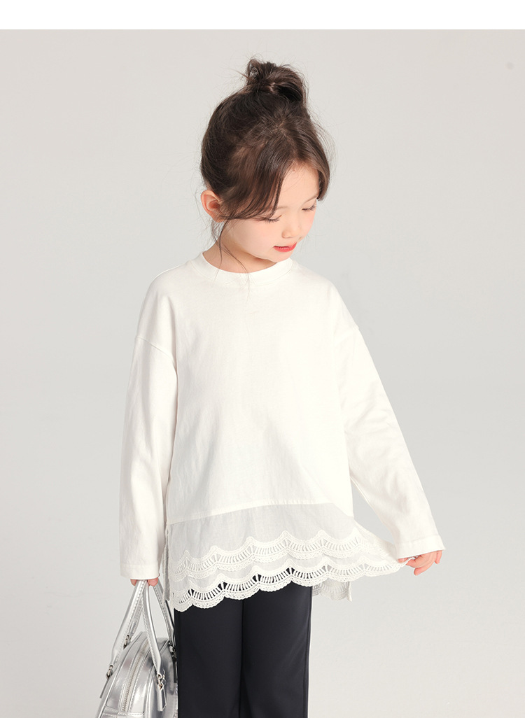 2025 봄 새로운 스타일 여자 바닥 셔츠 어린이 레이스 라운드 넥 티셔츠 유행 다목적 아기 소녀 긴 소매스토어 가기