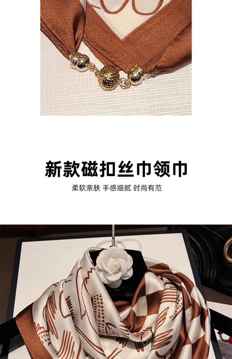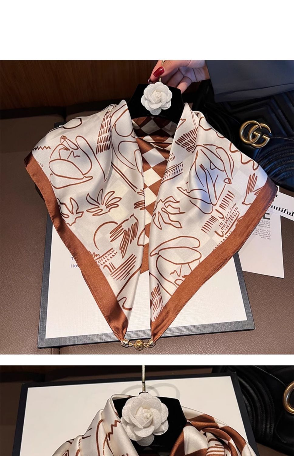 • 모조 실크 자석 버클 스퀘어 스카프 - 밀크 커피 꽃