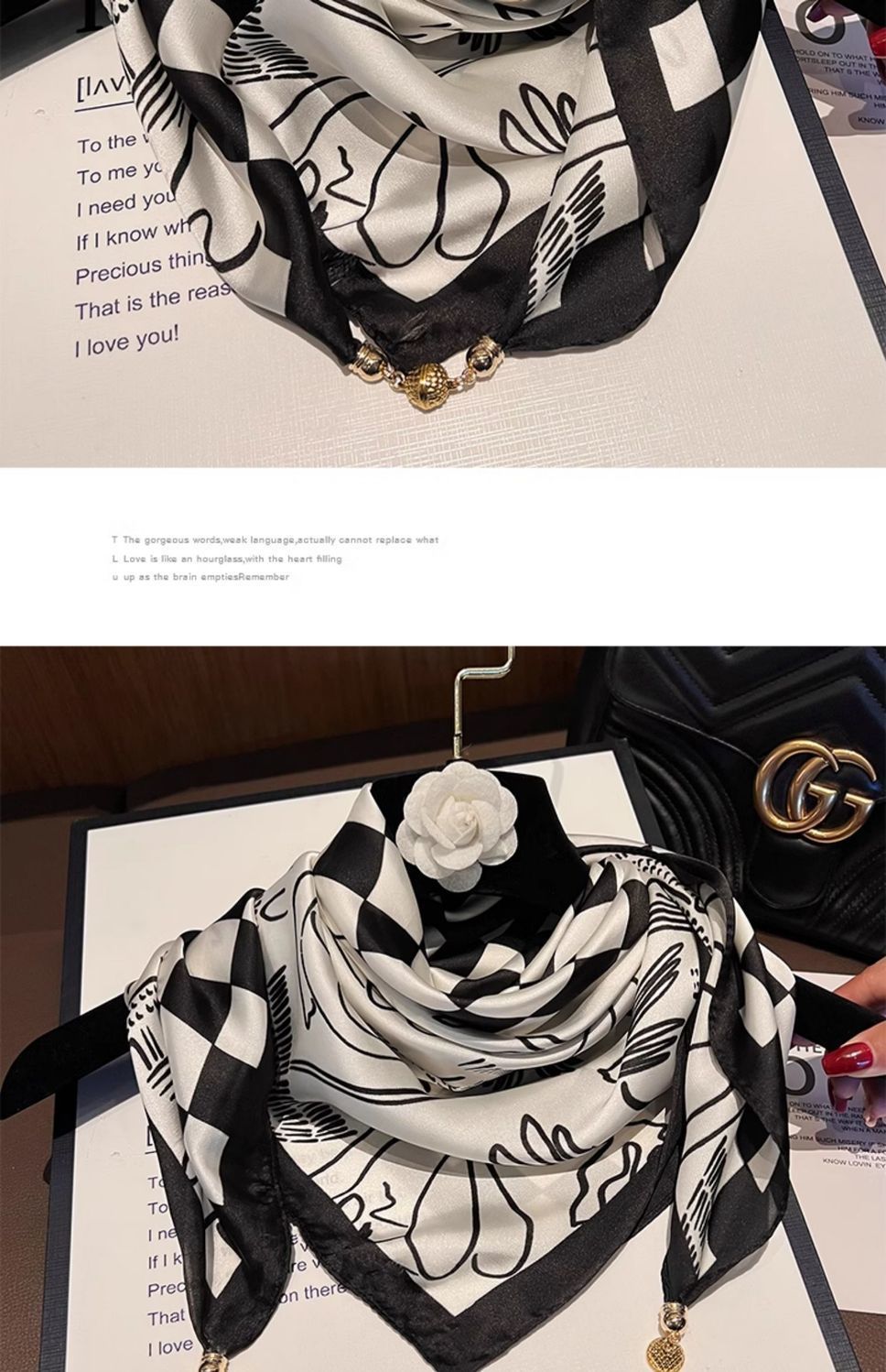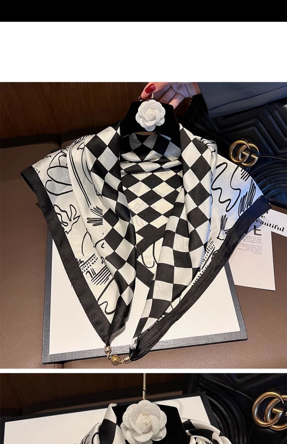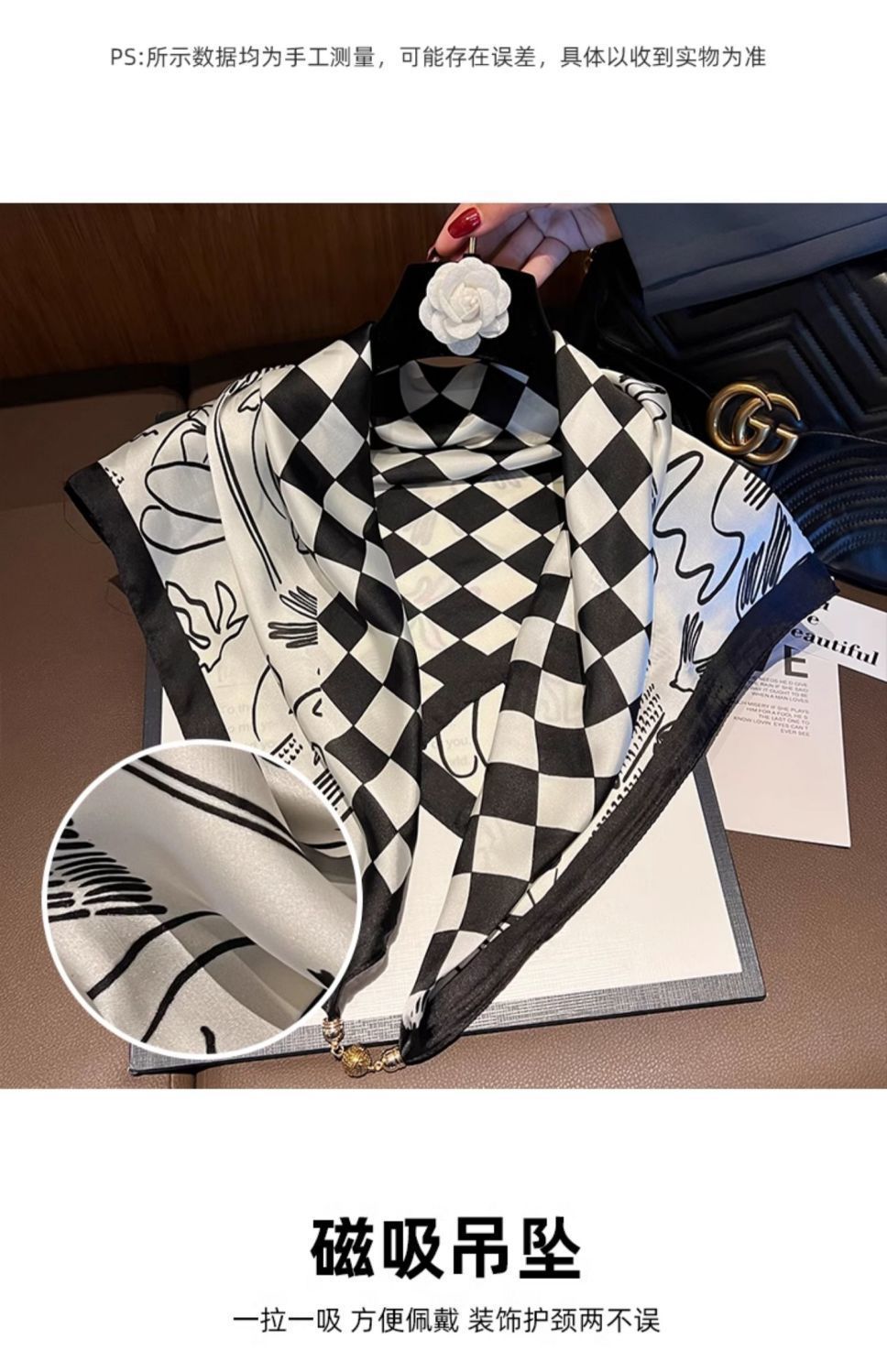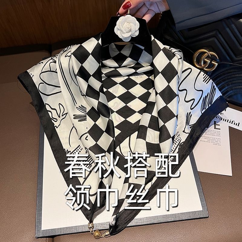 • 시뮬레이션 실크 자석 버클 스퀘어 스카프 - 흑백 체커보드 패턴
