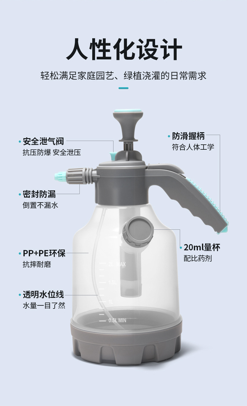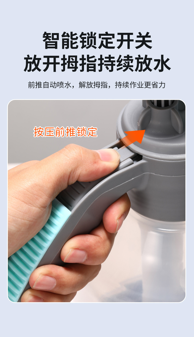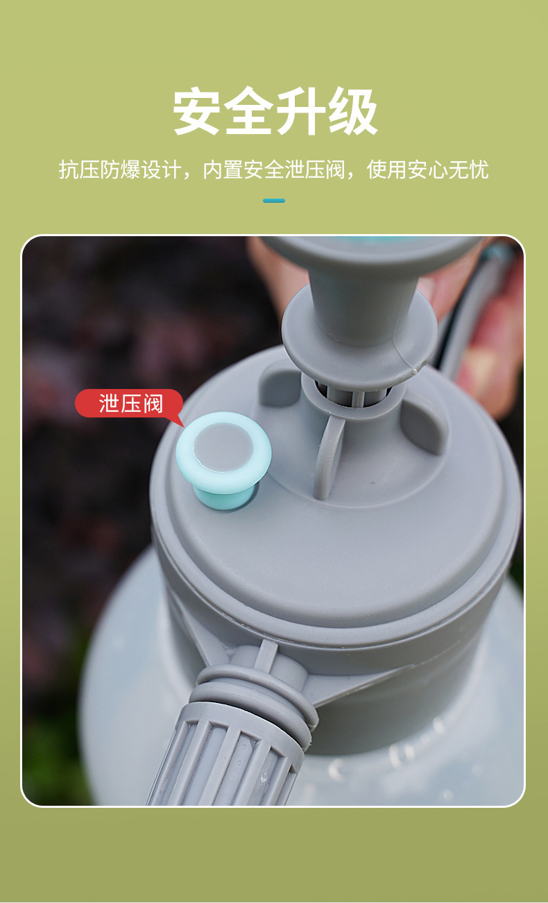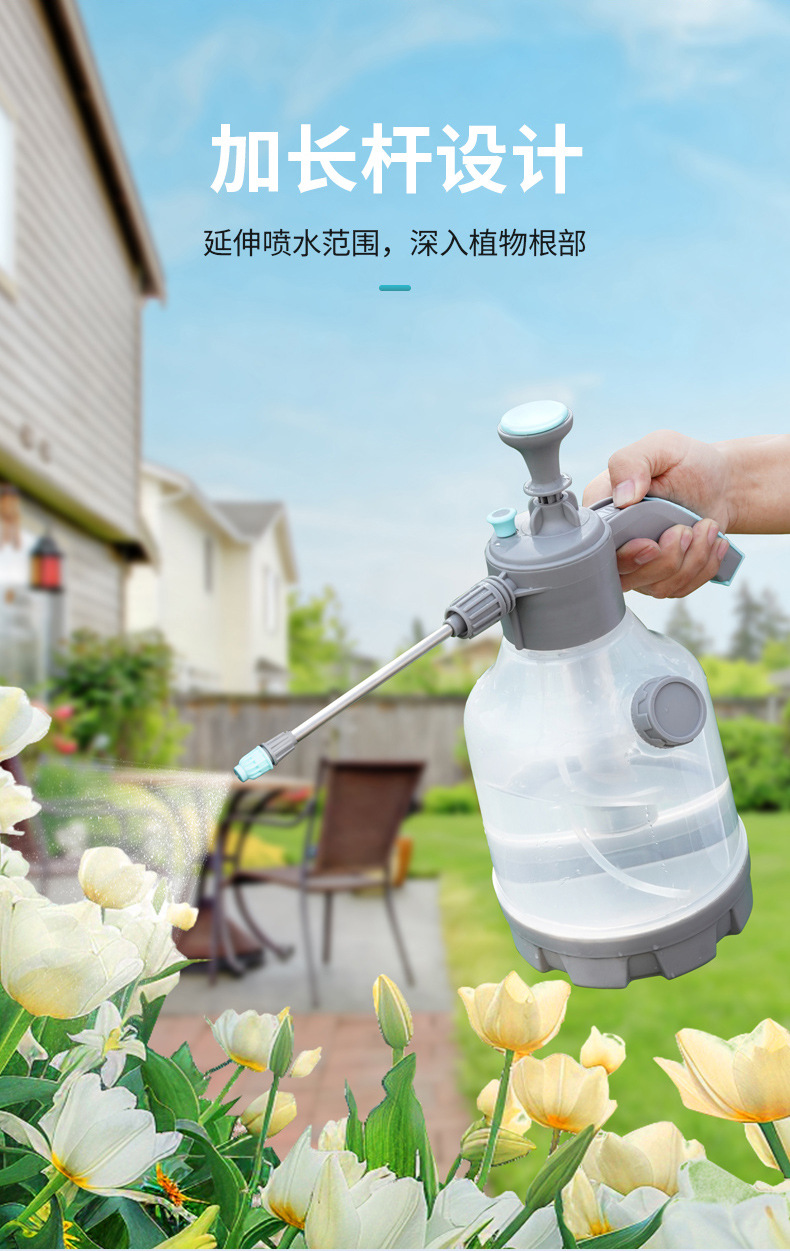 【产品特点】:1、PE料,加厚瓶身2、人性化手柄更舒适3、铝氧化拉杆,防止压到手指,打压更轻松4、带开关锁,释放双手,实现自动喷洒5、大口径,方便各种水龙头接水