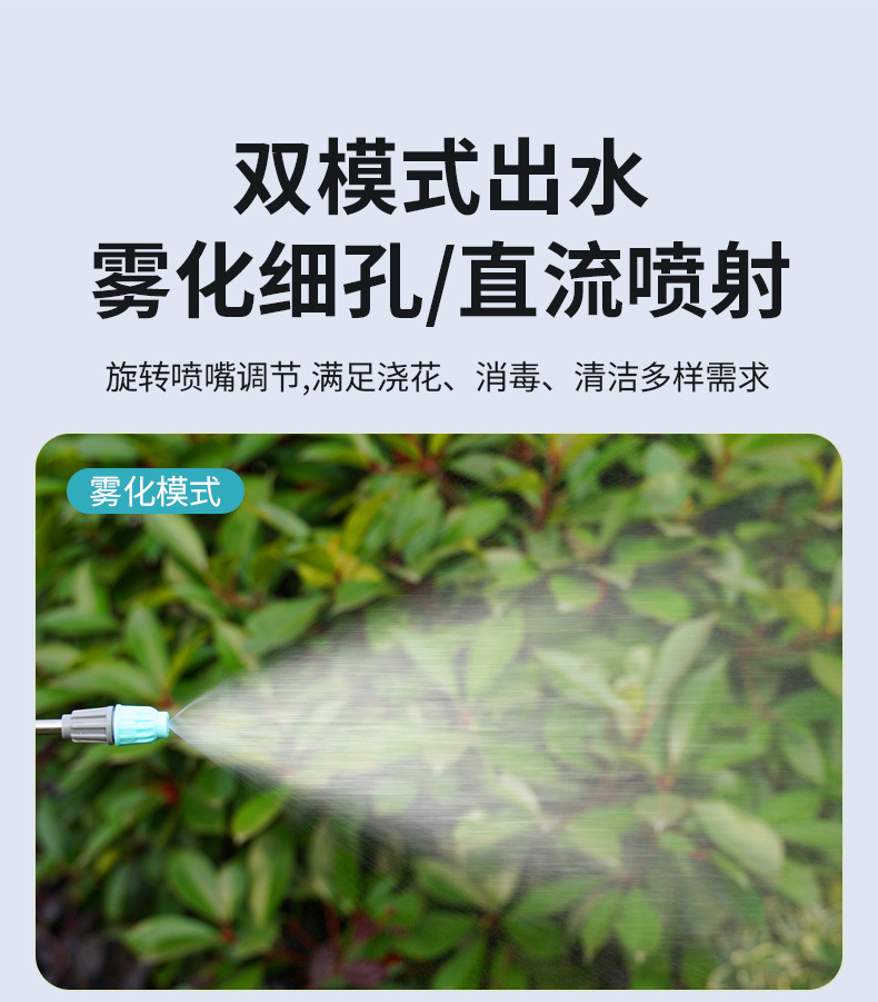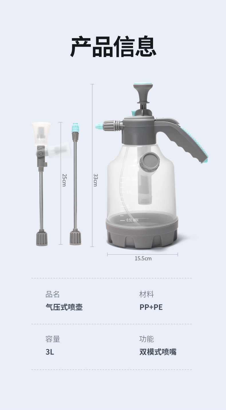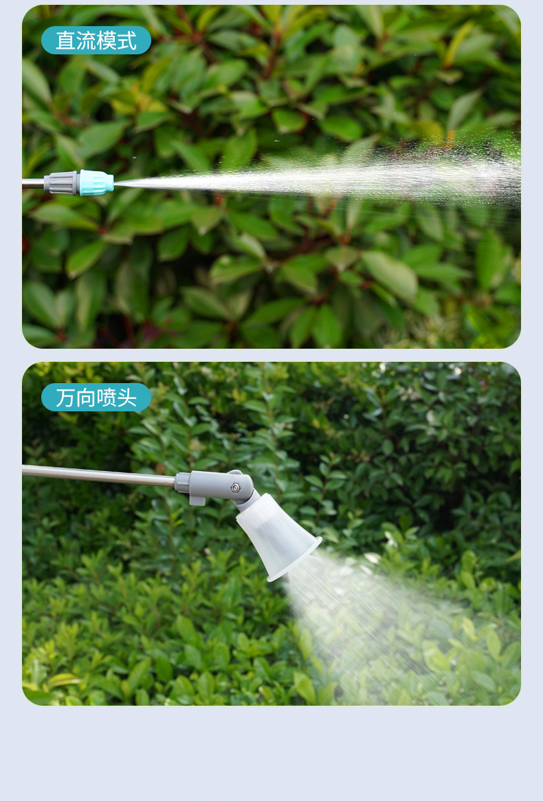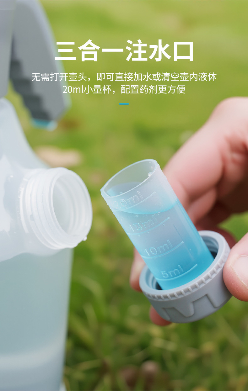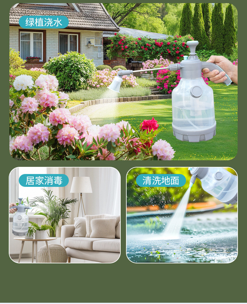 【产品特点】:1、PE料,加厚瓶身2、人性化手柄更舒适3、铝氧化拉杆,防止压到手指,打压更轻松4、带开关锁,释放双手,实现自动喷洒5、大口径,方便各种水龙头接水