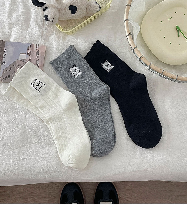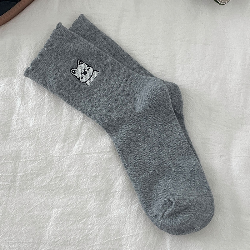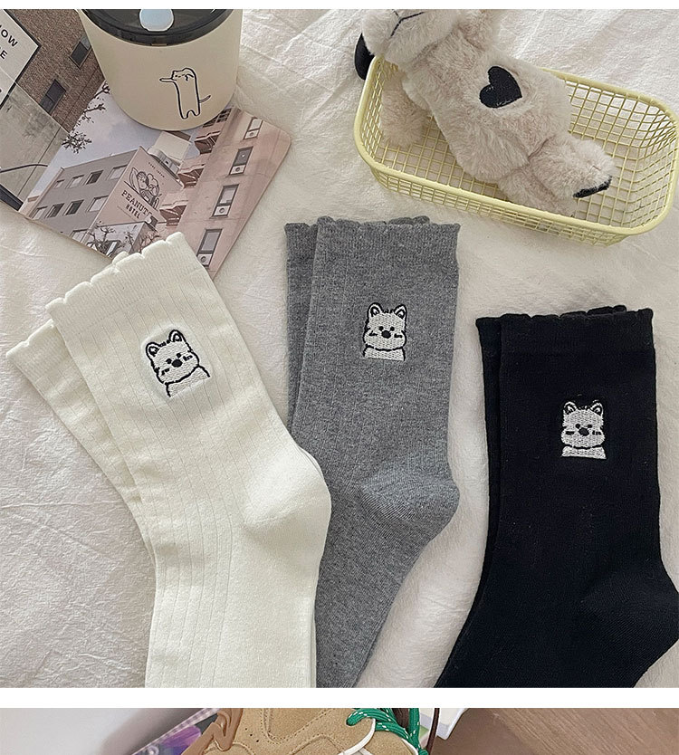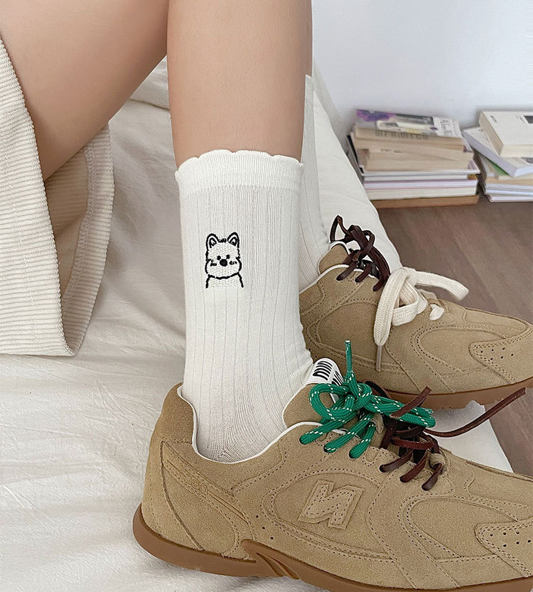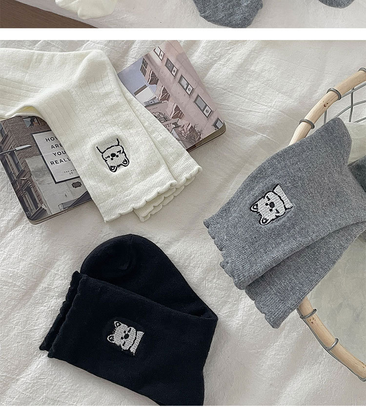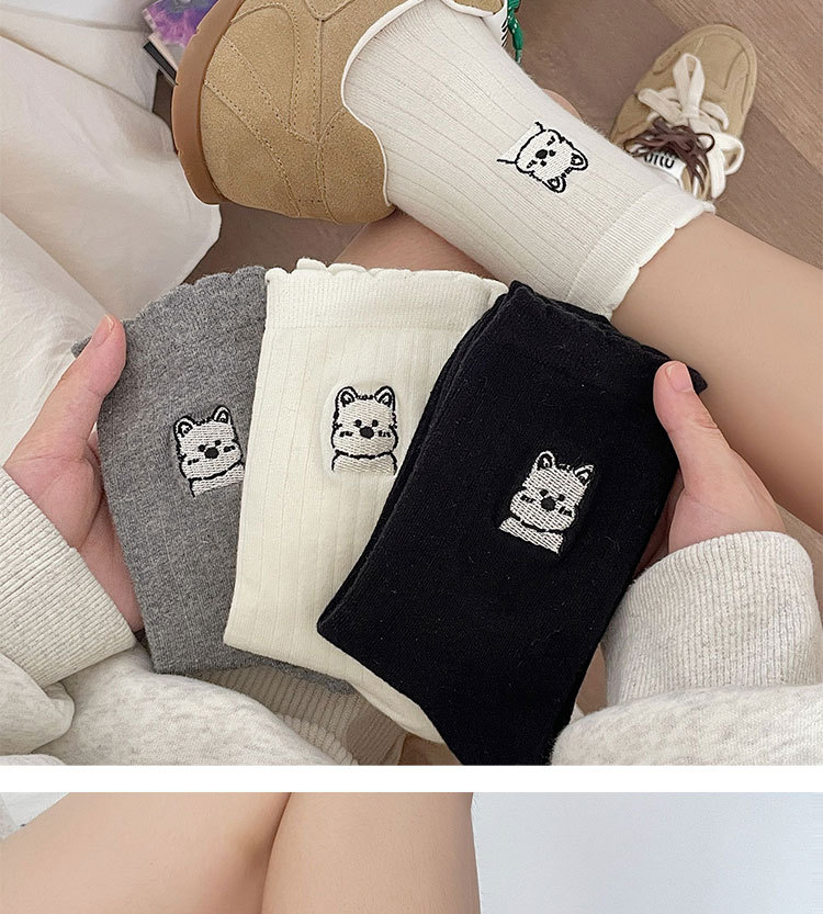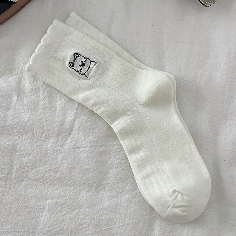 흰색 양말 여성의 중간 길이 양말 봄과 여름 얇은 순수 코튼 뼈없는 일본 스타일 귀여운 만화 자수 강아지 스타킹