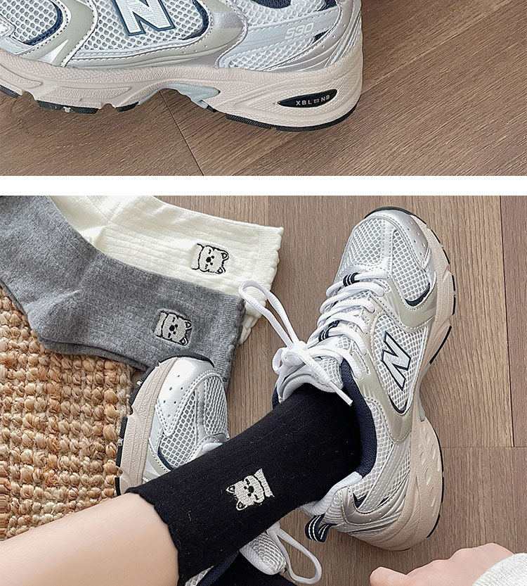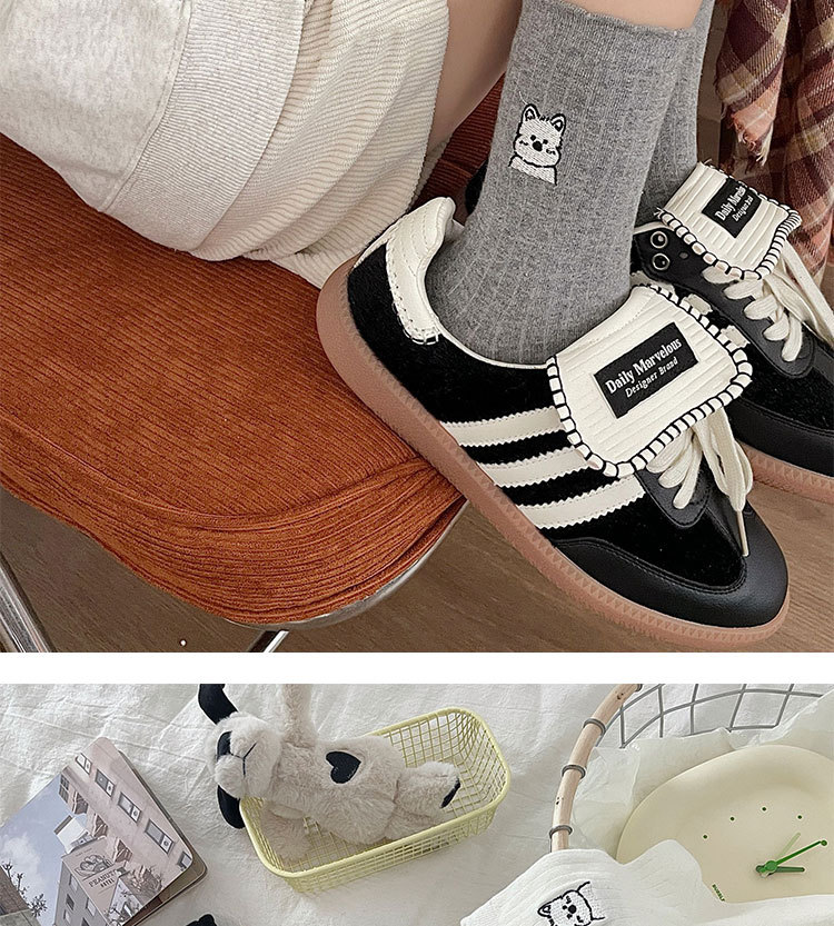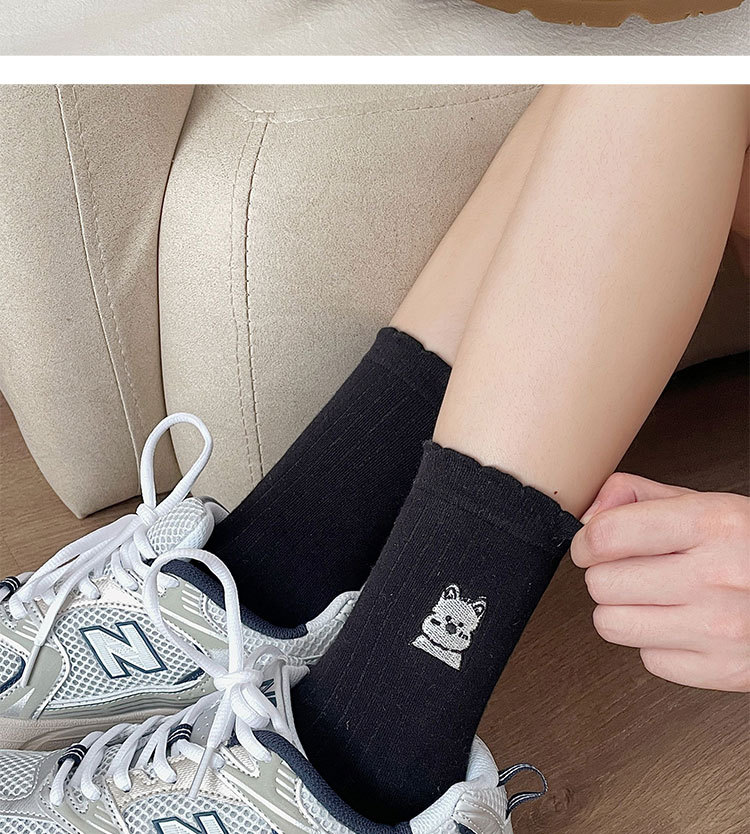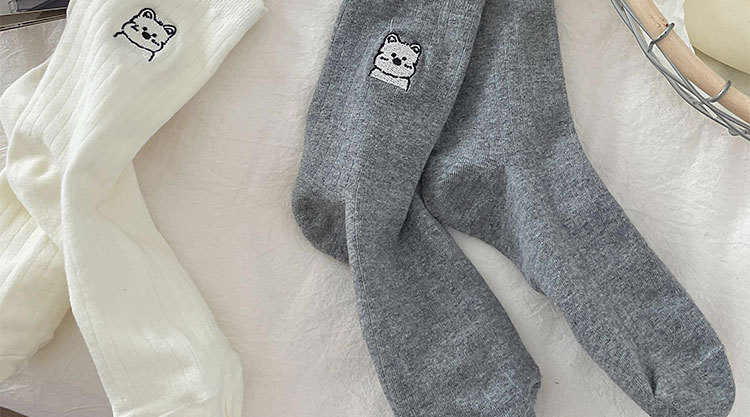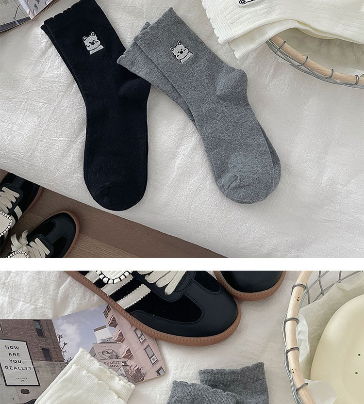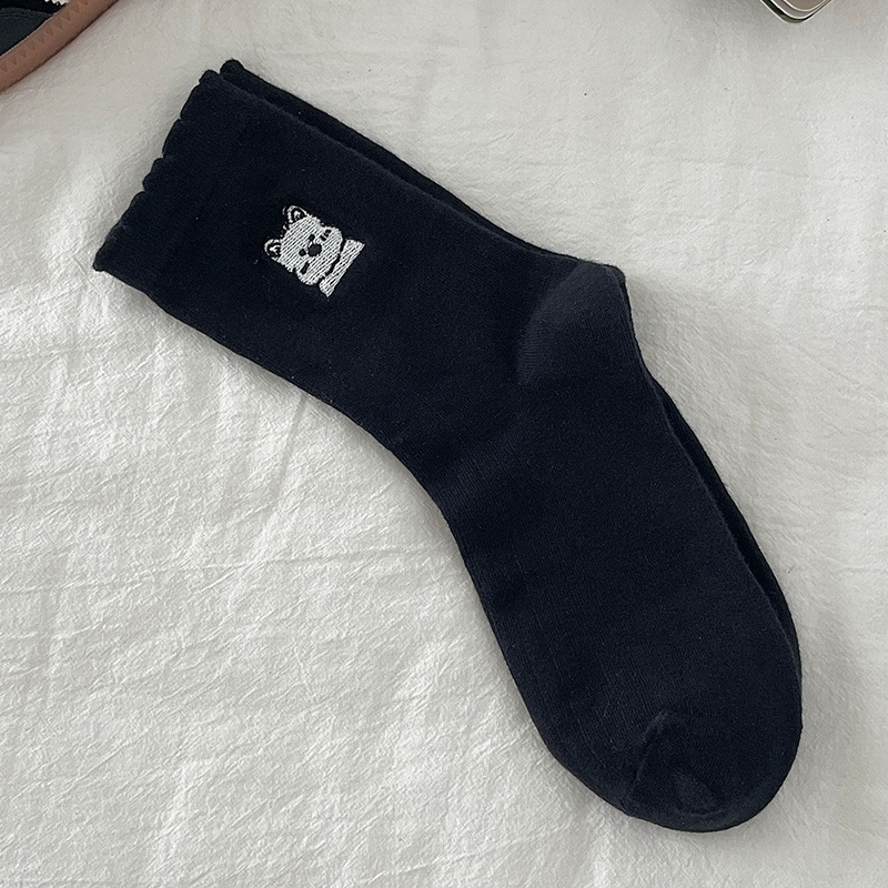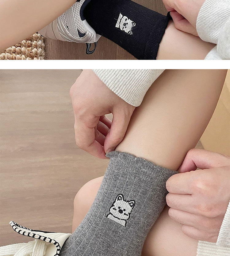 흰색 양말 여성의 중간 길이 양말 봄과 여름 얇은 순수 코튼 뼈없는 일본 스타일 귀여운 만화 자수 강아지 스타킹