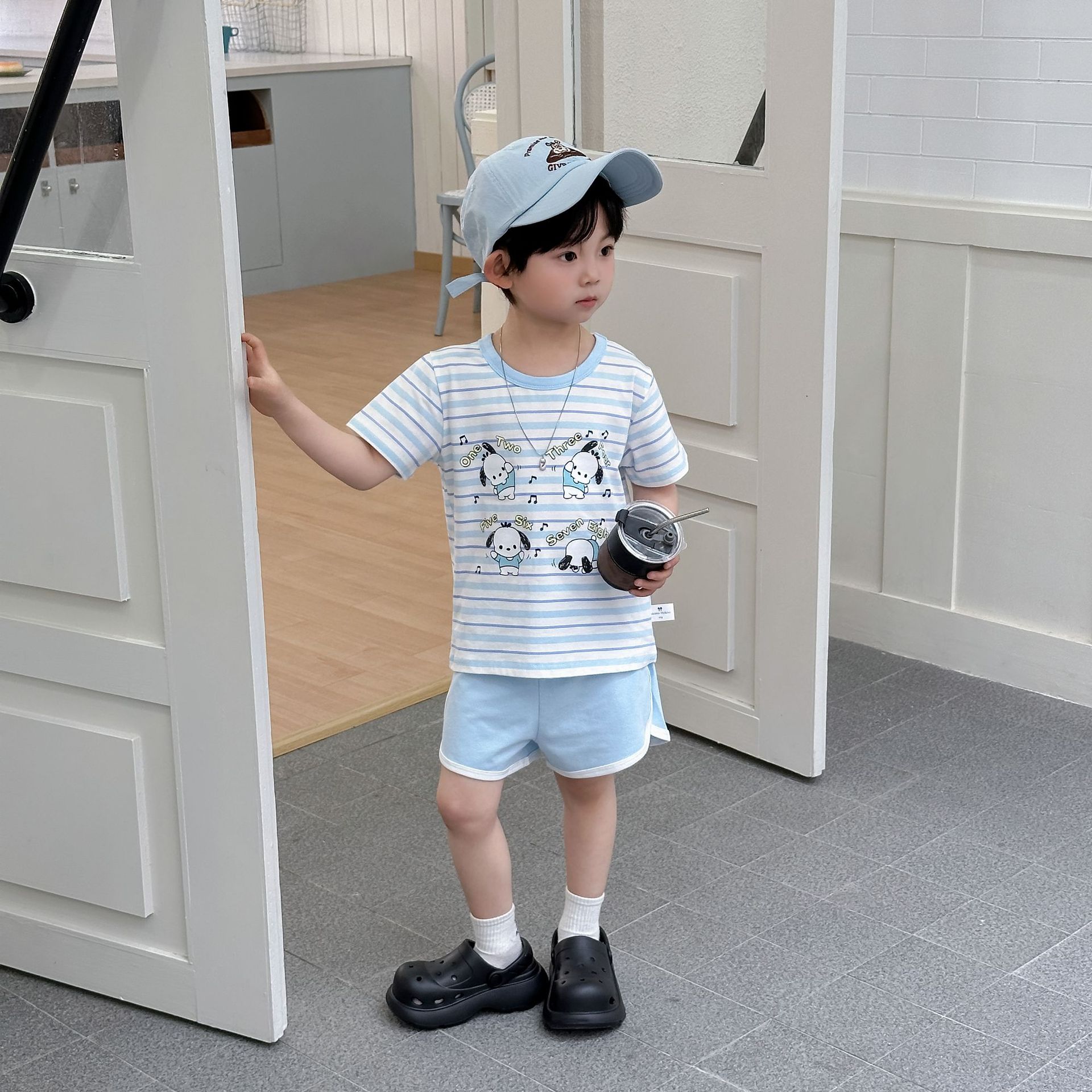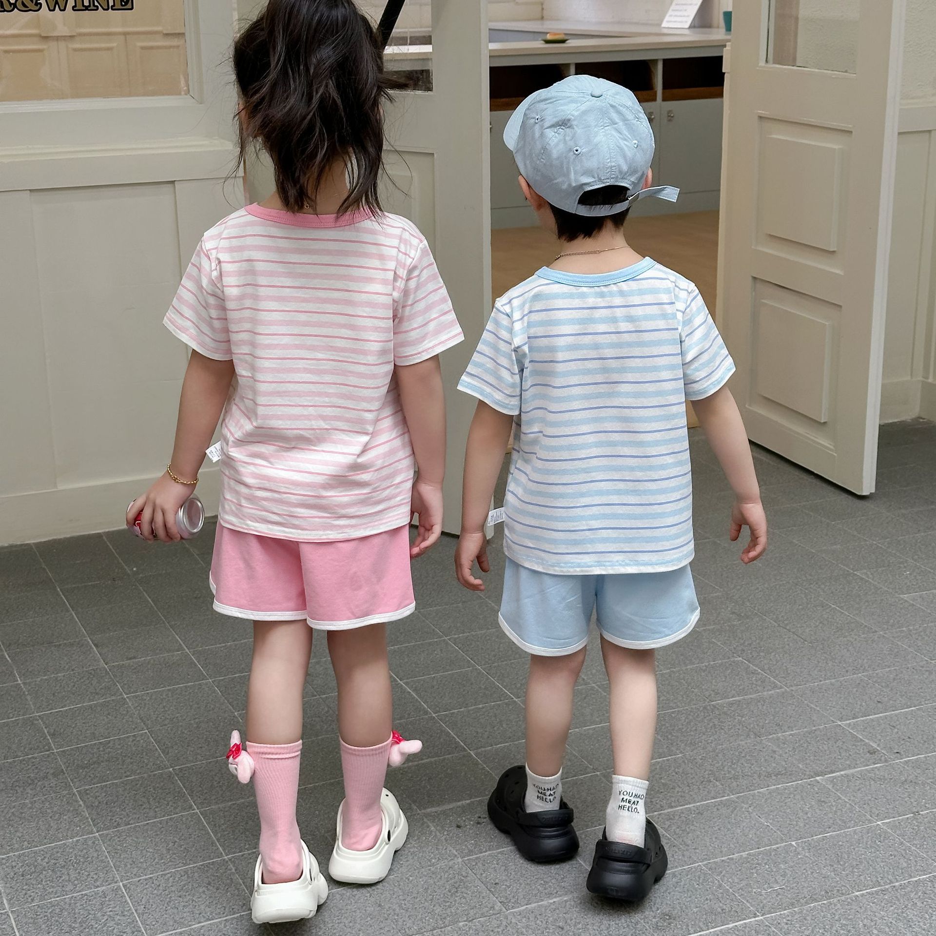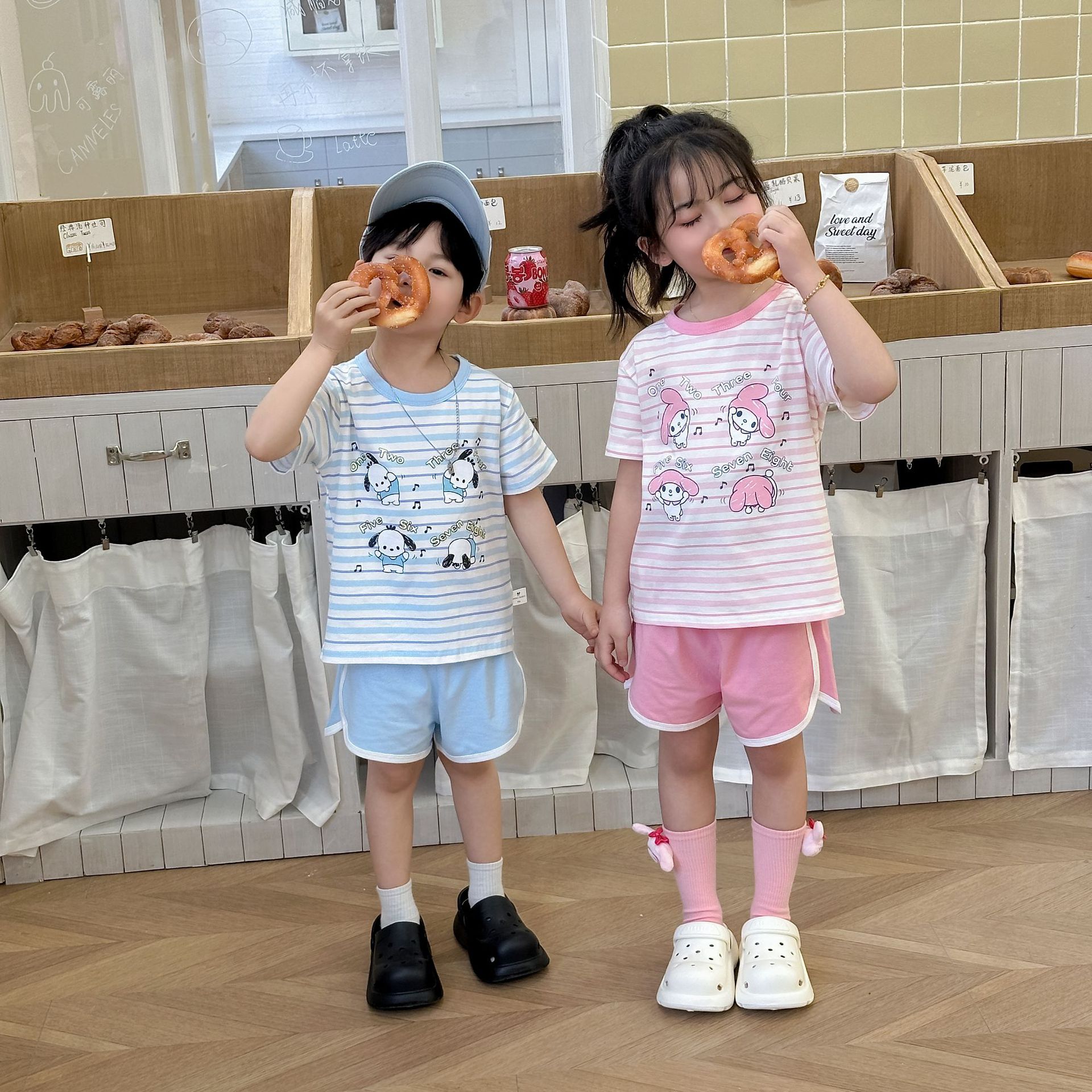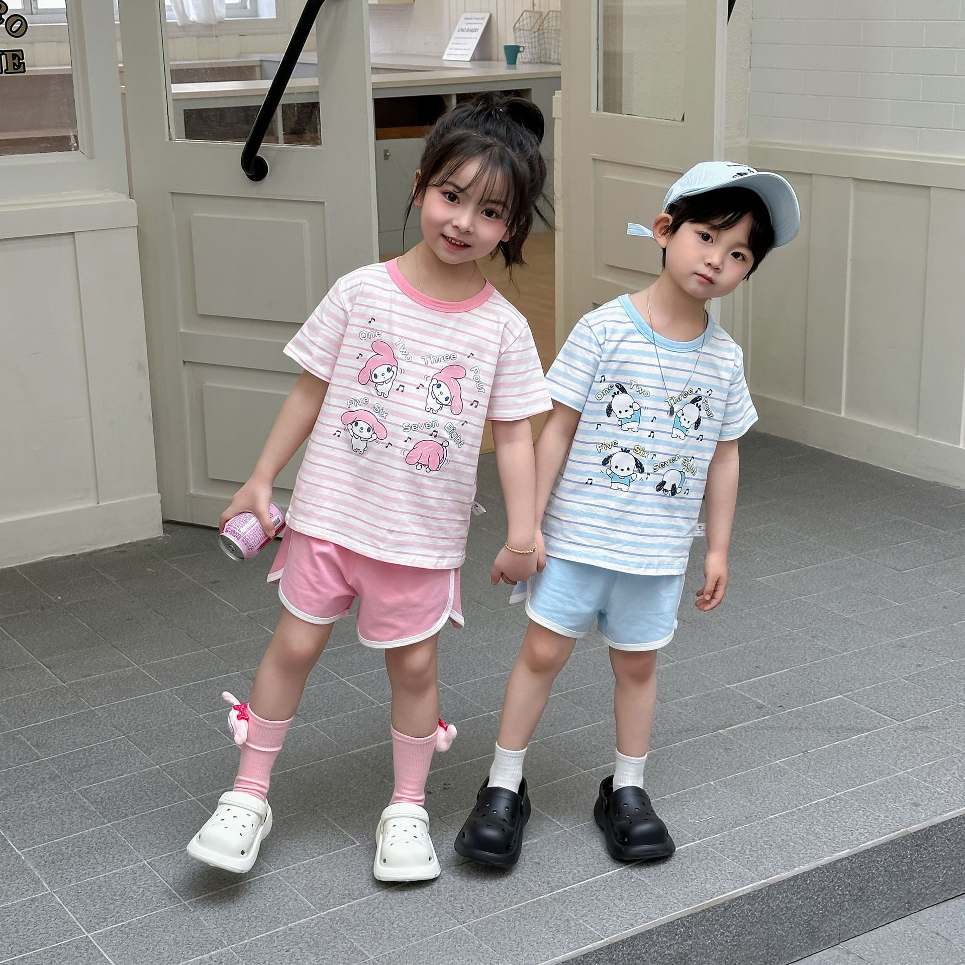 [95 면 라이크라] 새로운 어린이 세트 운동복 짧은 소매 반바지 티셔츠 뜨거운 바지 여름 인쇄 귀여운 25스토어 가기