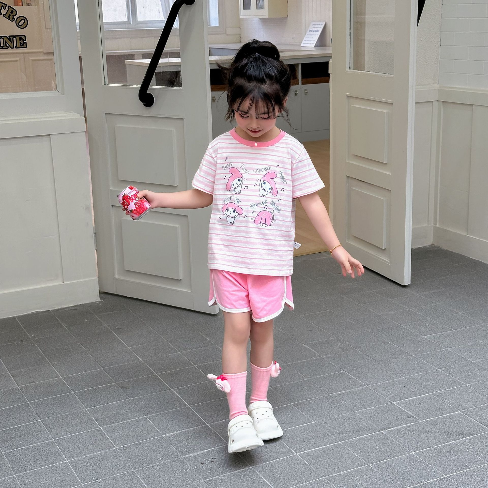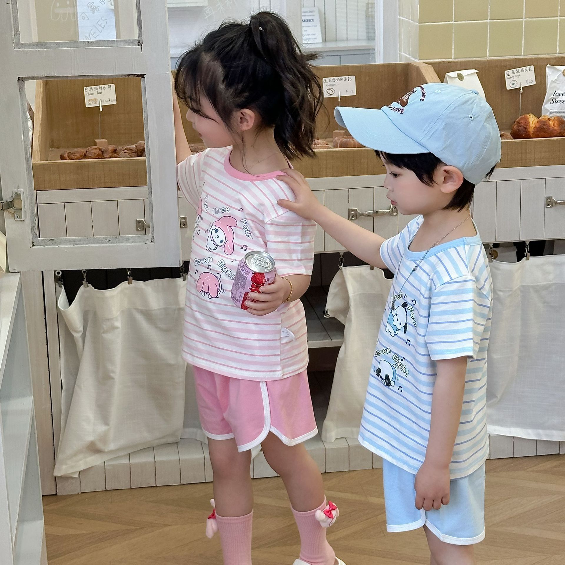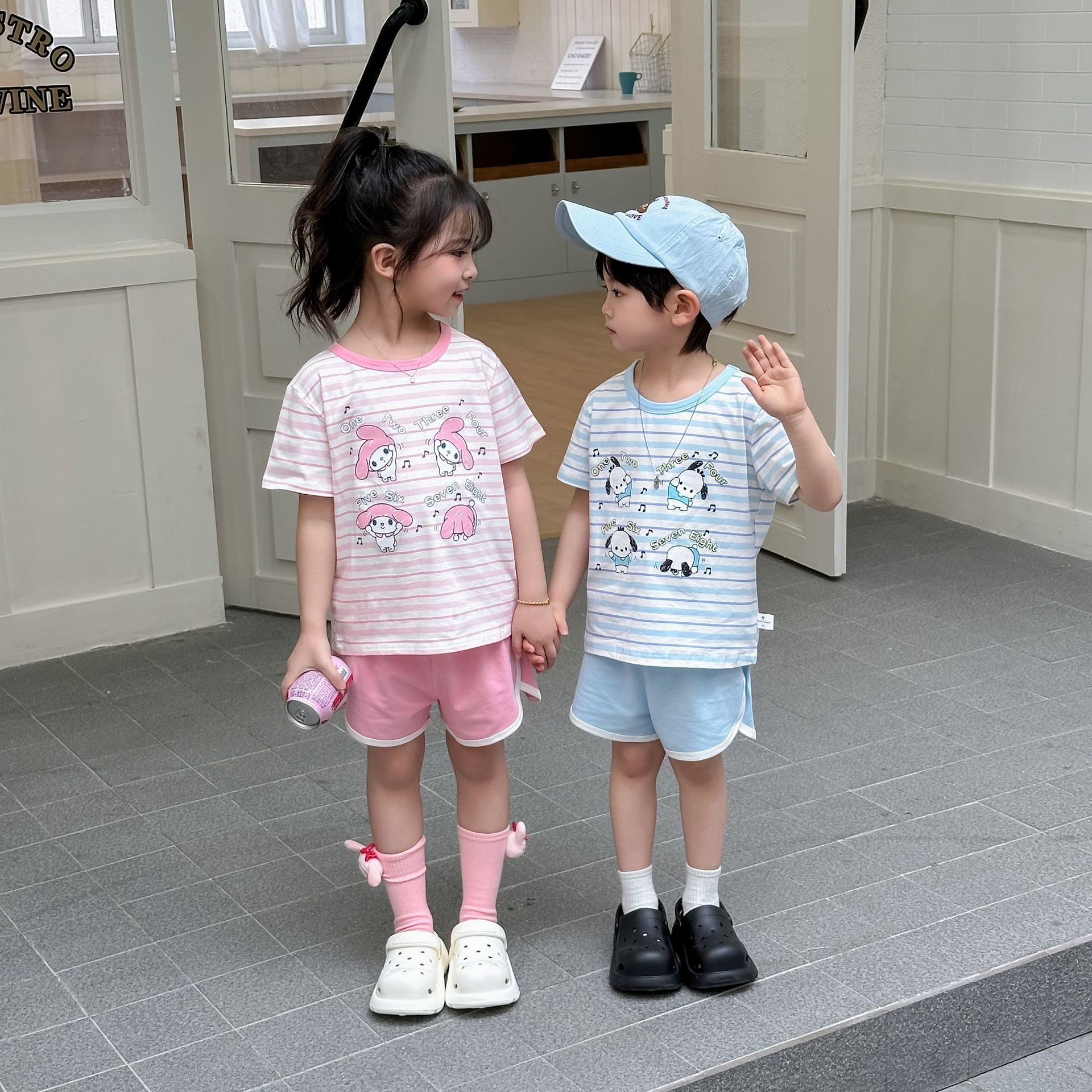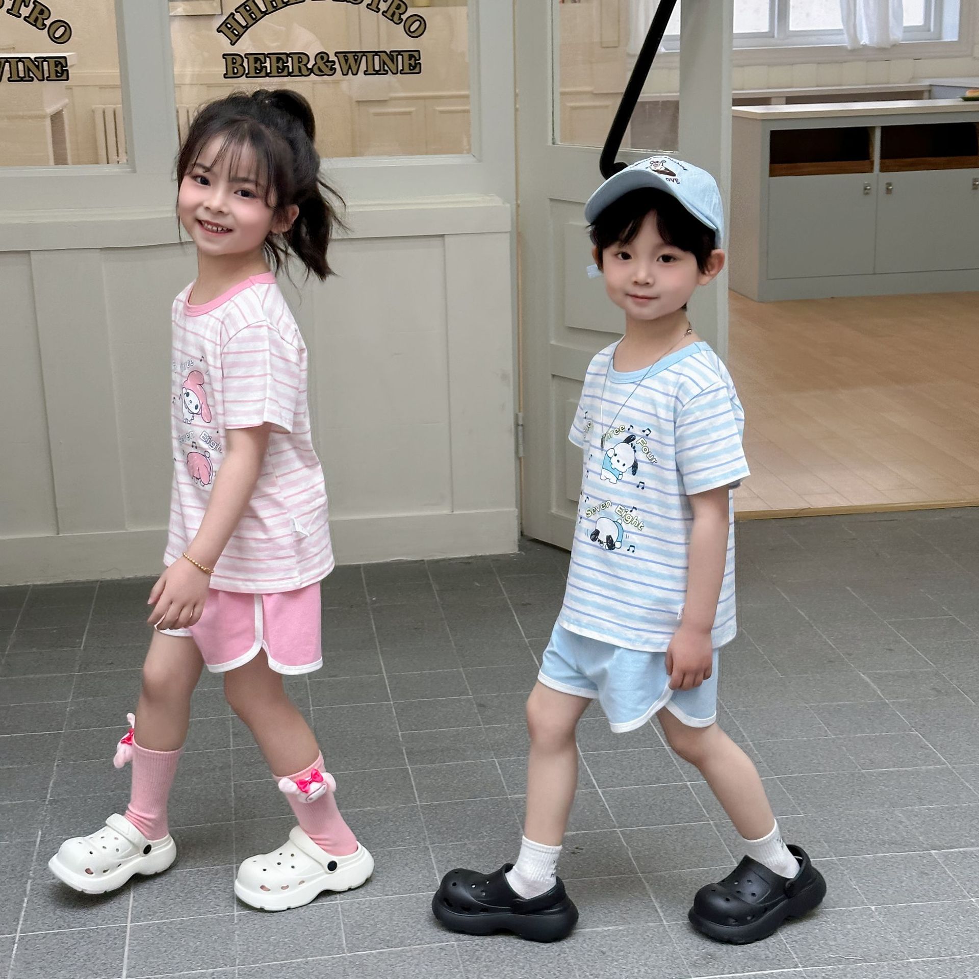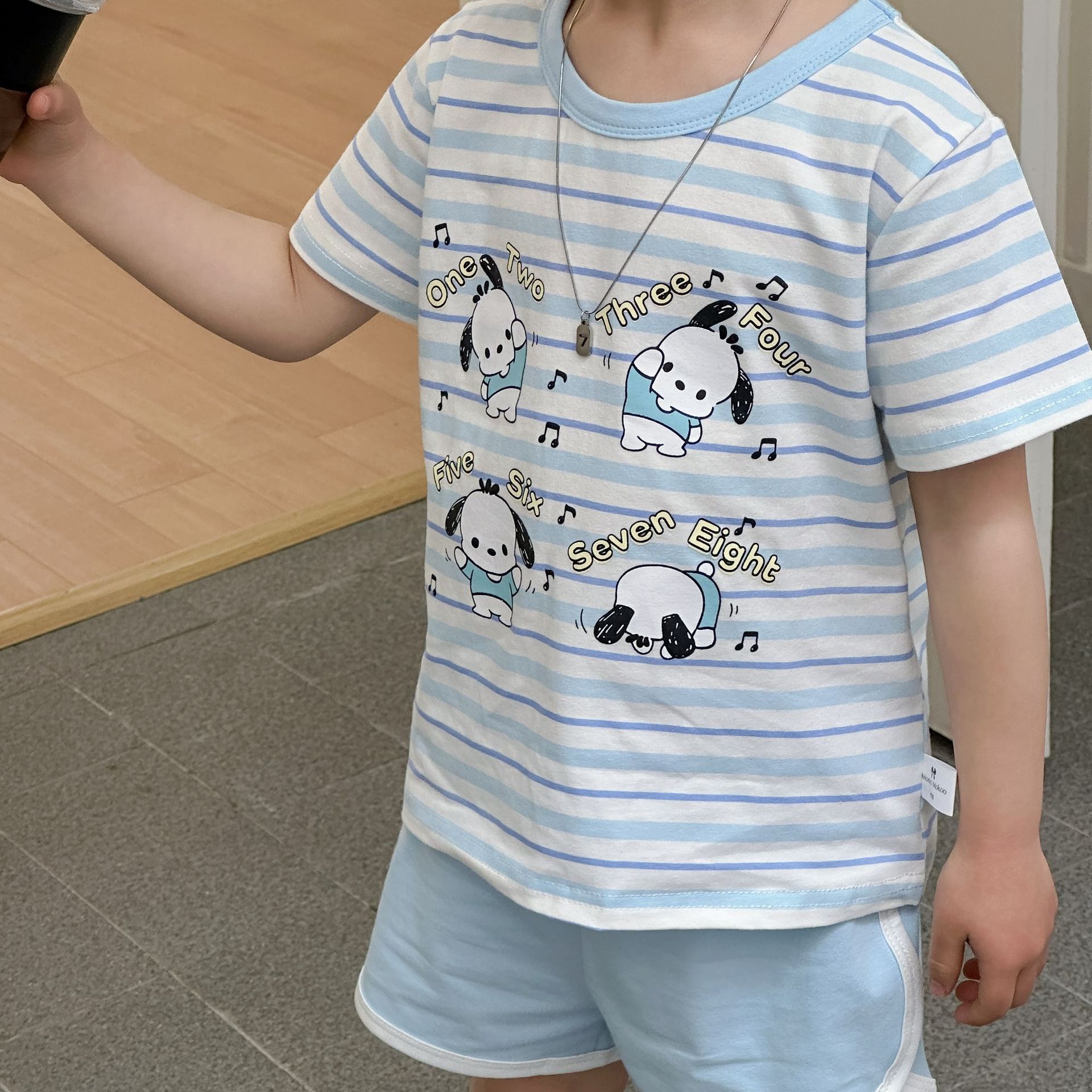 [95 면 라이크라] 새로운 어린이 세트 운동복 짧은 소매 반바지 티셔츠 뜨거운 바지 여름 인쇄 귀여운 25스토어 가기