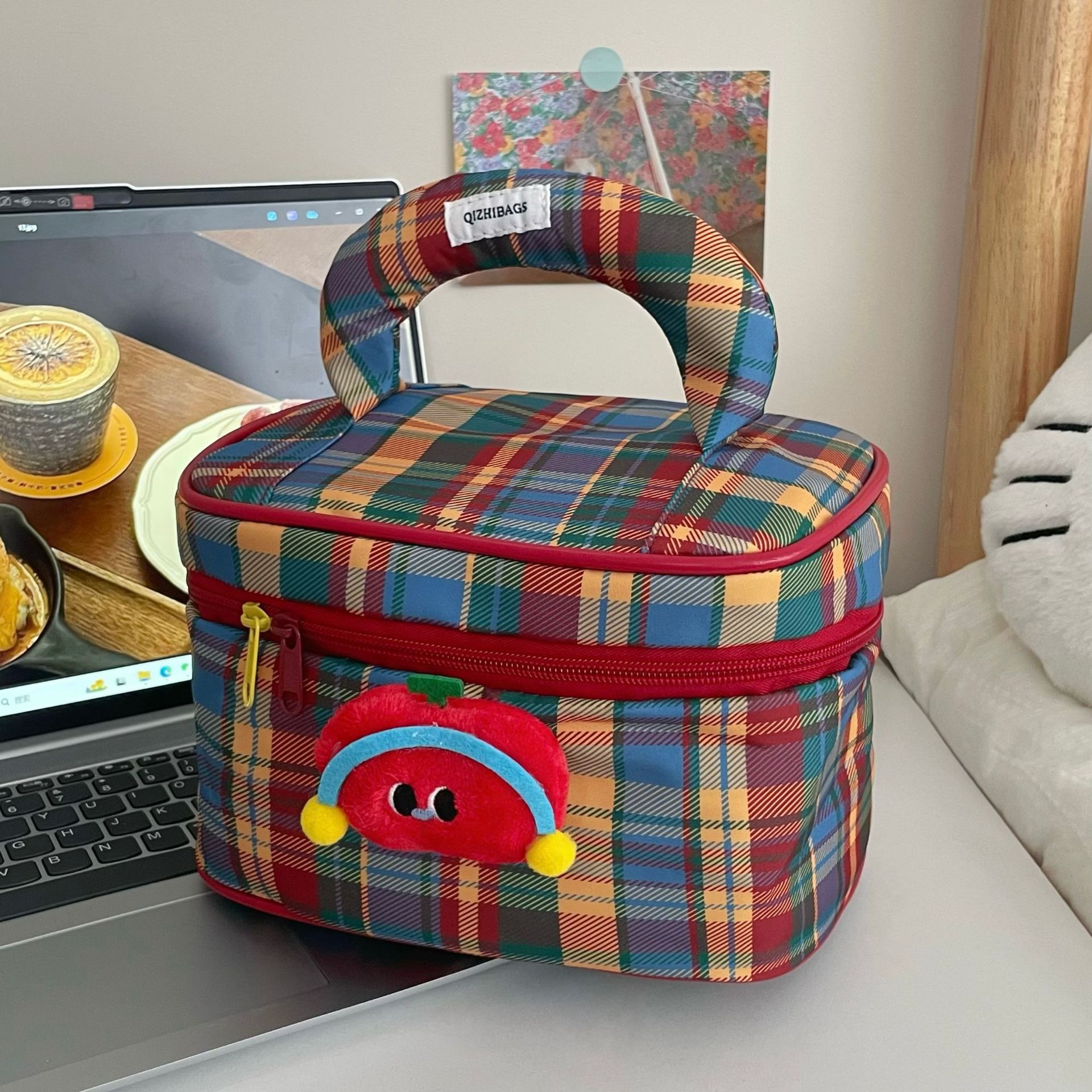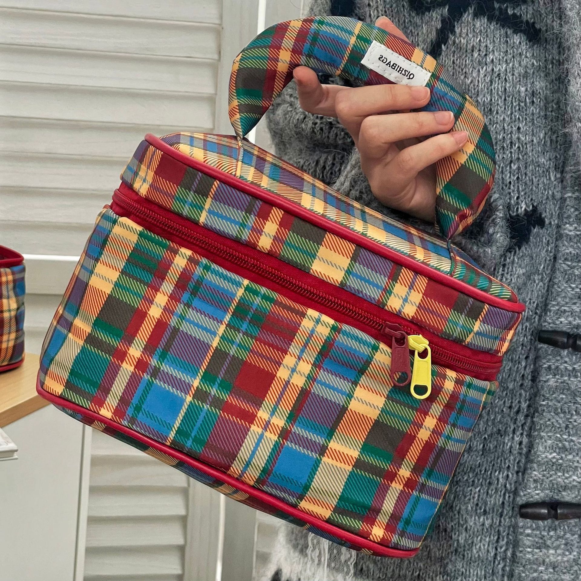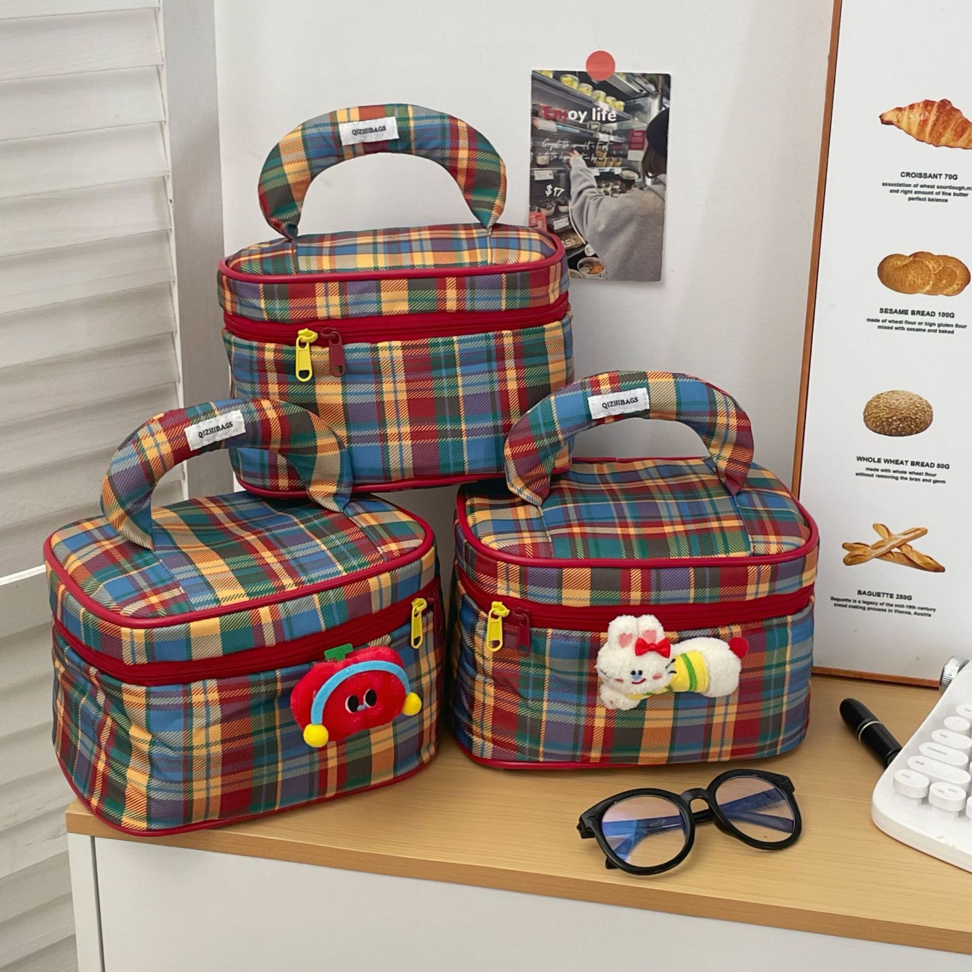 귀여운 격자 무늬 메이크업 가방 여성의 대용량 휴대용 여행 휴대용 파티션 립스틱 화장품 보관 가방