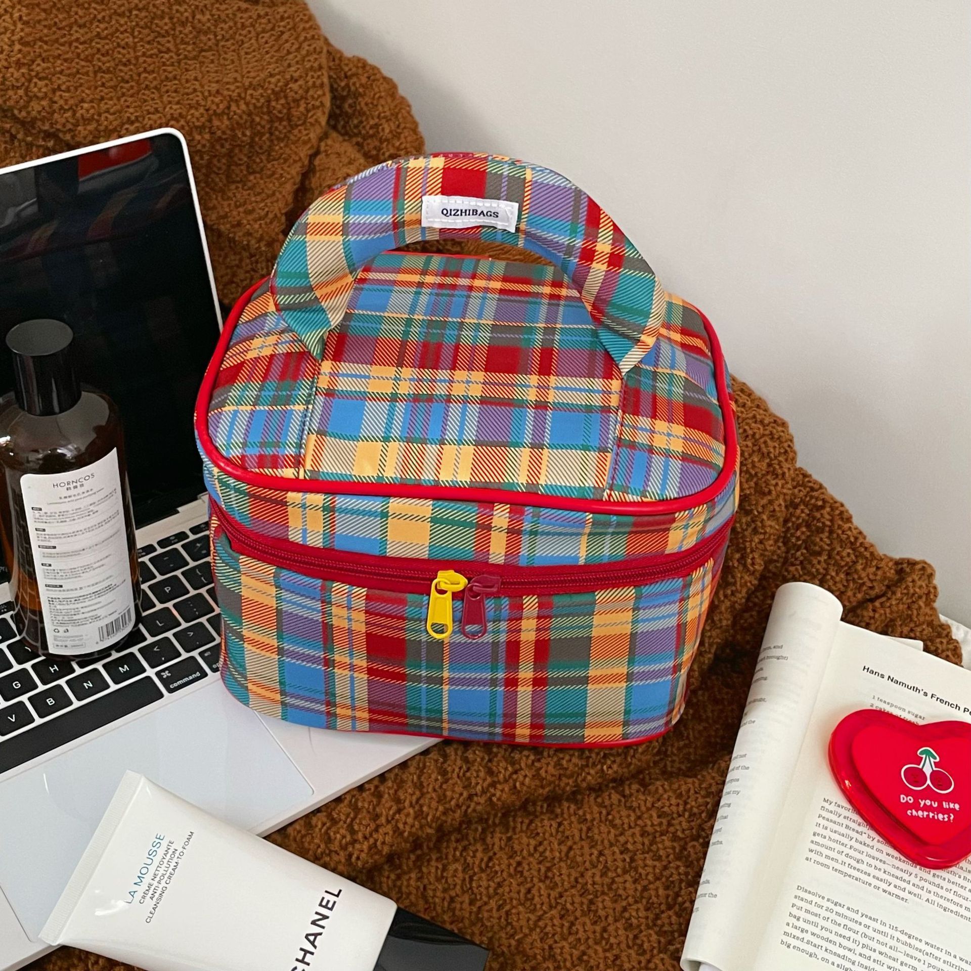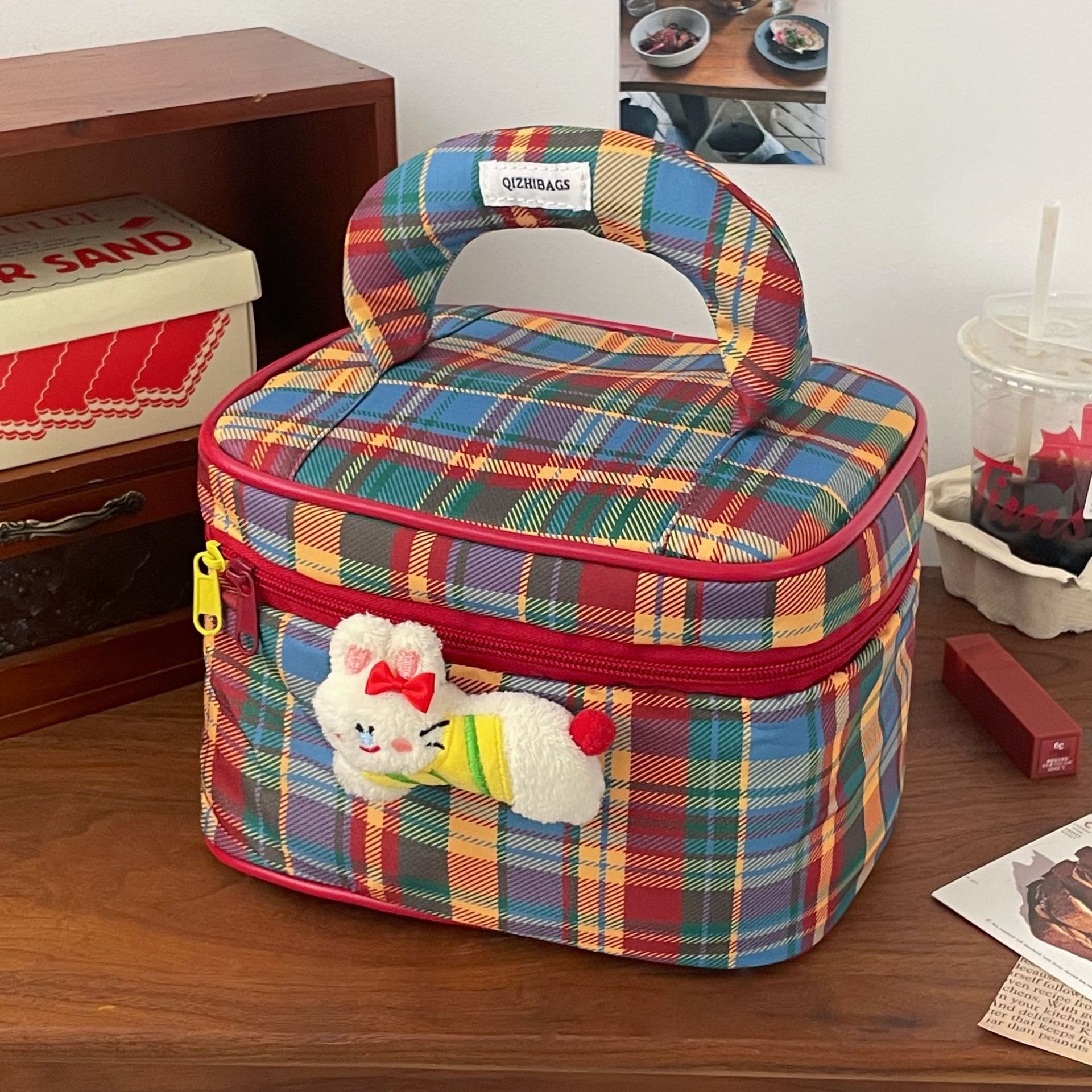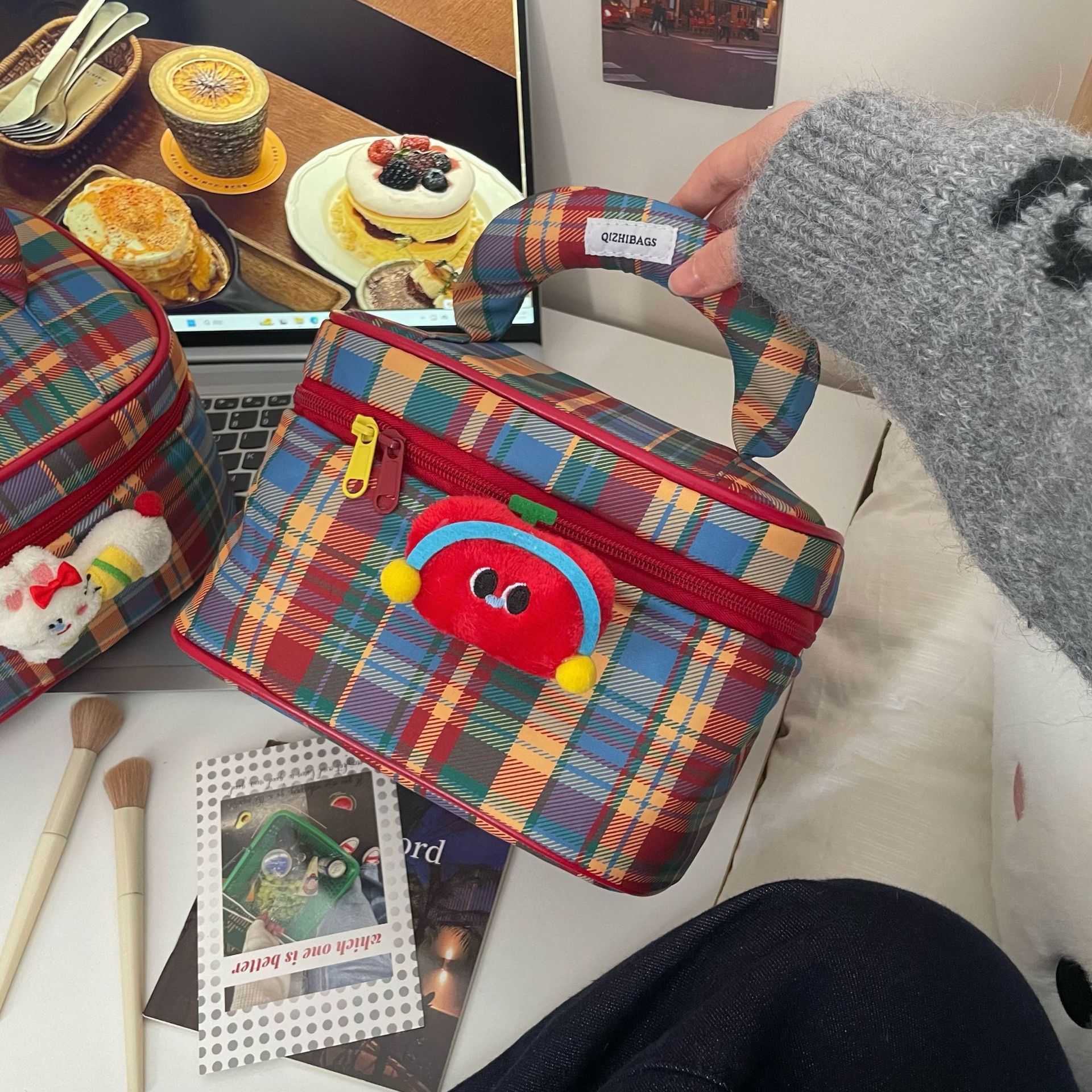 귀여운 격자 무늬 메이크업 가방 여성의 대용량 휴대용 여행 휴대용 파티션 립스틱 화장품 보관 가방