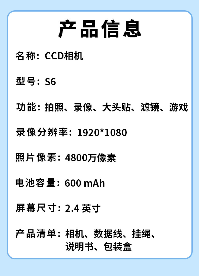 S6 디지털 카메라 플립 스크린 카메라 학생 파티 높은 색상 가치 어린이 만화 카메라 HD 학생 카메라 선물스토어 가기