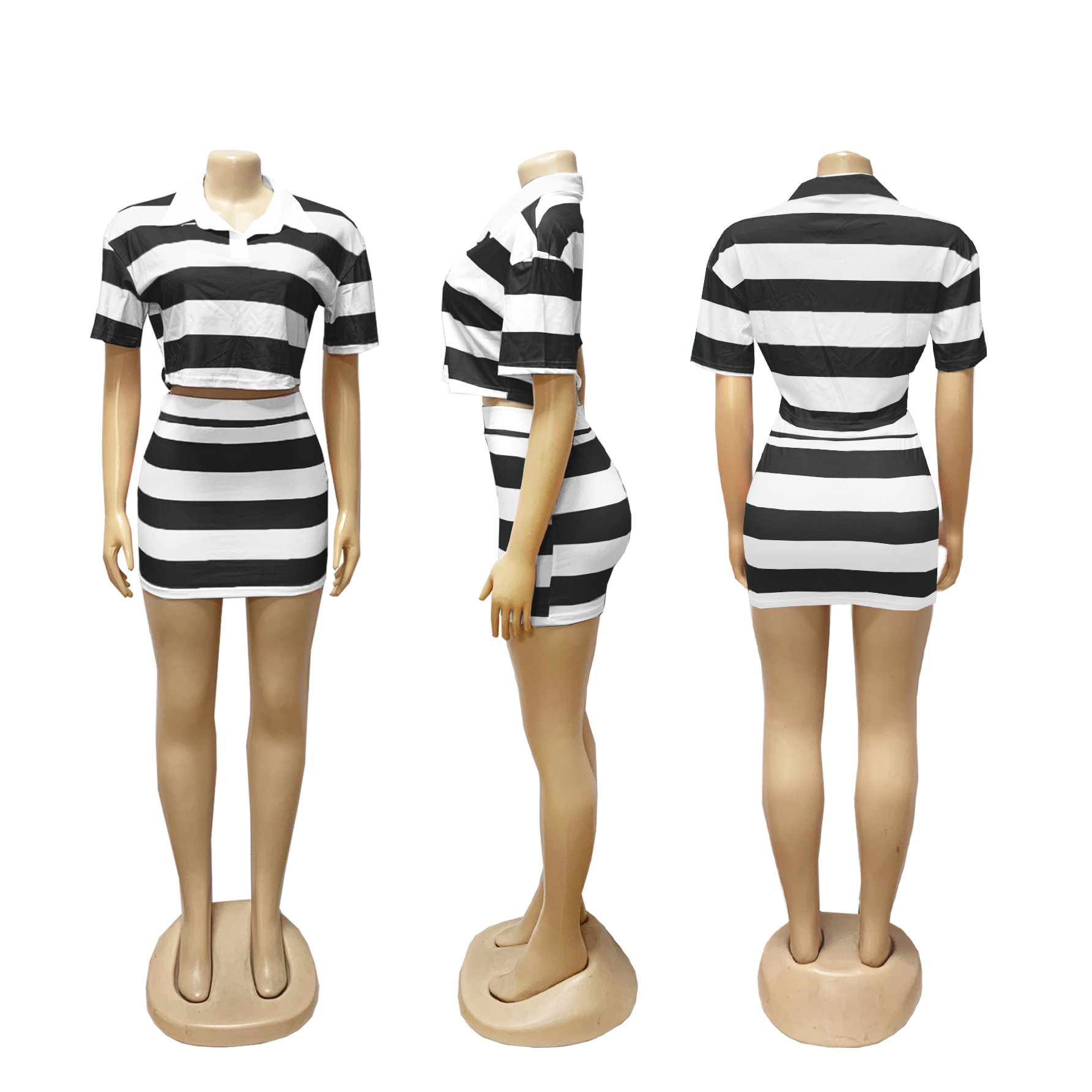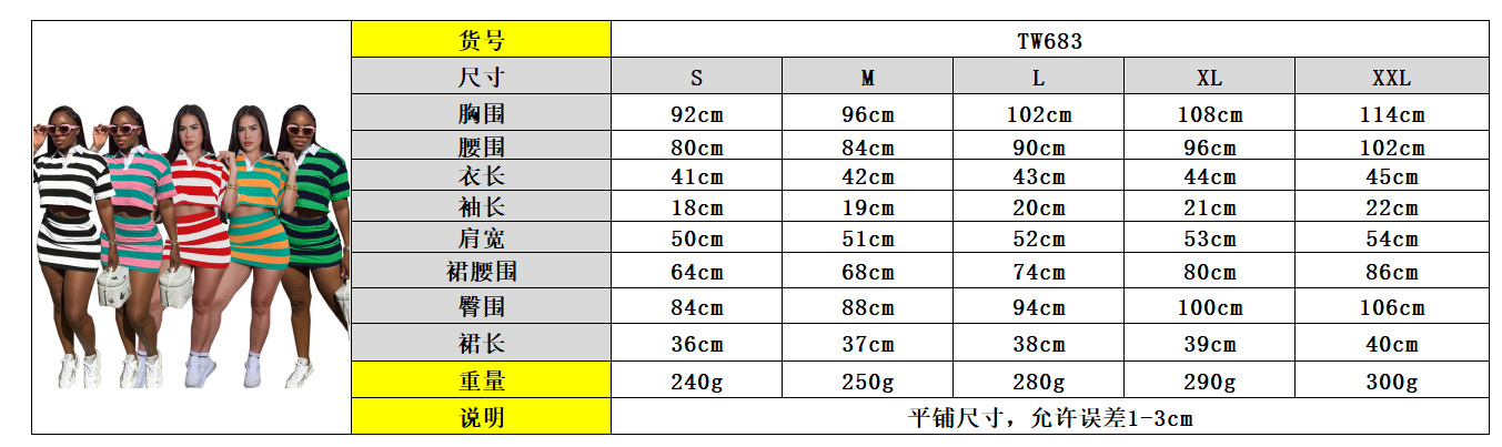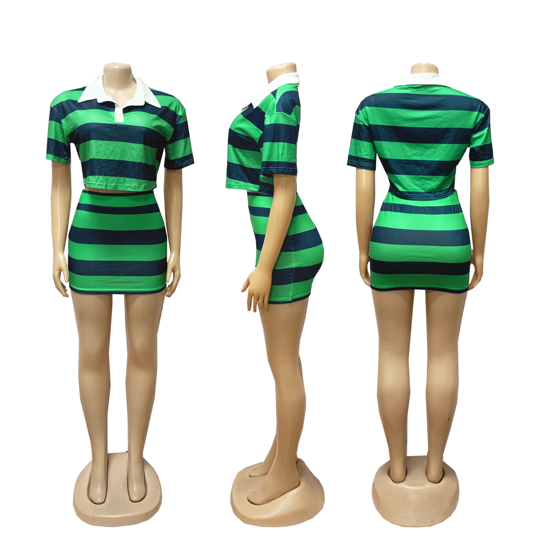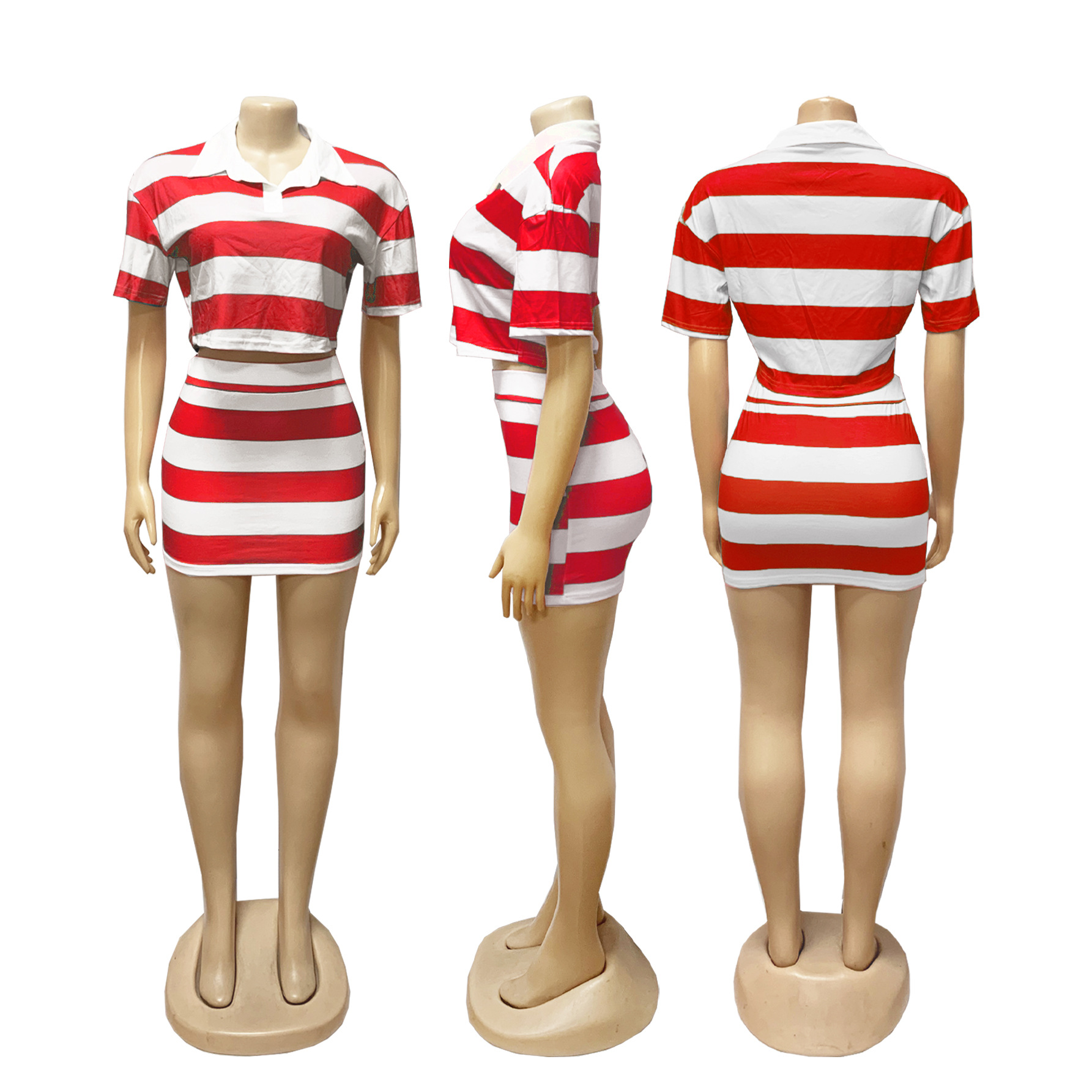 TW683 유럽과 미국의 국경 간 대외 무역 패션 여성 줄무늬 색상 대비 배꼽 짧은 옷깃 최고 엉덩이 치마 세트