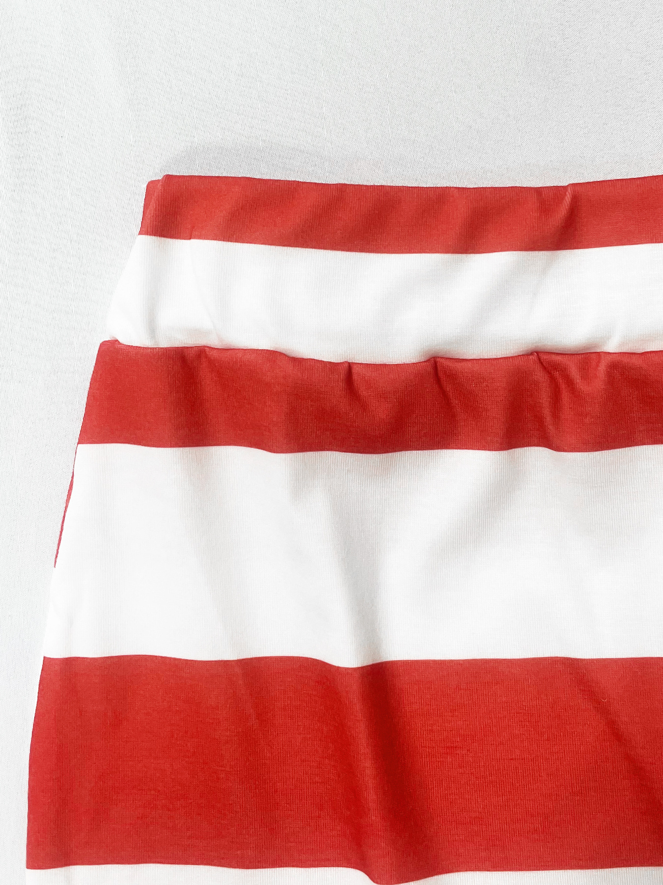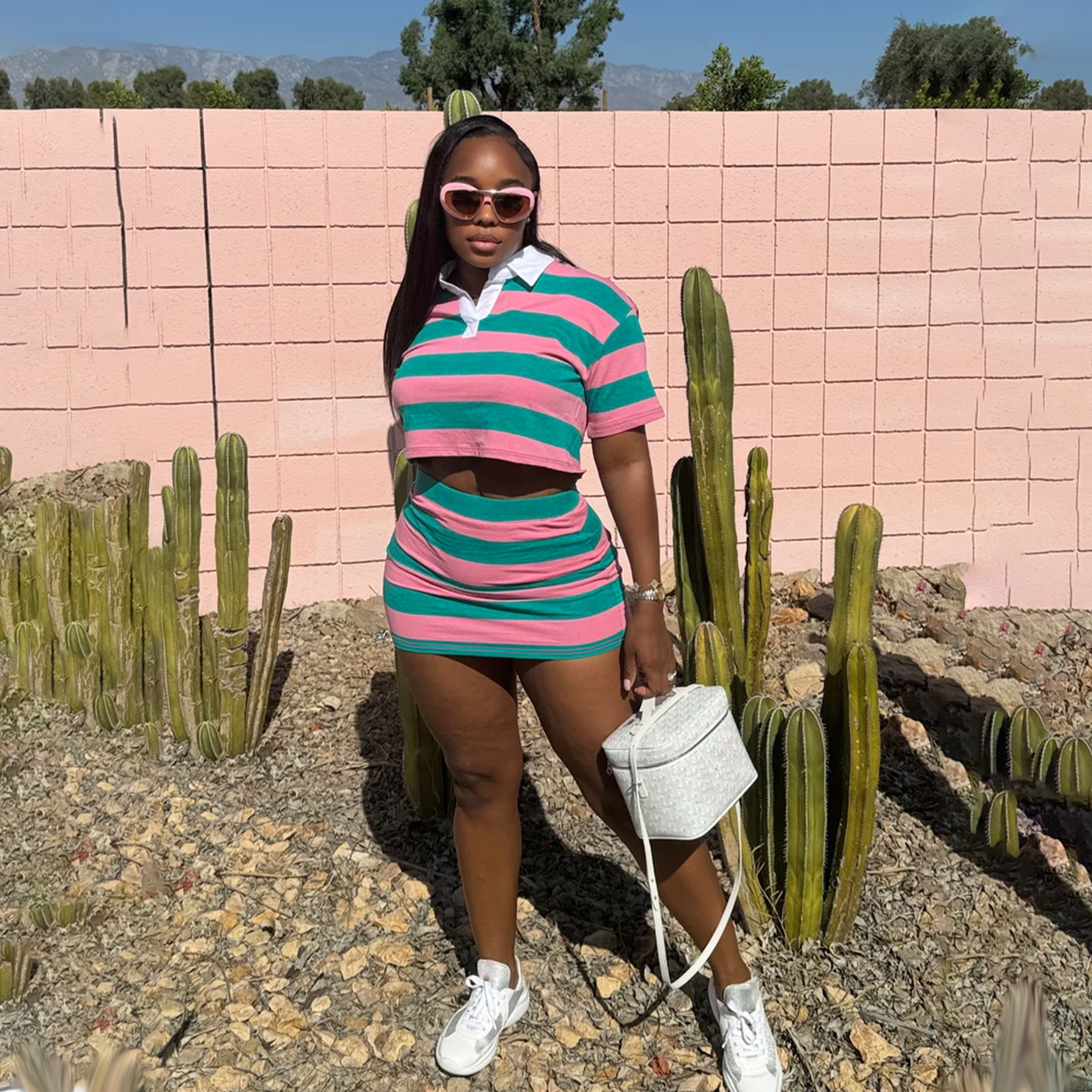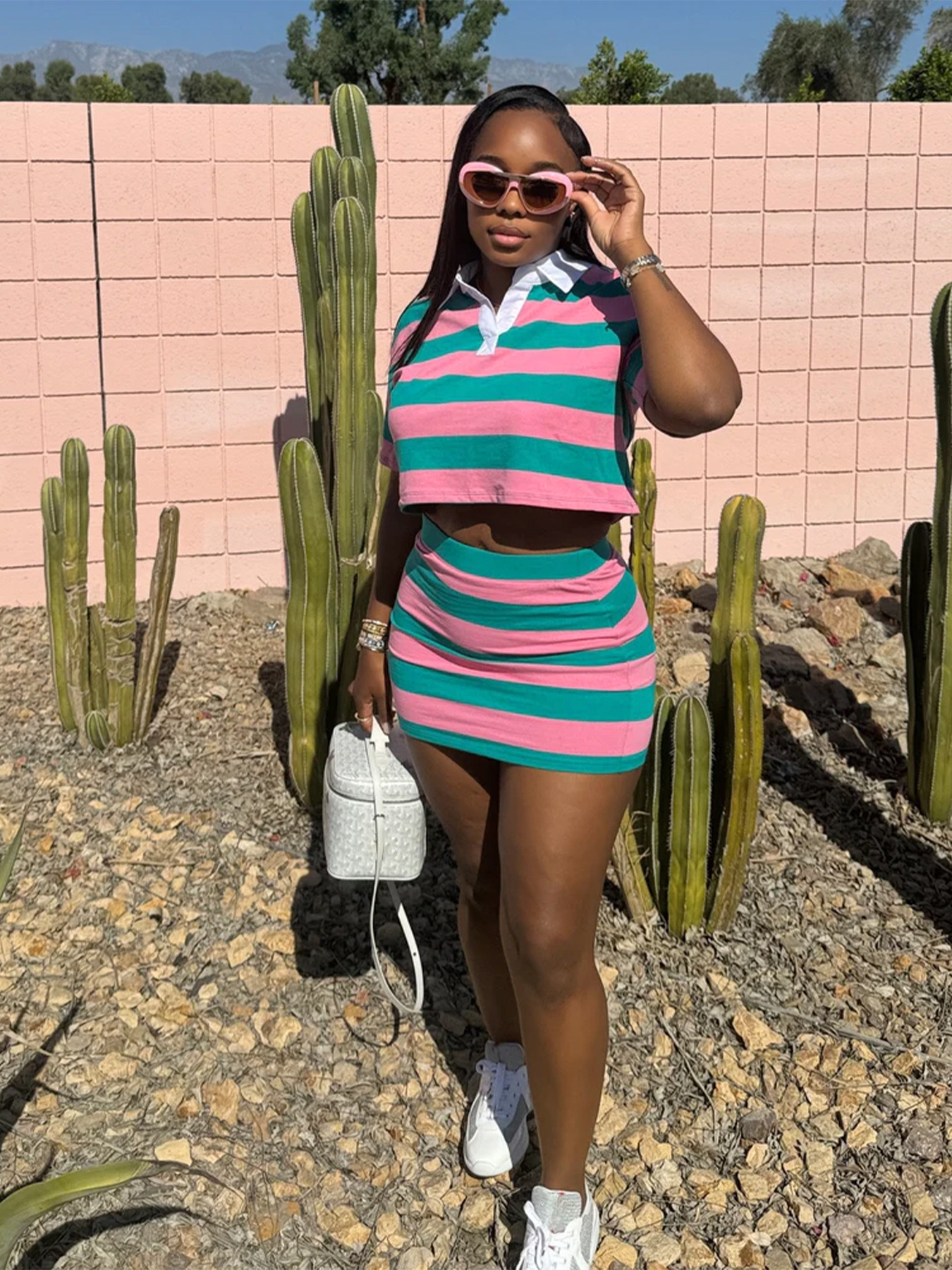 TW683 유럽과 미국의 국경 간 대외 무역 패션 여성 줄무늬 색상 대비 배꼽 짧은 옷깃 최고 엉덩이 치마 세트