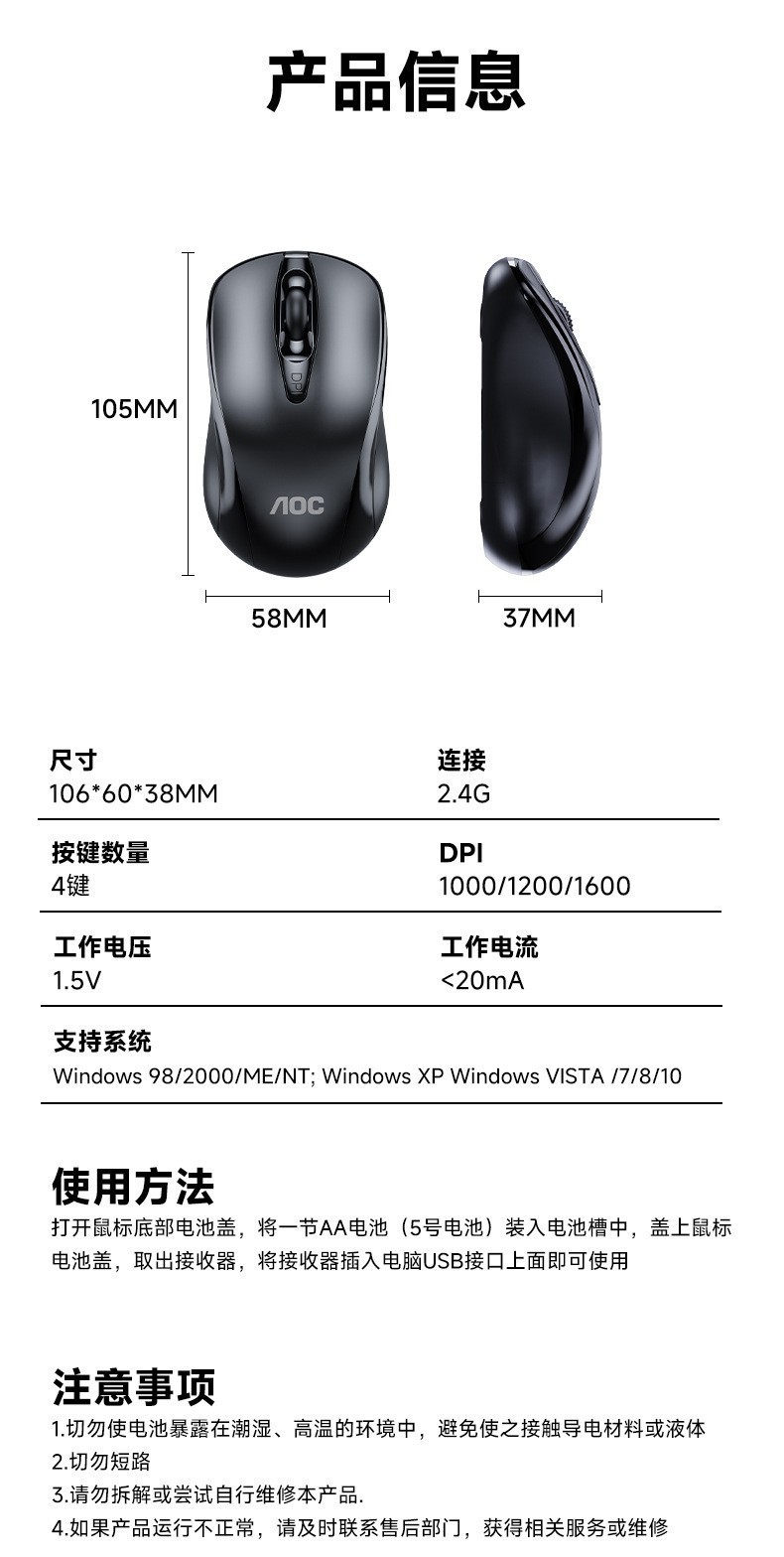 TPV AOC MS320 2.4G 무선 오피스 마우스 USB 노트북 데스크톱 컴퓨터 범용 절전 마우스스토어 가기