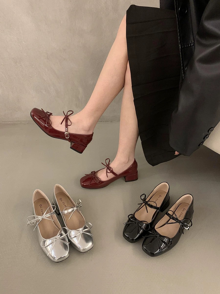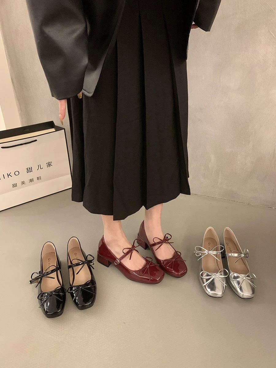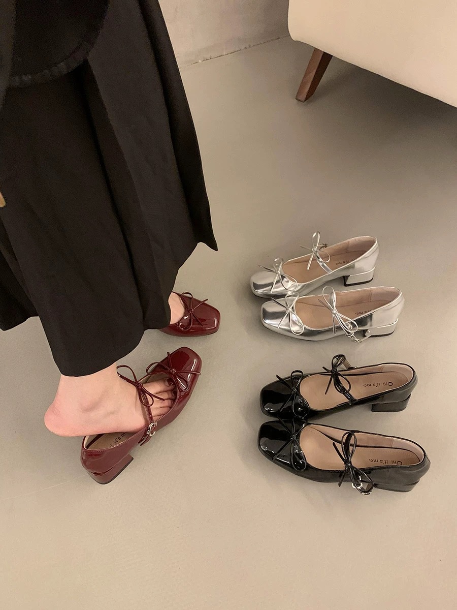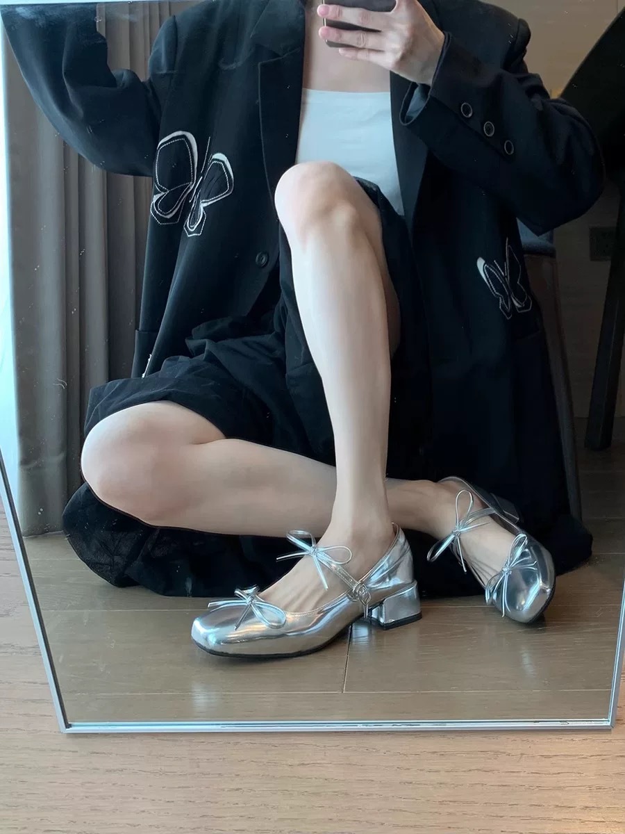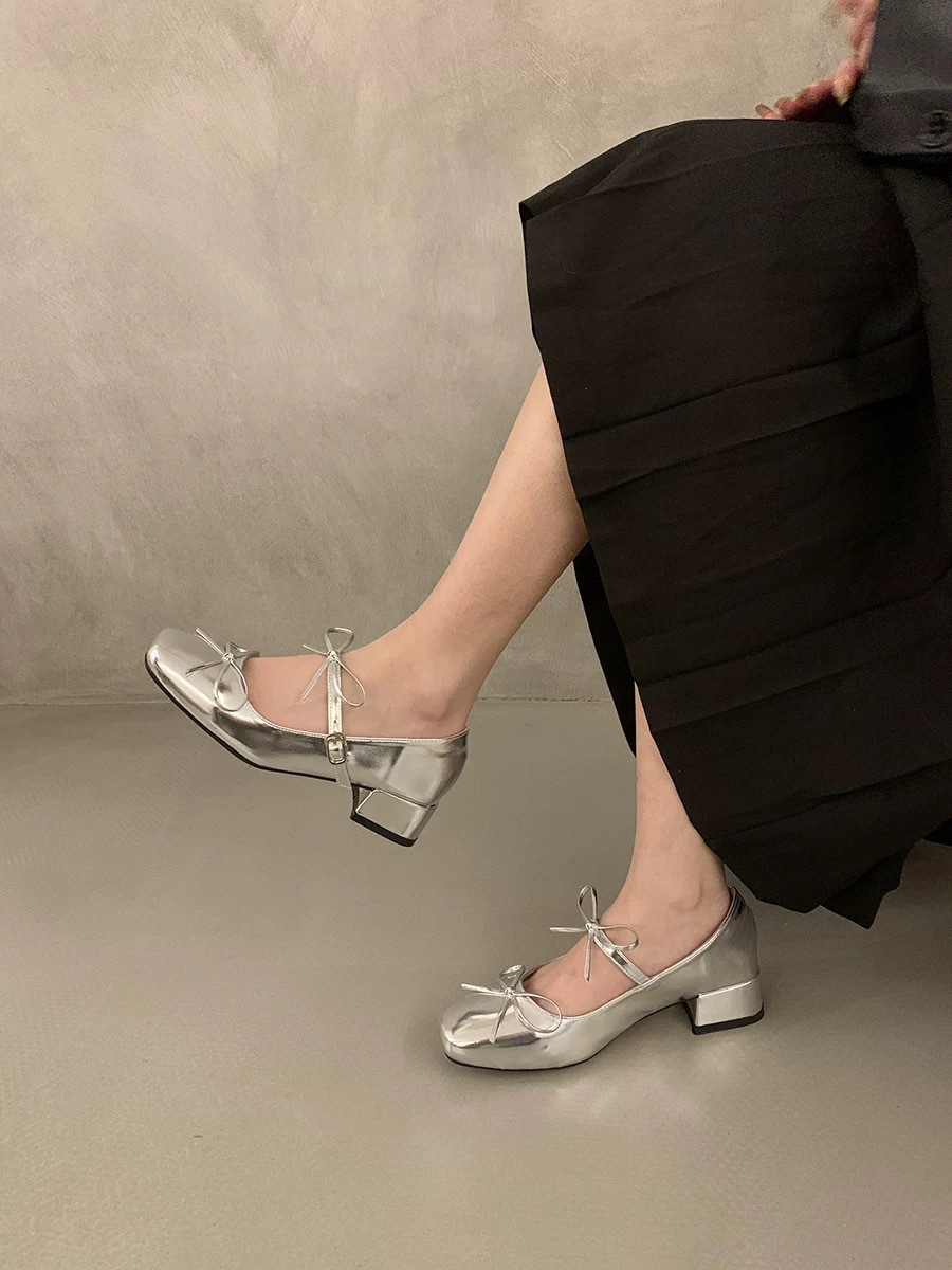 실버 프렌치 보우 메리 제인 신발 여성의 2025 새로운 봄 두꺼운 힐 우아한 올 매치 스커트 작은 가죽 신발스토어 가기