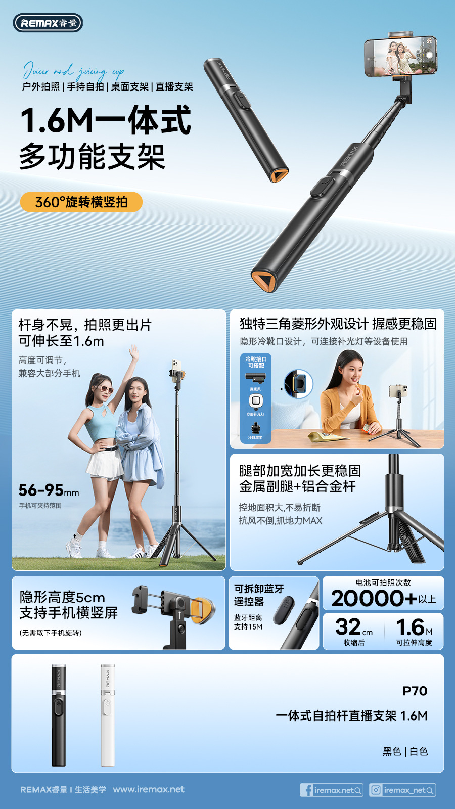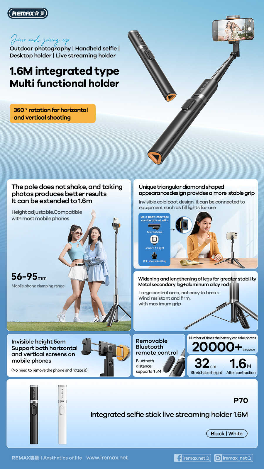 Remax Rui 원피스 셀카 스틱 라이브 스탠드 160cm 리모컨 360 회전 휴대 전화 스탠드