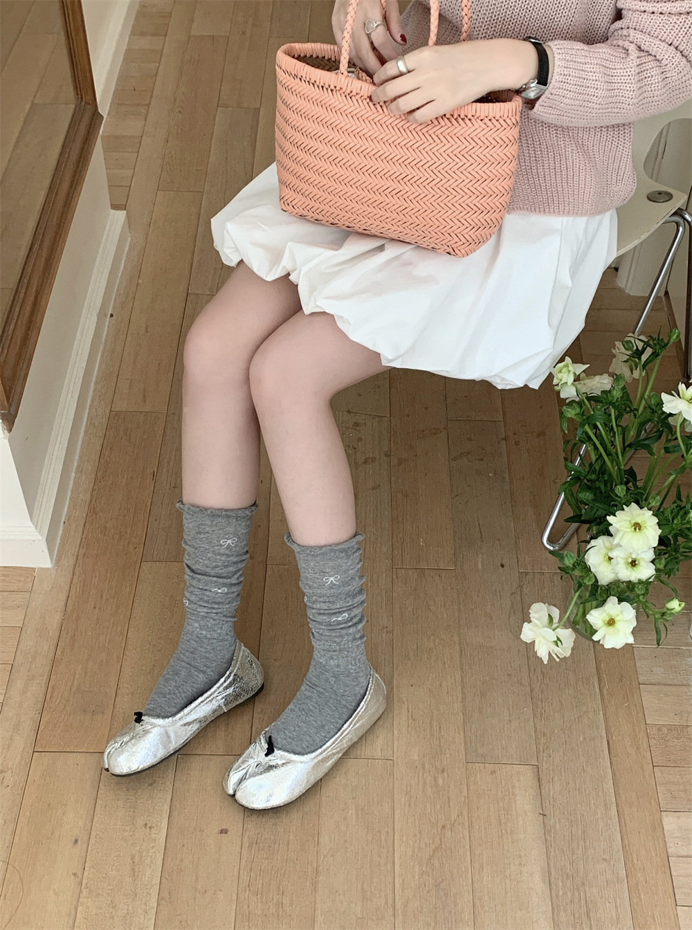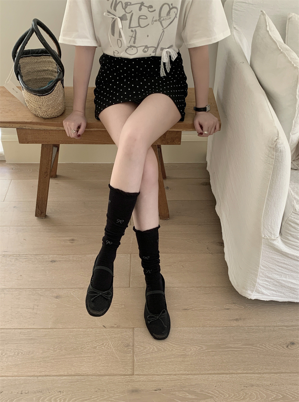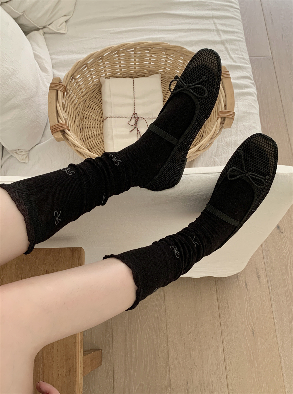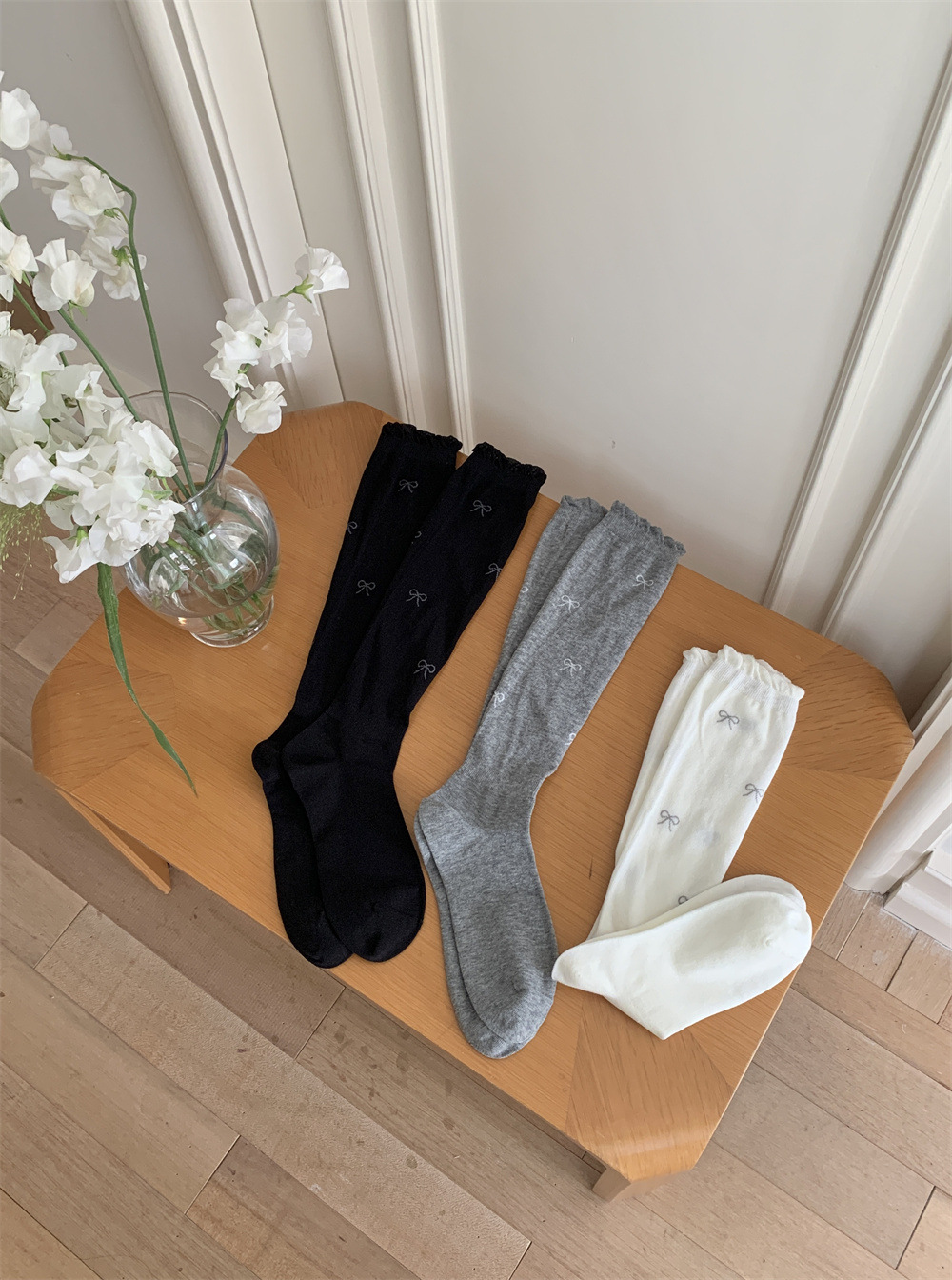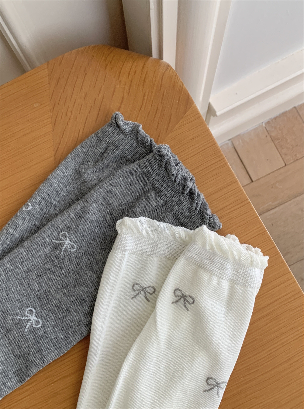 달콤한 스타일 Bowknot 송아지 양말 여성의 봄과 가을 얇은 약간 투명한 JK 우유 흰색 더미 양말 나무 귀 스타킹 코튼스토어 가기