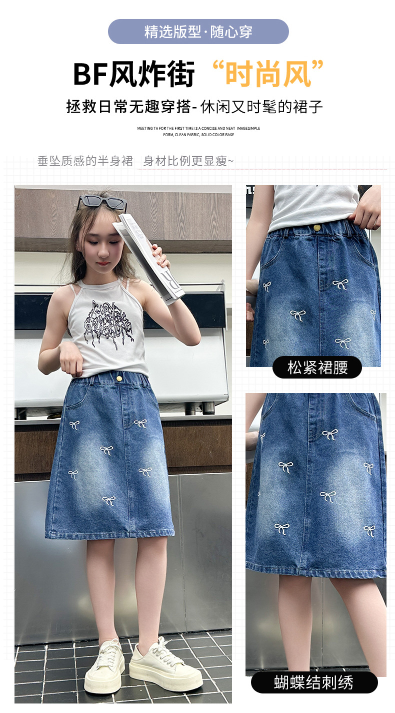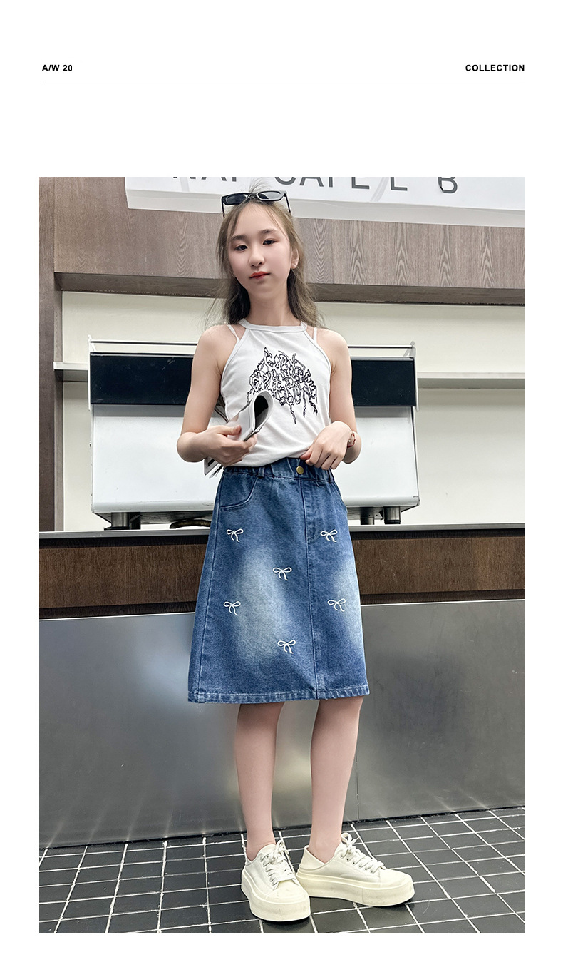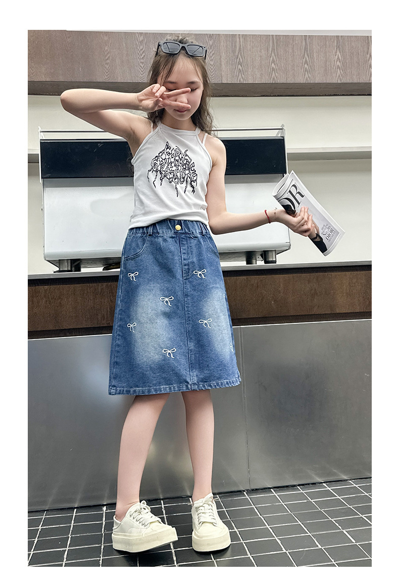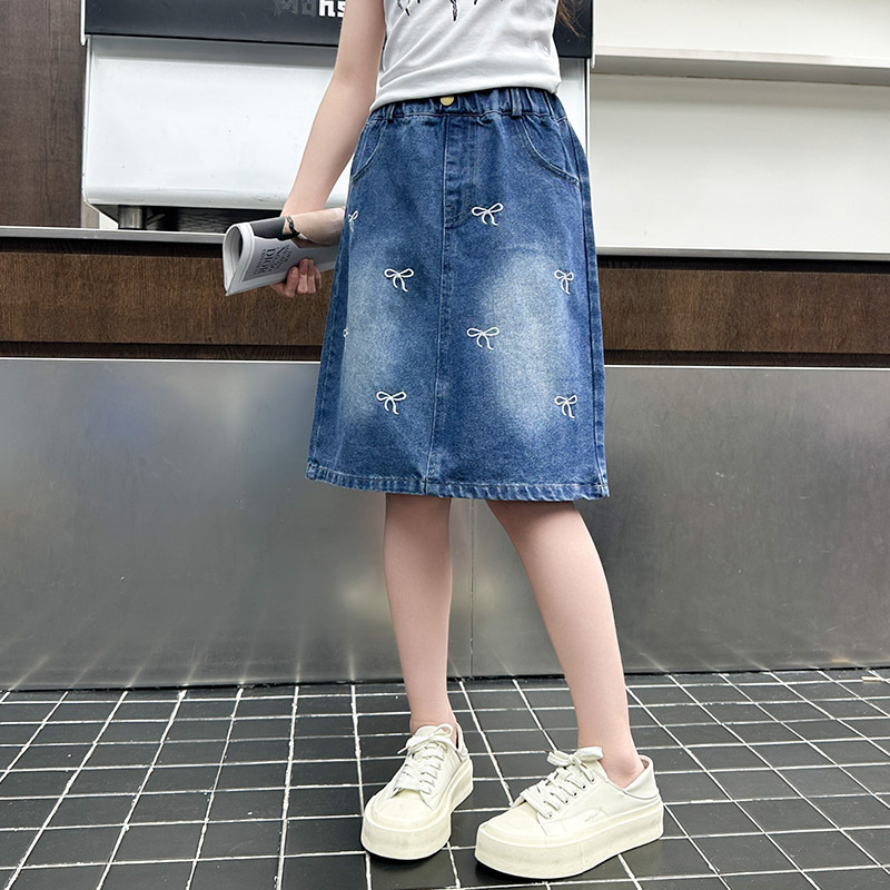 소녀 2025 년 여름 새 도착 활 자수 올 매치 스커트 한국 스타일 느슨한 데님 유행 치마스토어 가기