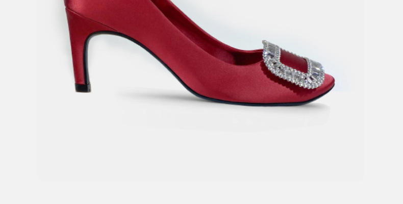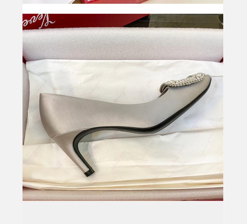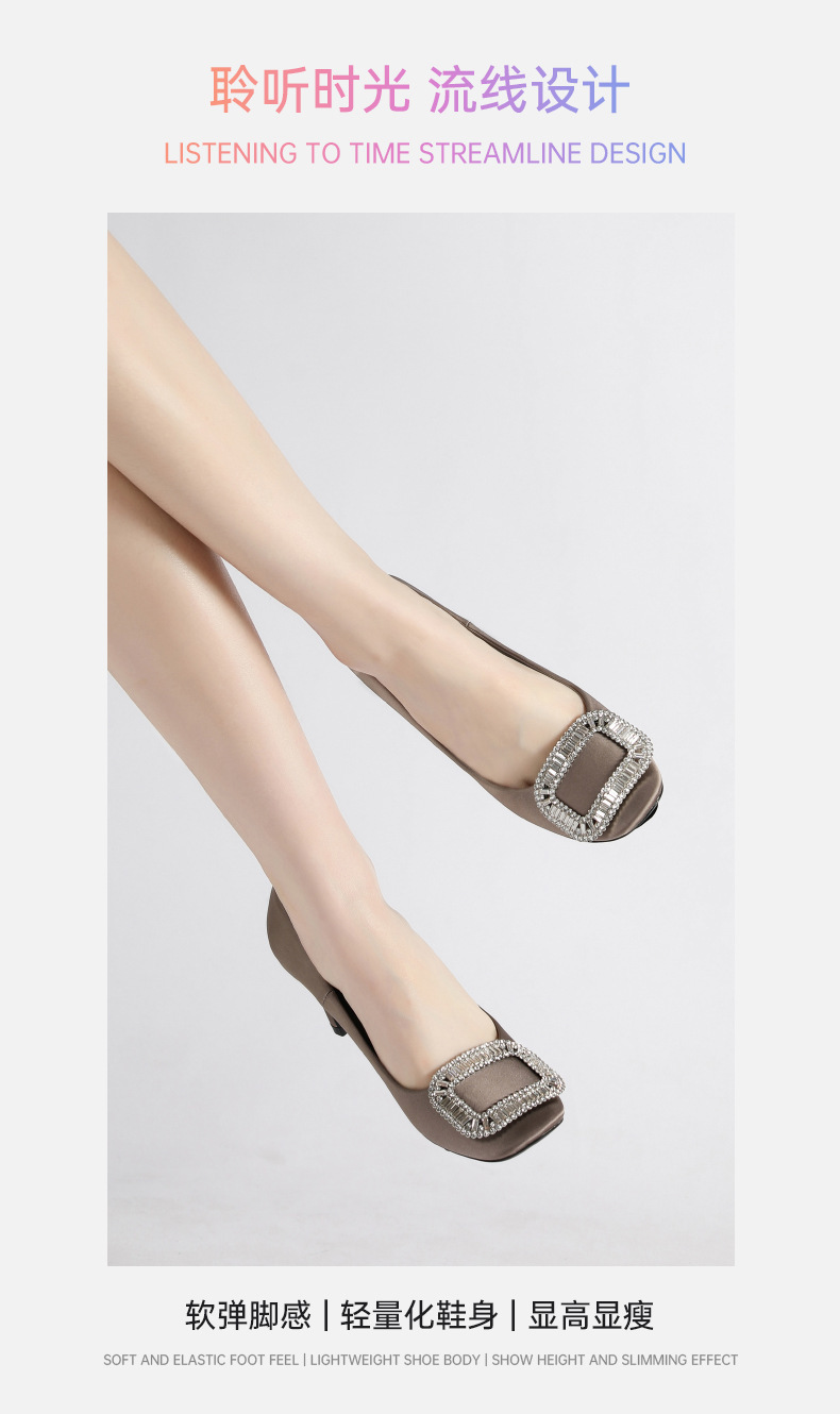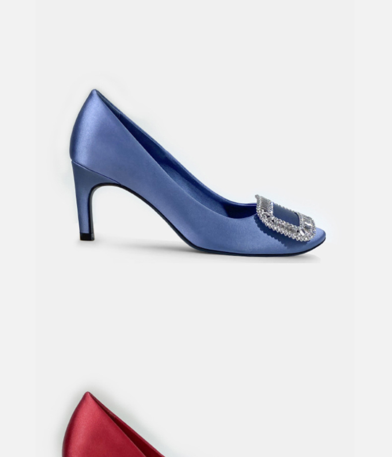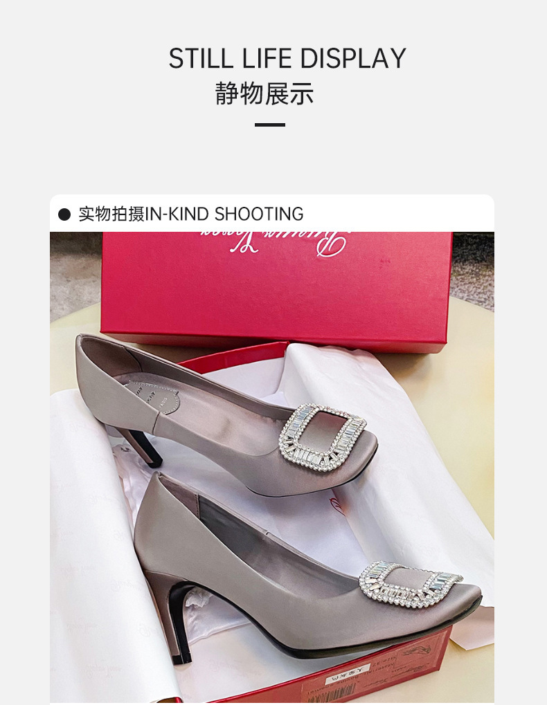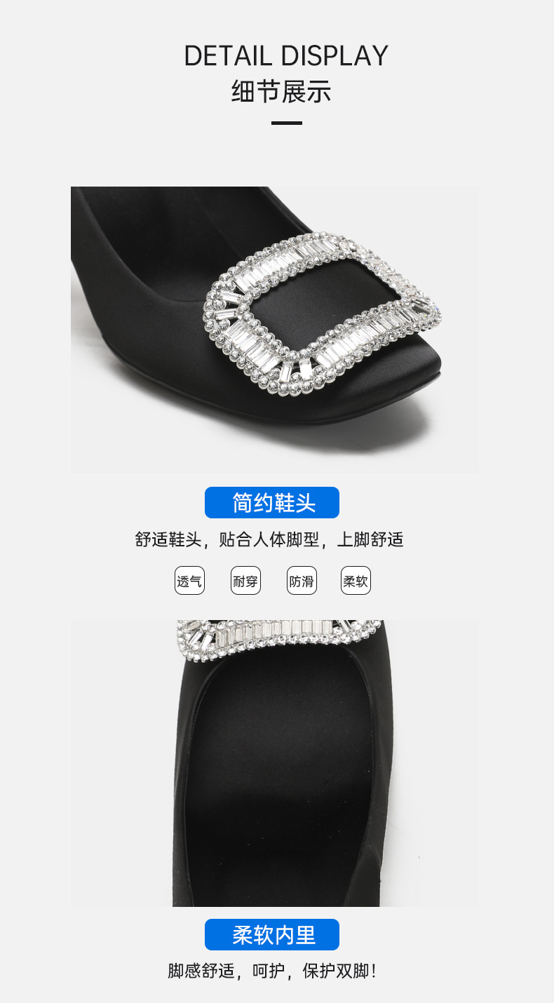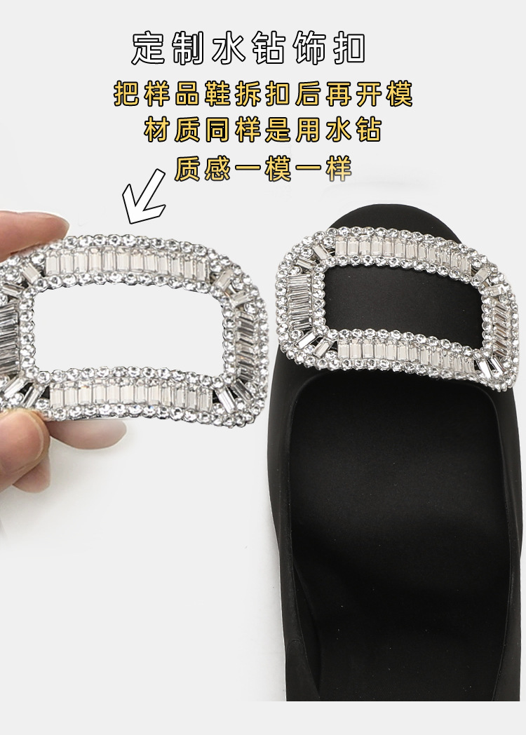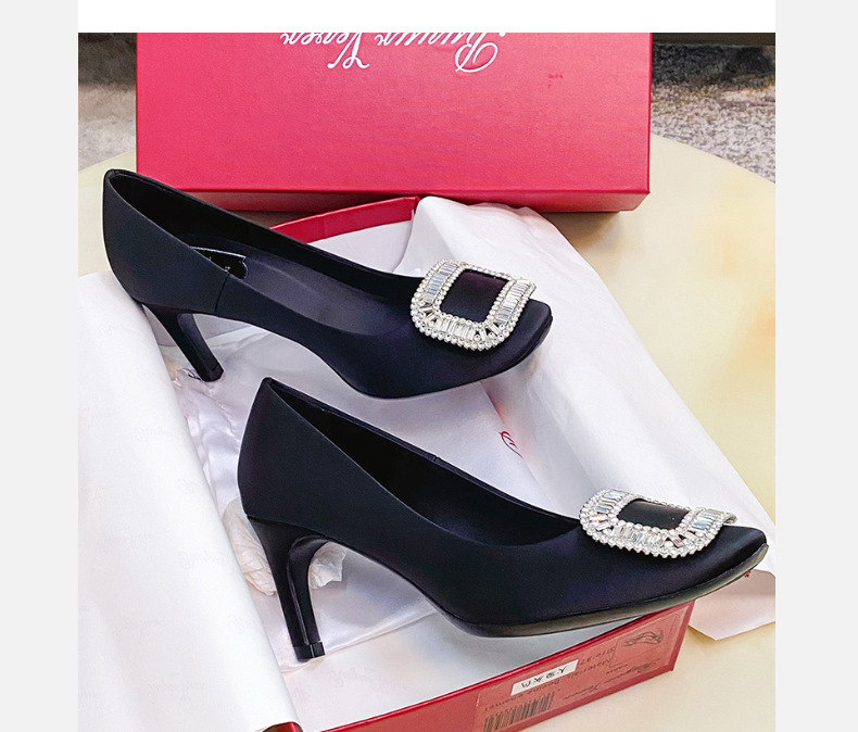 2026년 신상 왕만니 스타일 RV 하이힐, 워터다이아몬드 사각 버클, 라운드 토, 새틴, 얕은 입구의 여성용 싱글 슈즈, 공장 직판스토어 가기