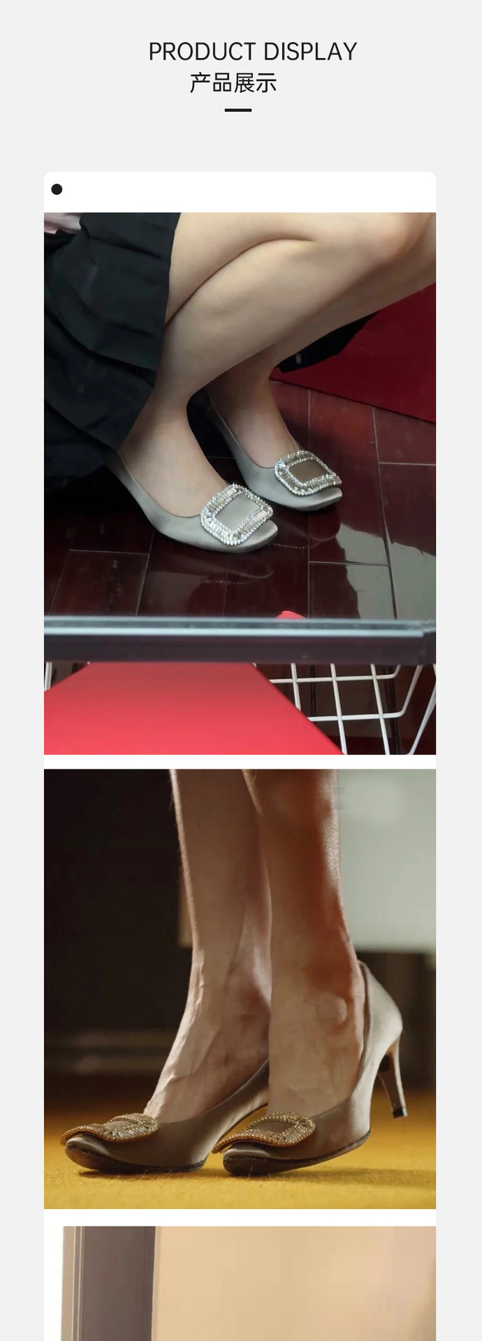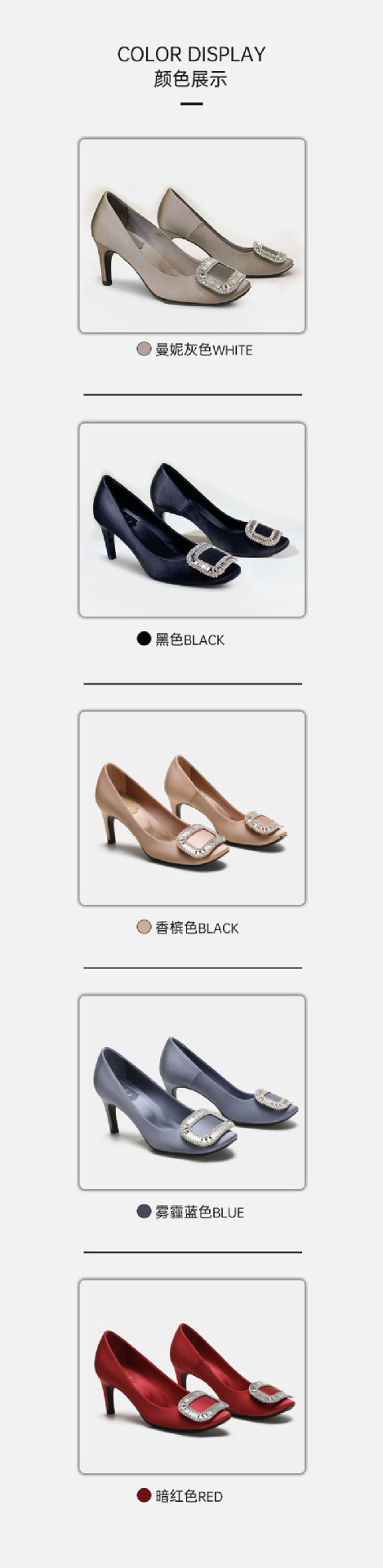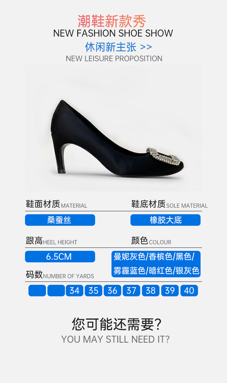 2026년 신상 왕만니 스타일 RV 하이힐, 워터다이아몬드 사각 버클, 라운드 토, 새틴, 얕은 입구의 여성용 싱글 슈즈, 공장 직판