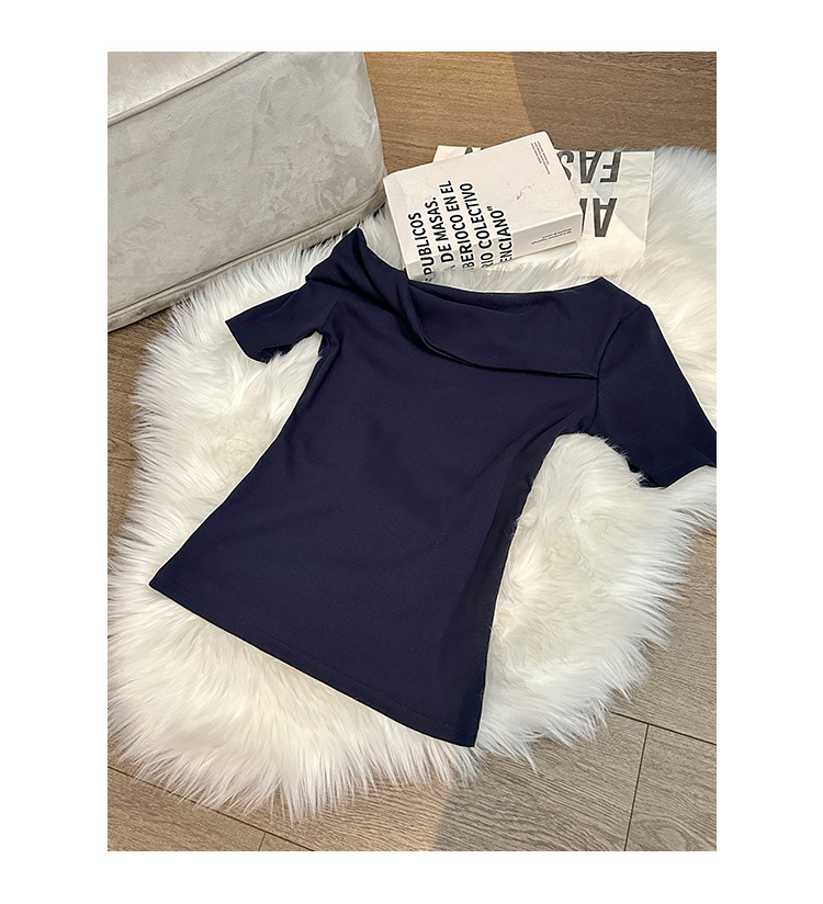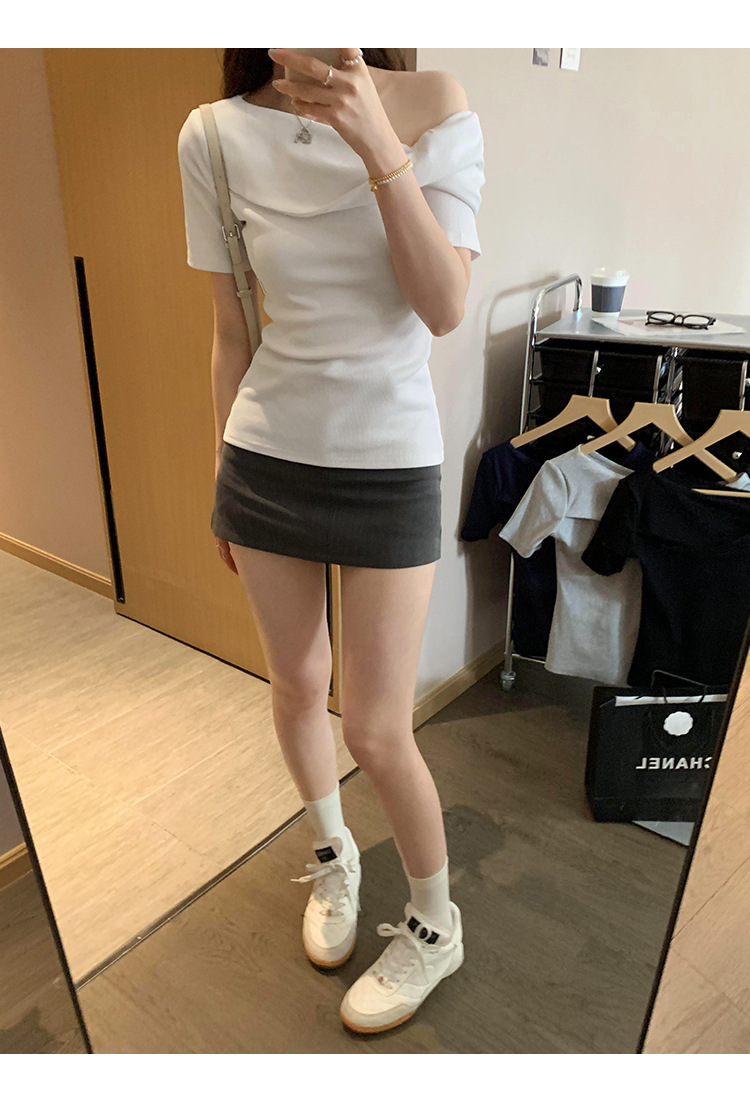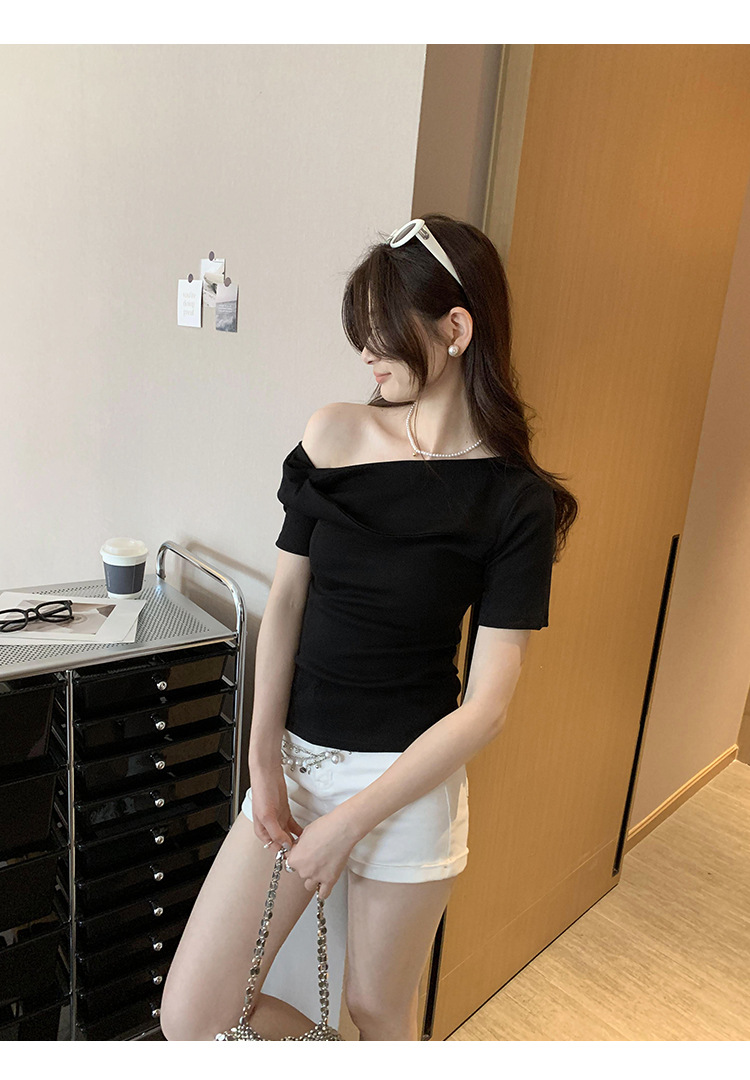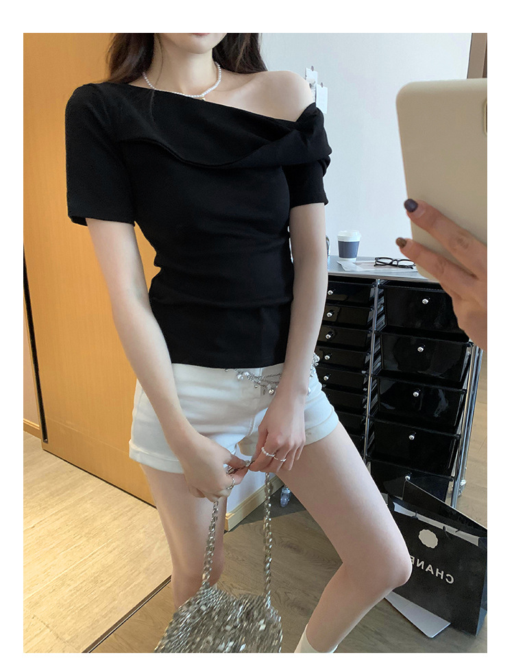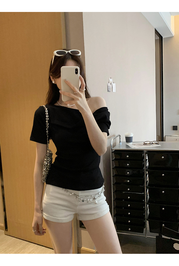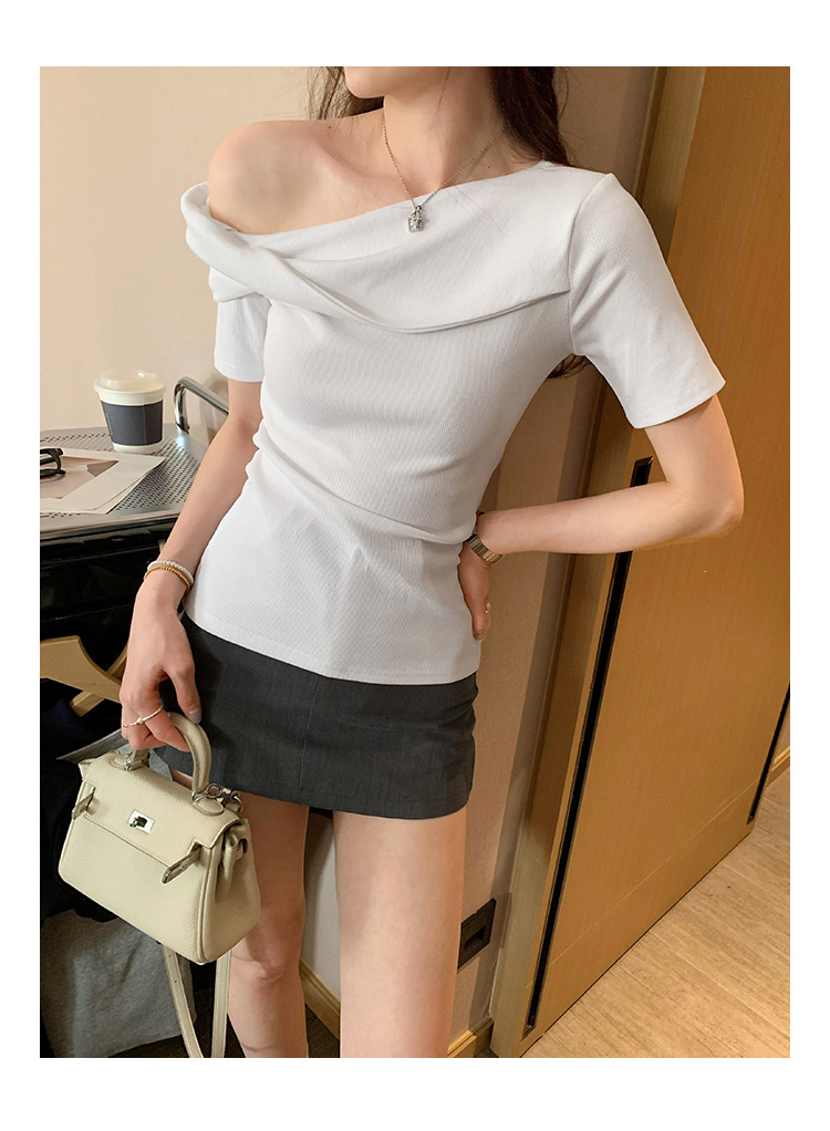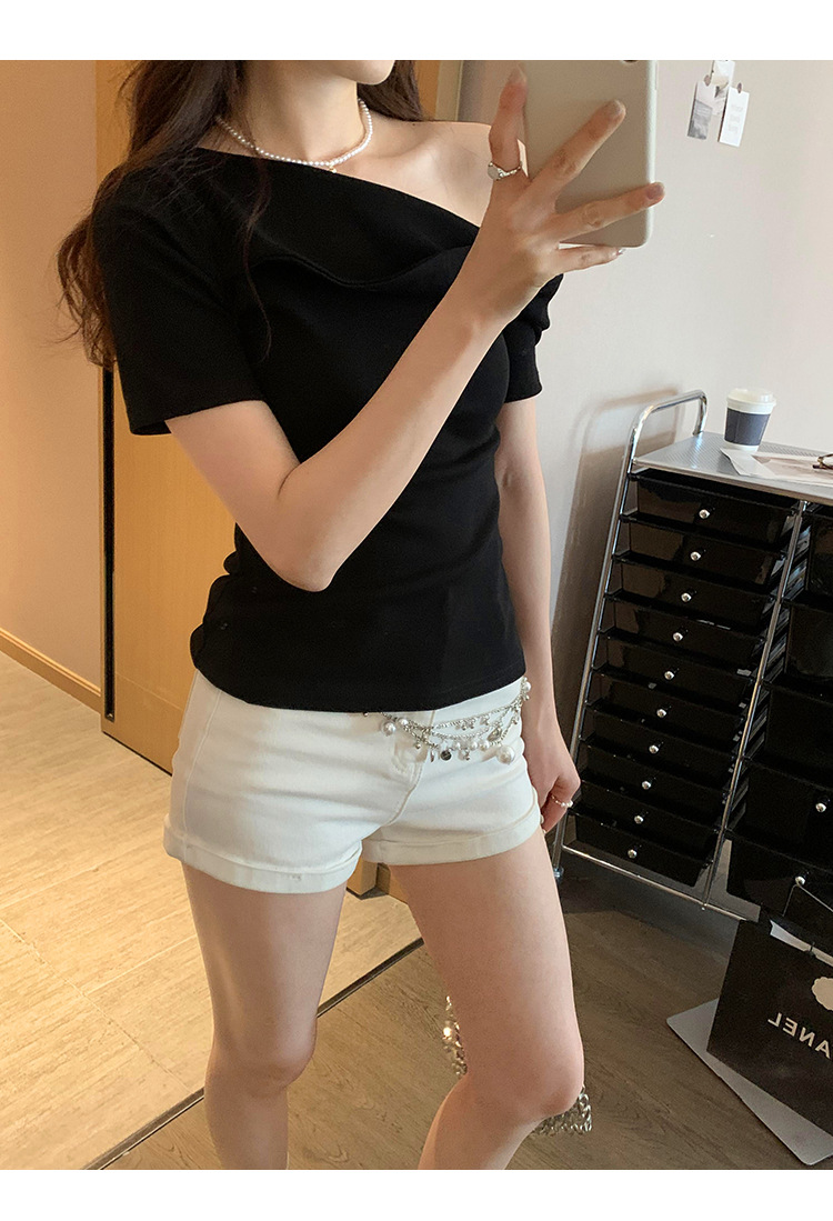 유럽의 독특한 스파이스 소녀 디자인 센스 슬란트 어깨 반팔 티셔츠 여성의 2025 여름 슬림핏 퓨어 숄더 탑