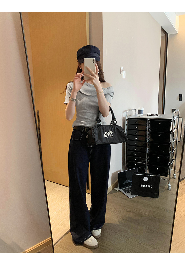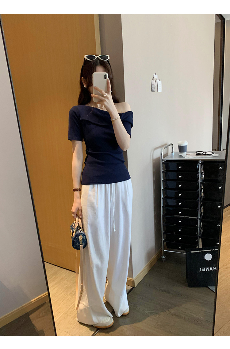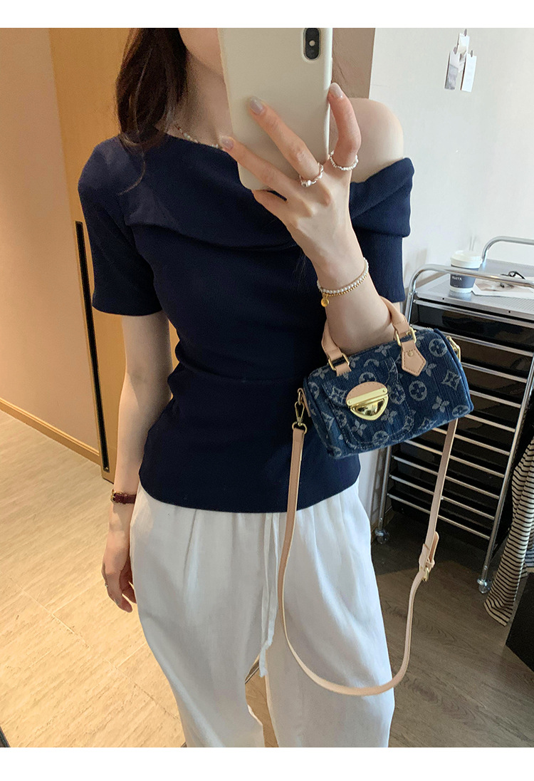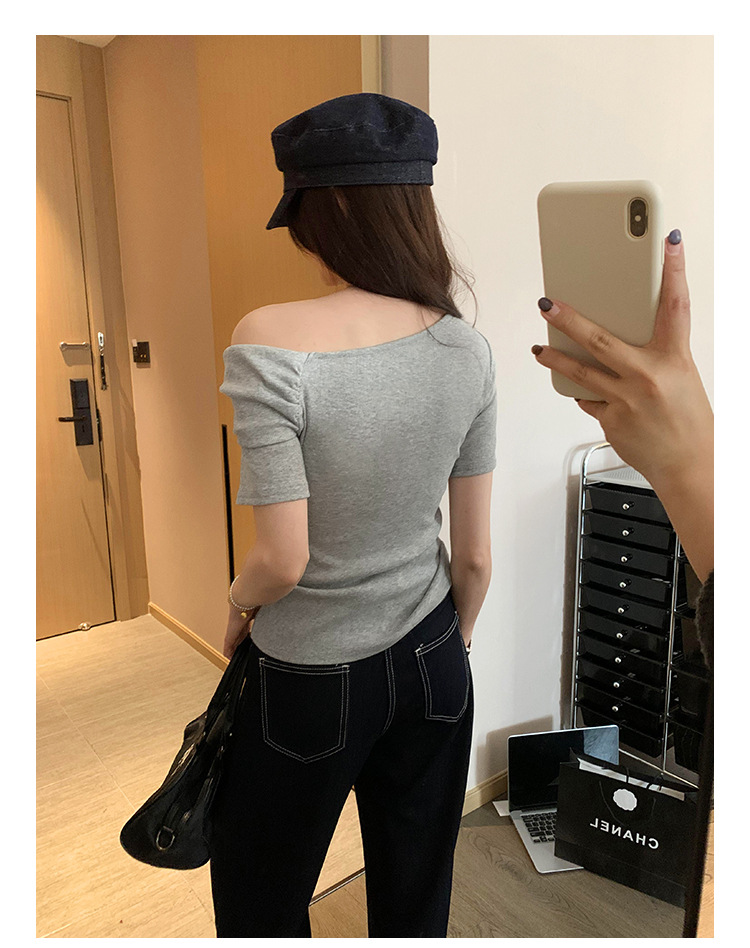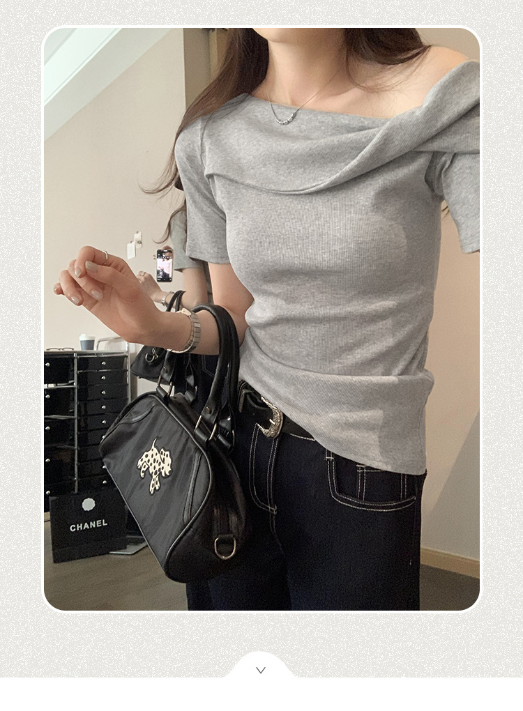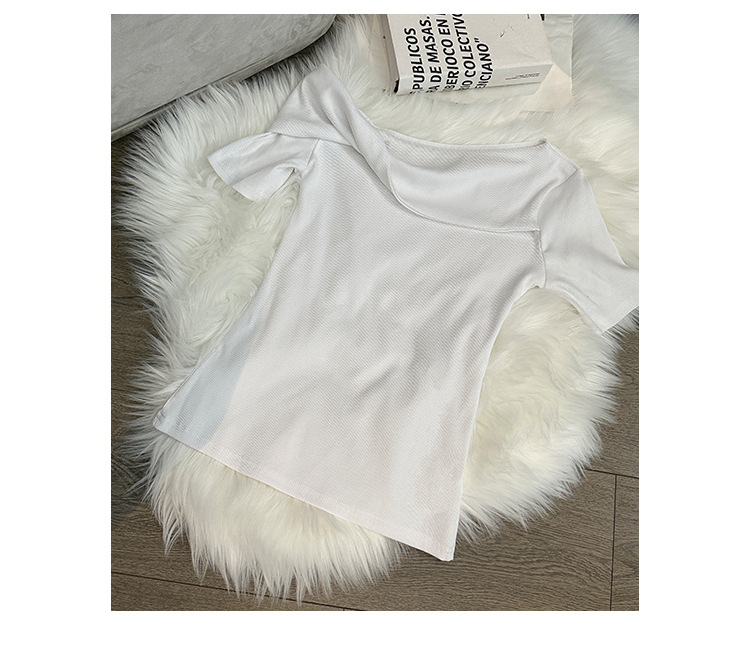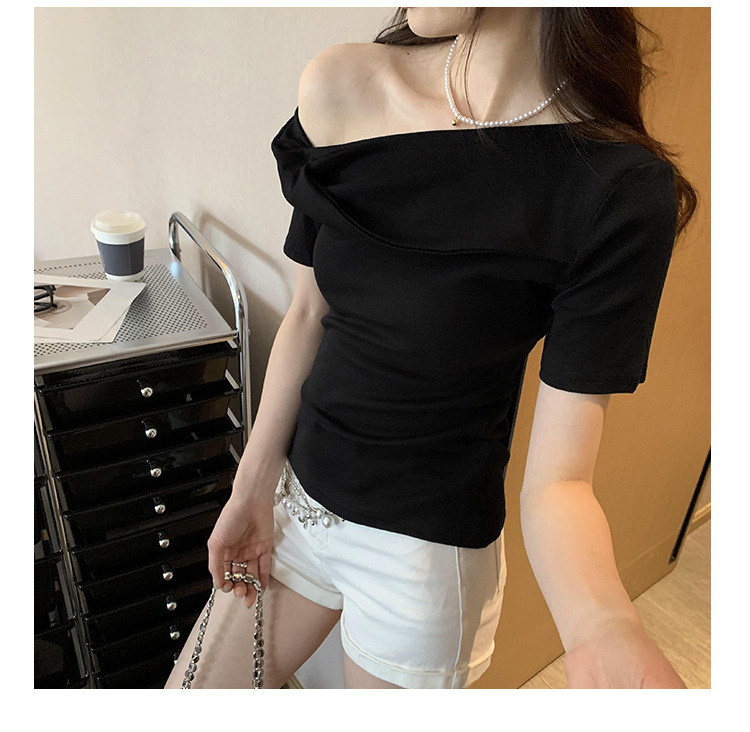 유럽의 독특한 스파이스 소녀 디자인 센스 슬란트 어깨 반팔 티셔츠 여성의 2025 여름 슬림핏 퓨어 숄더 탑