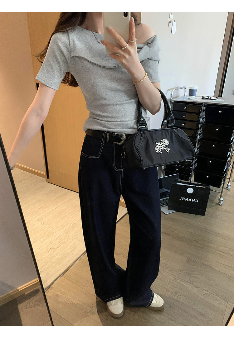 유럽의 독특한 스파이스 소녀 디자인 센스 슬란트 어깨 반팔 티셔츠 여성의 2025 여름 슬림핏 퓨어 숄더 탑스토어 가기