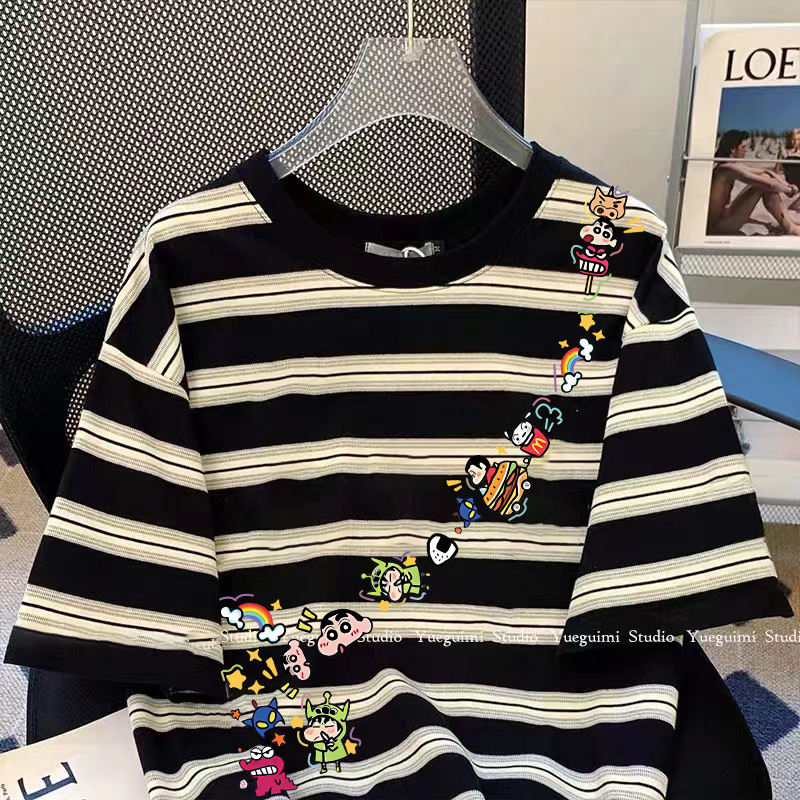 [특별 제공 원사 염색 스트립] 유럽 흑백 줄무늬 반팔 티셔츠 여성 여름 2025 여름 느슨한 티셔츠 탑