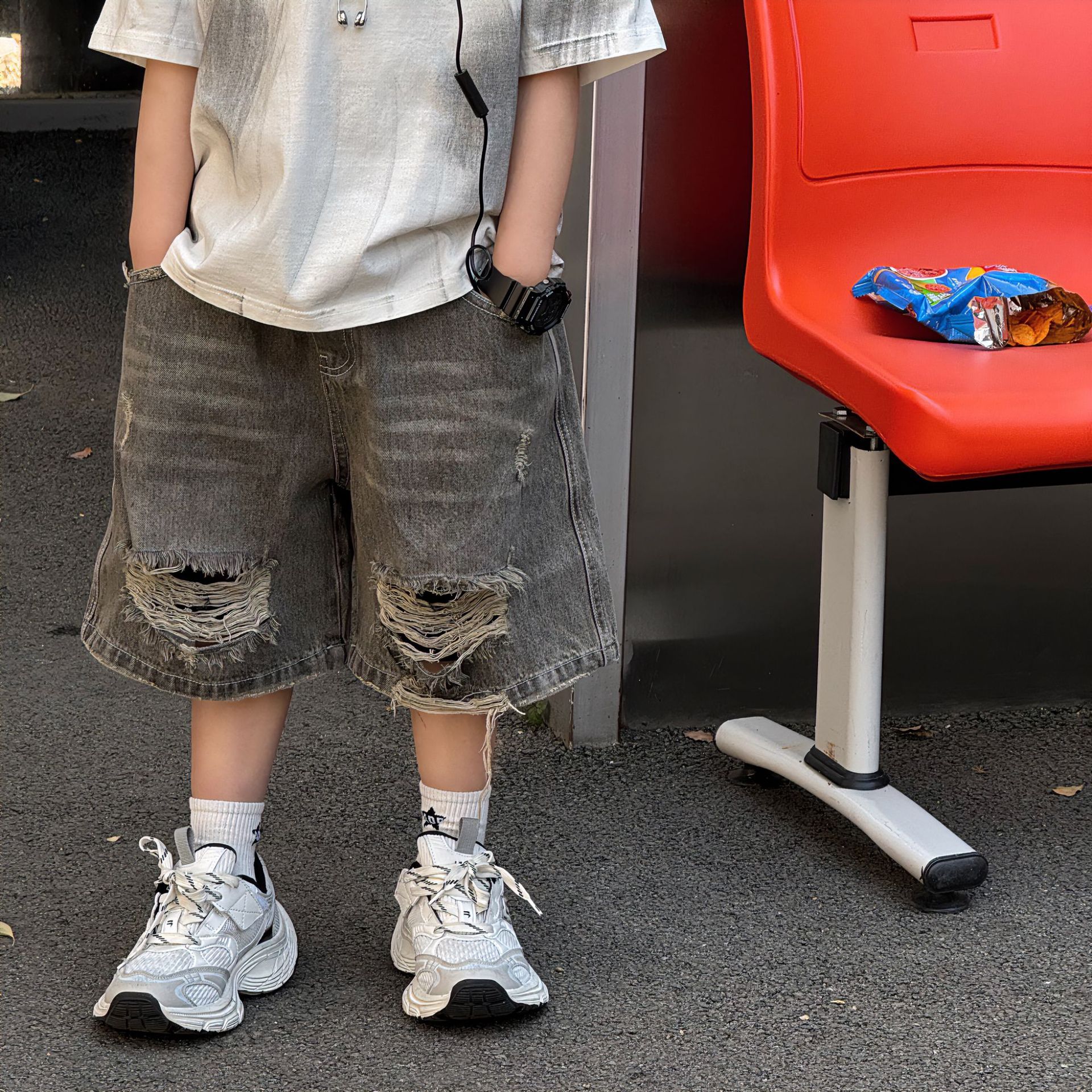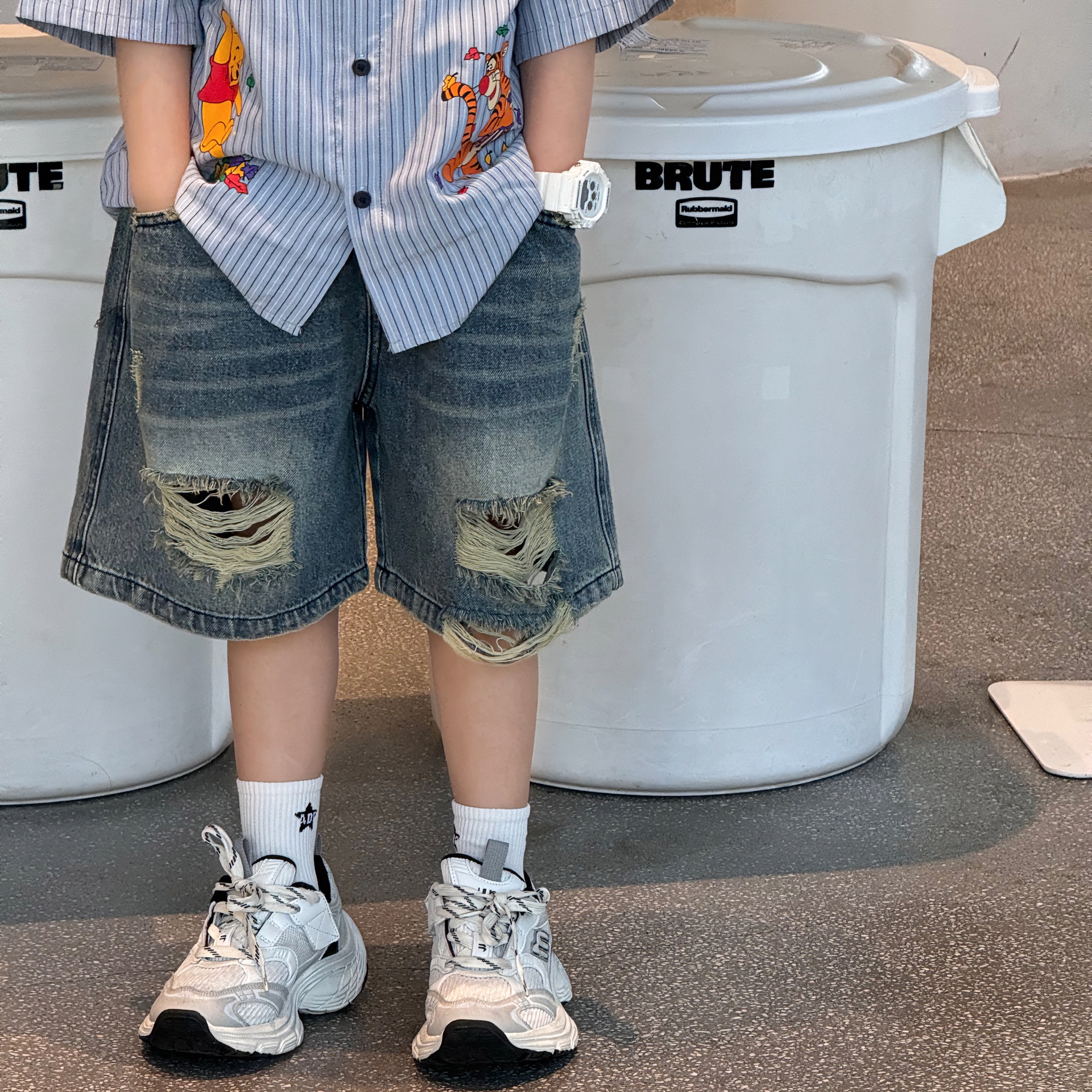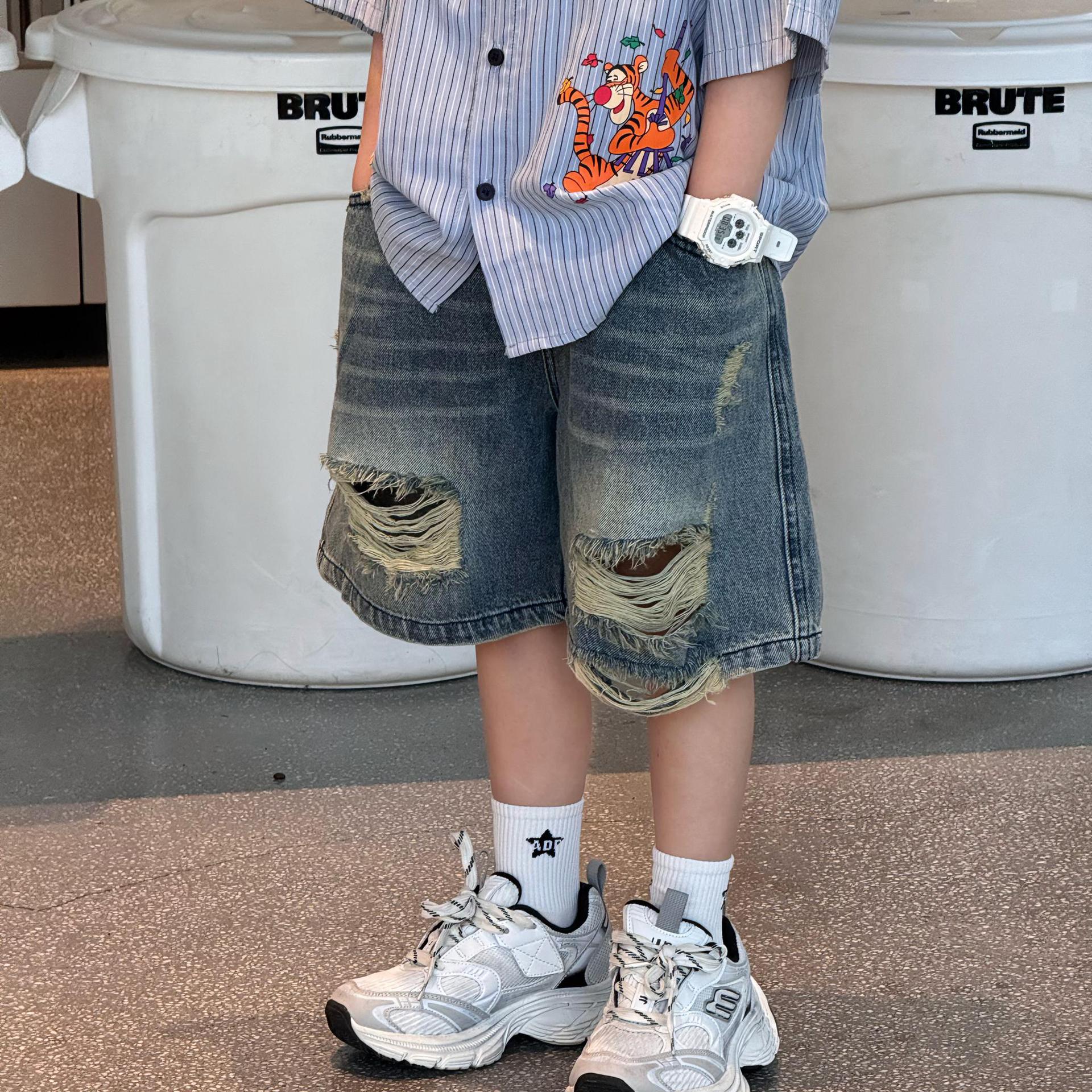 Tairu 2025 여름 새로운 도착 한국 스타일 소년의 패셔너블 올 매치 리핑 아메리칸 스타일 올드 청바지 트렌디 한 어린이 반바지