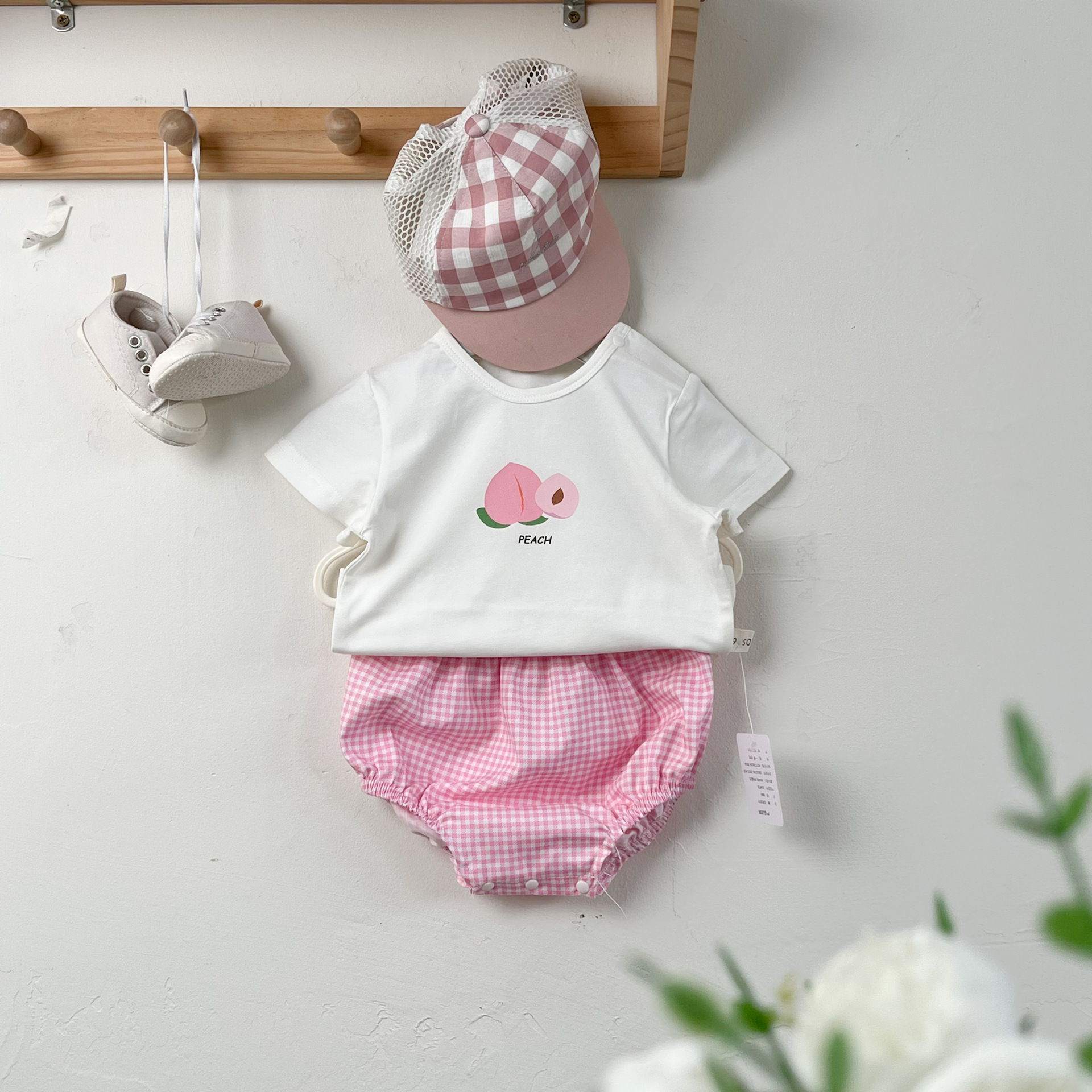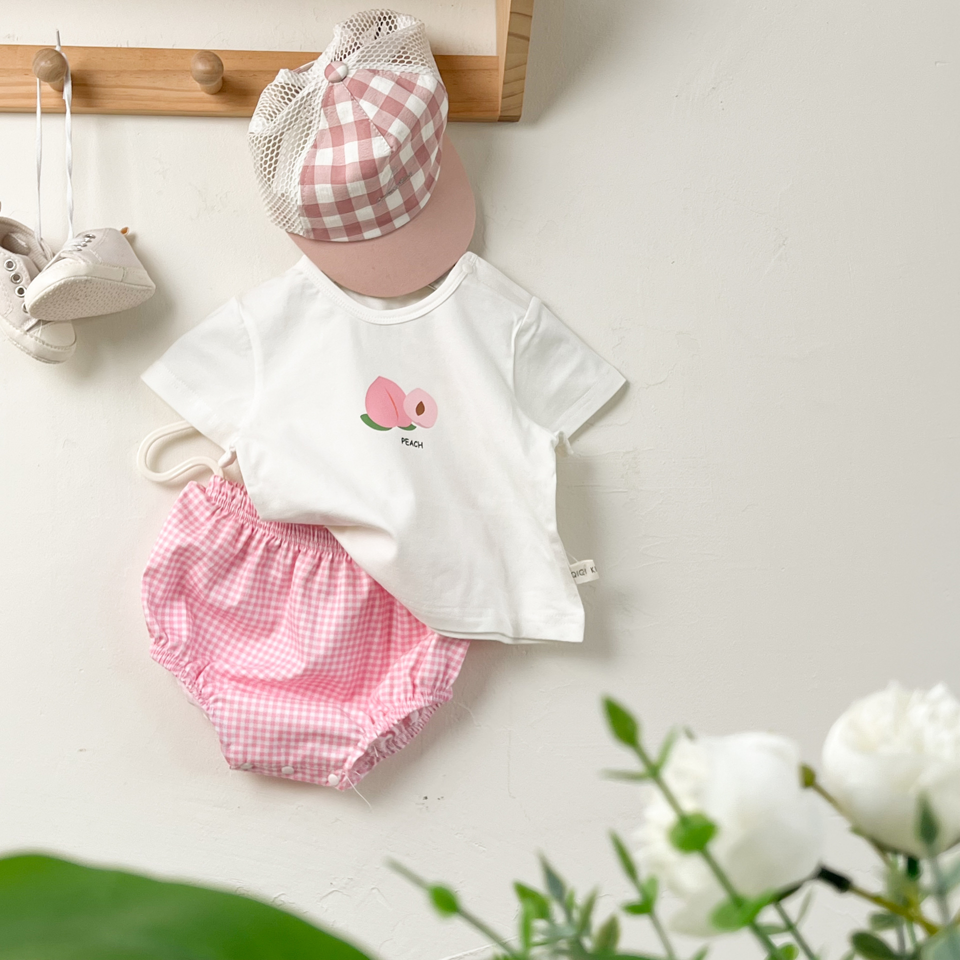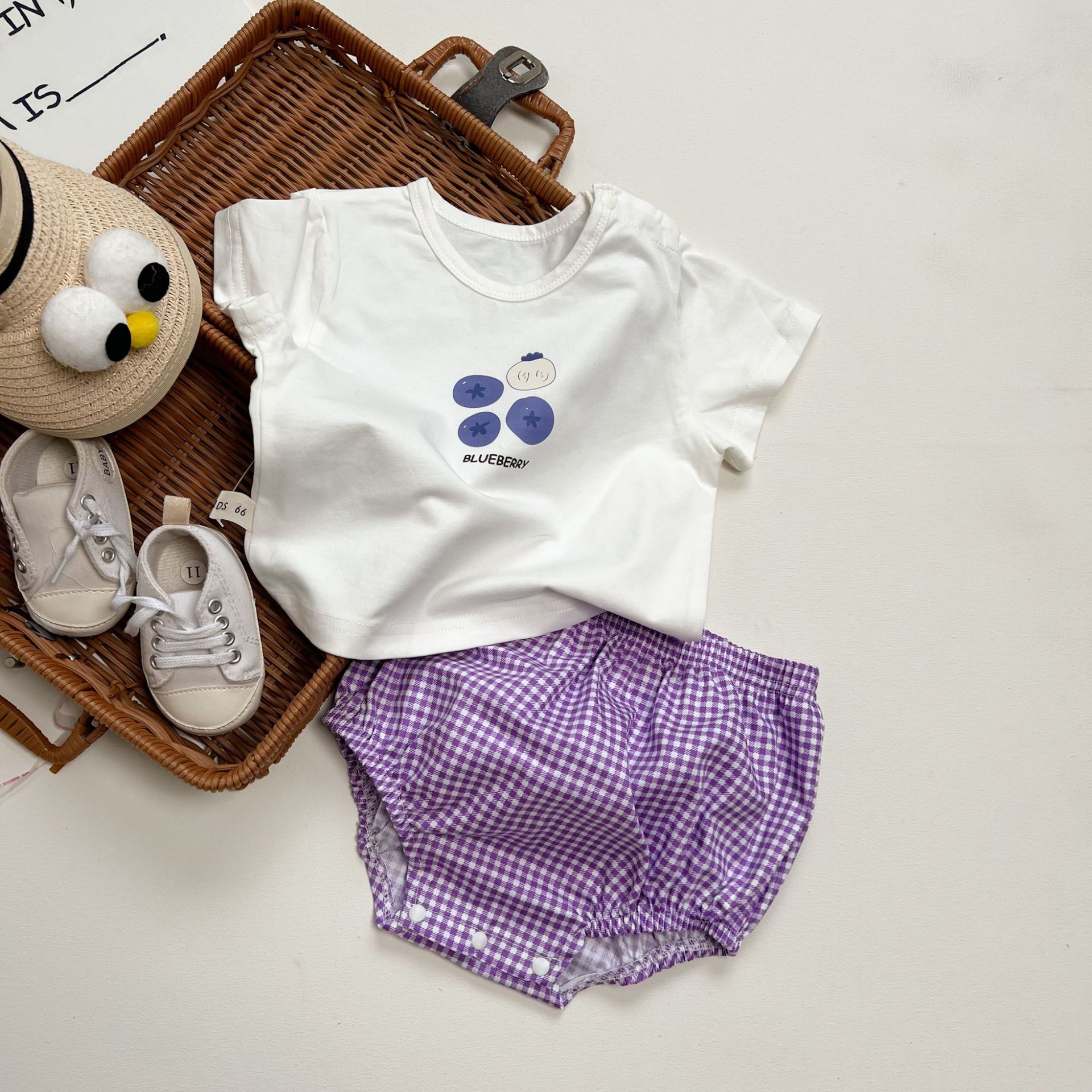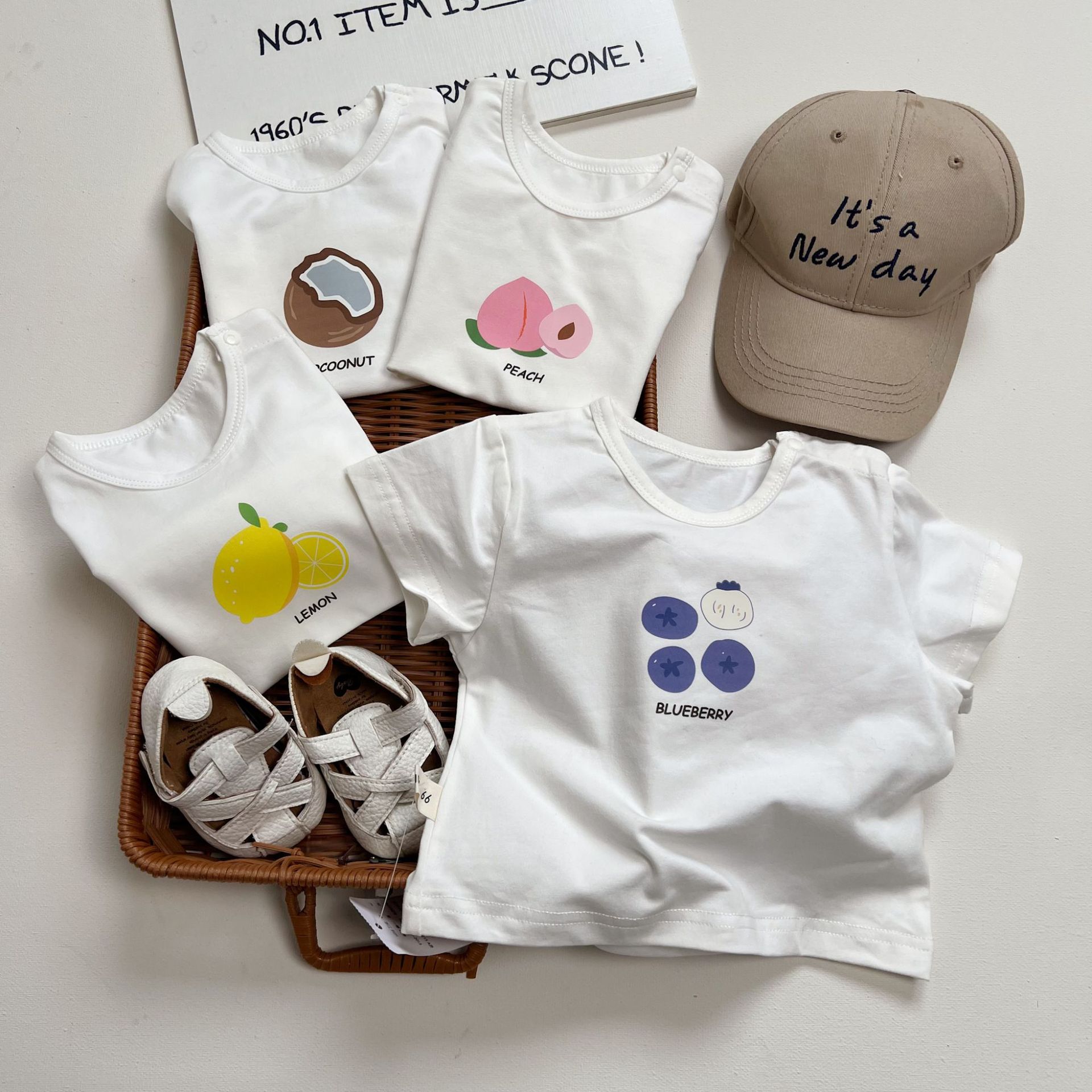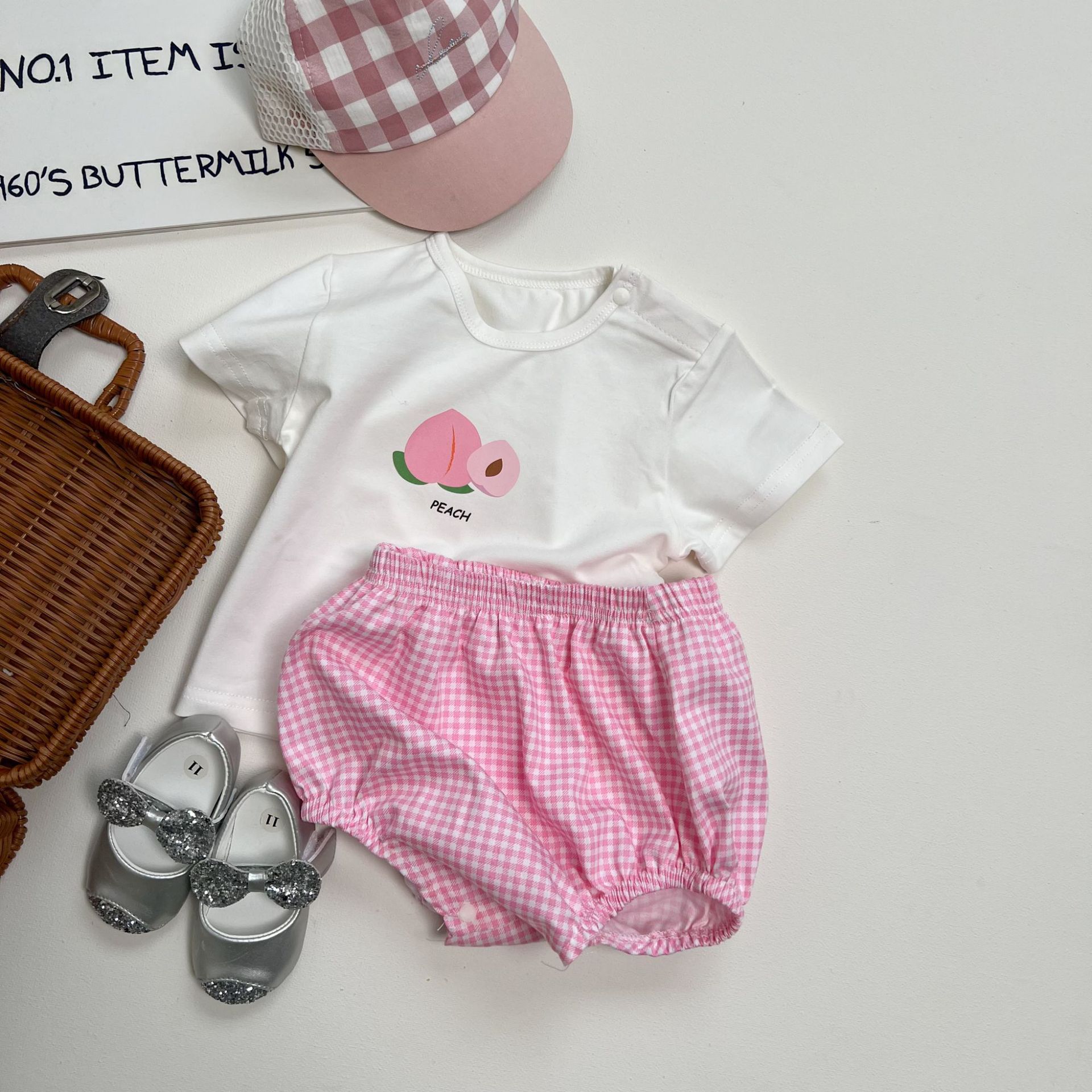25 여름 새로운 반팔 반바지 귀여운 아기와 어린 아이들의 얇은 티셔츠 큰 PP 바지 한국 스타일 소년 소녀 세트 과일스토어 가기