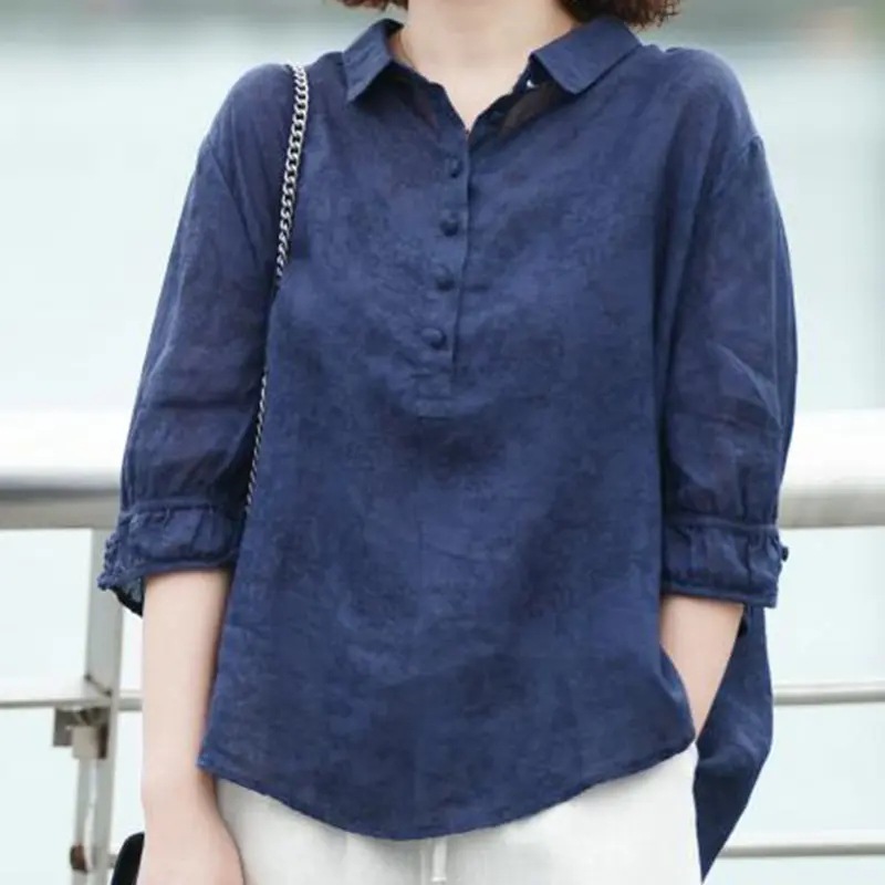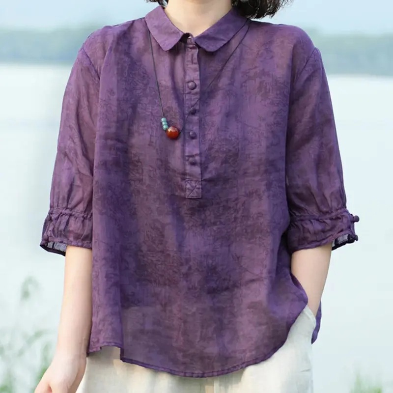 예술적 인쇄 레트로 미드 슬리브 셔츠 여자 여름 2024 새로운 올 매치 셔츠 루즈 캐주얼 폴로 칼라 탑