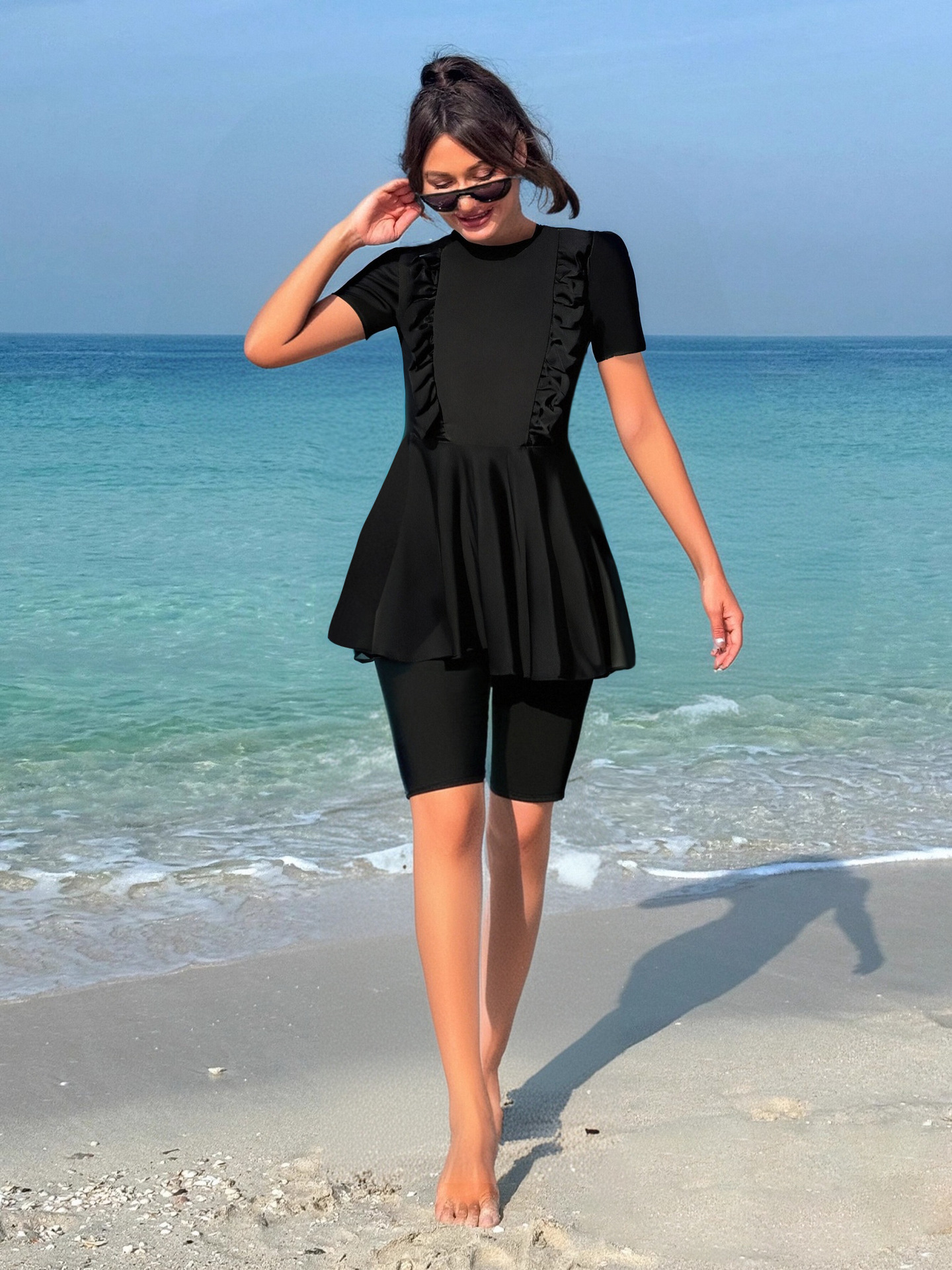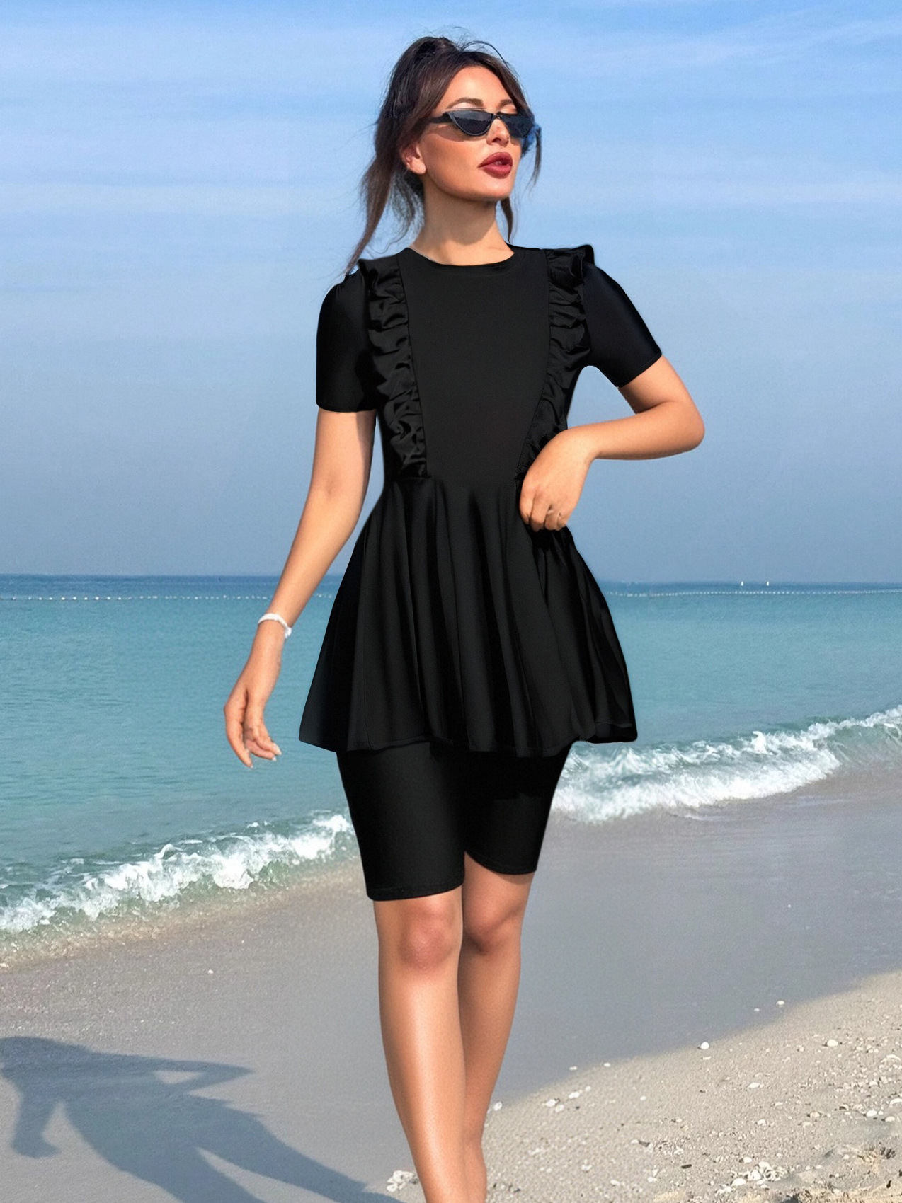 국경 간 유럽과 미국의 패션 솔리드 컬러 수영복 여성 아마존 프릴 반팔 반바지 꽉 슬리밍 해변 서핑 슈트스토어 가기