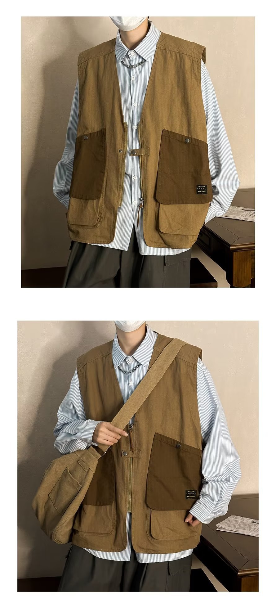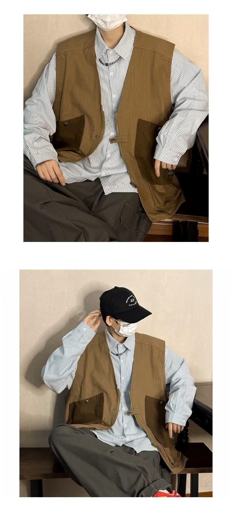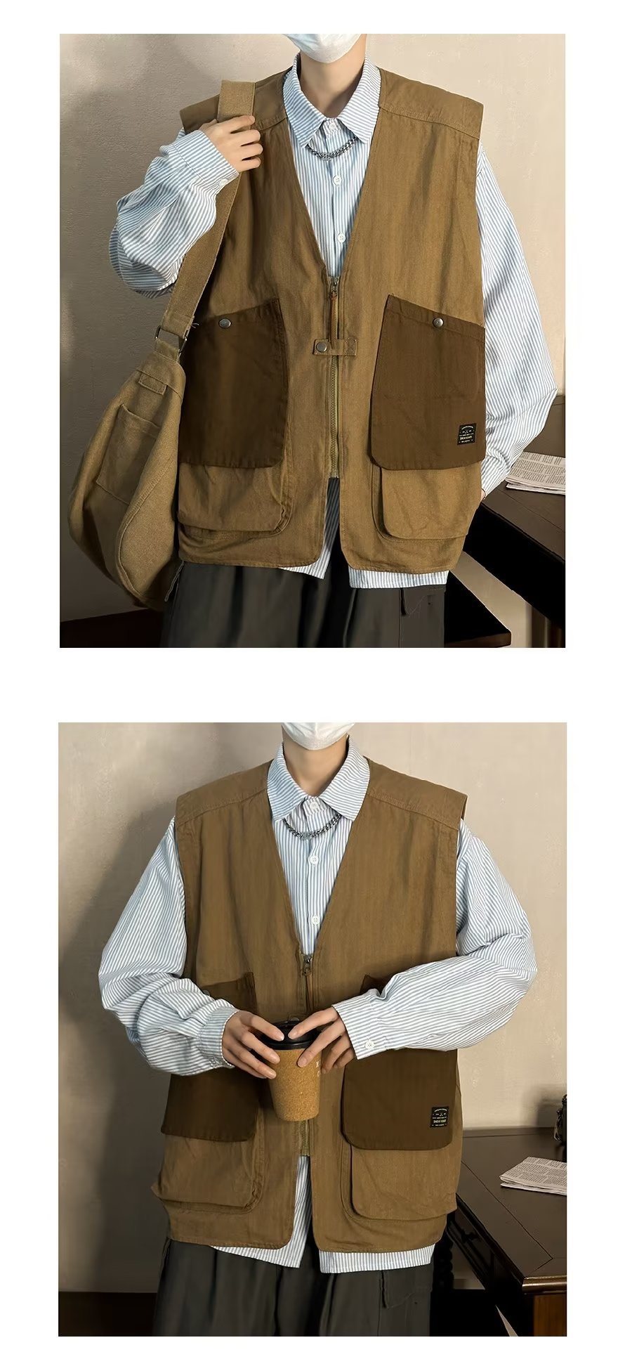 일본식 바느질 포켓 카고 조끼 남성용 빈티지 루즈 재킷 캐주얼 V 넥 탑 민소매 웨어 조끼