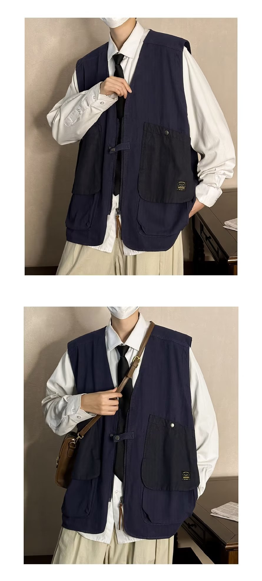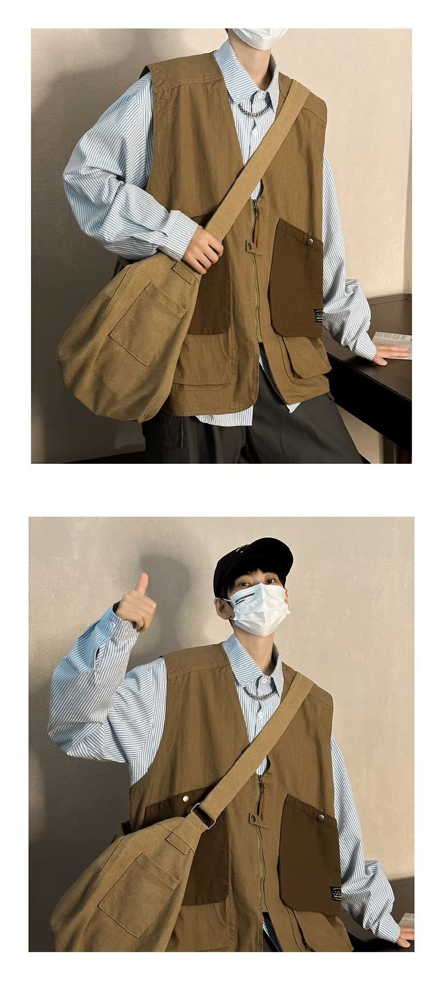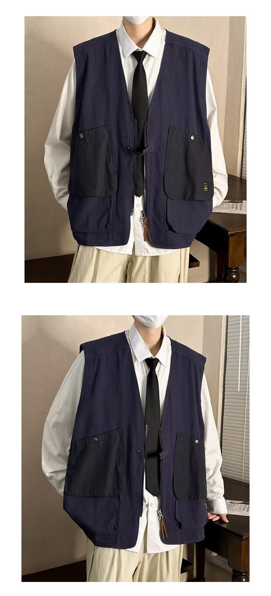 일본식 바느질 포켓 카고 조끼 남성용 빈티지 루즈 재킷 캐주얼 V 넥 탑 민소매 웨어 조끼