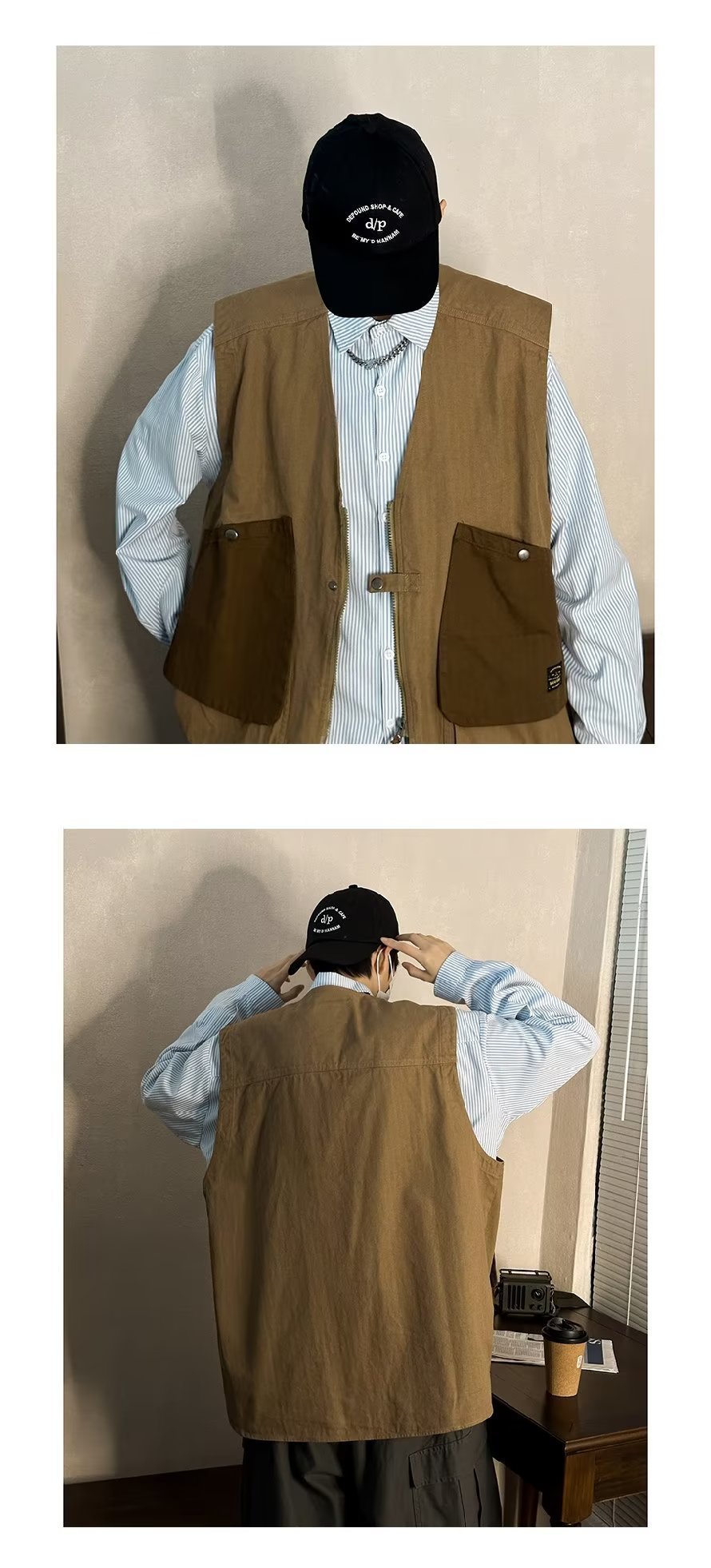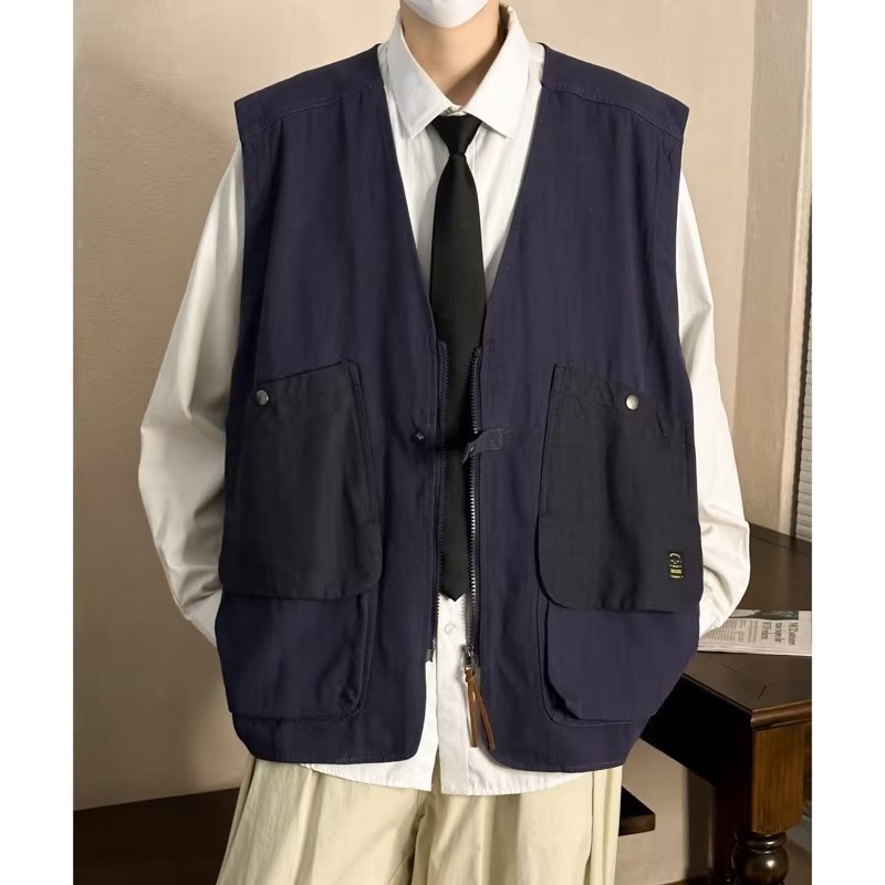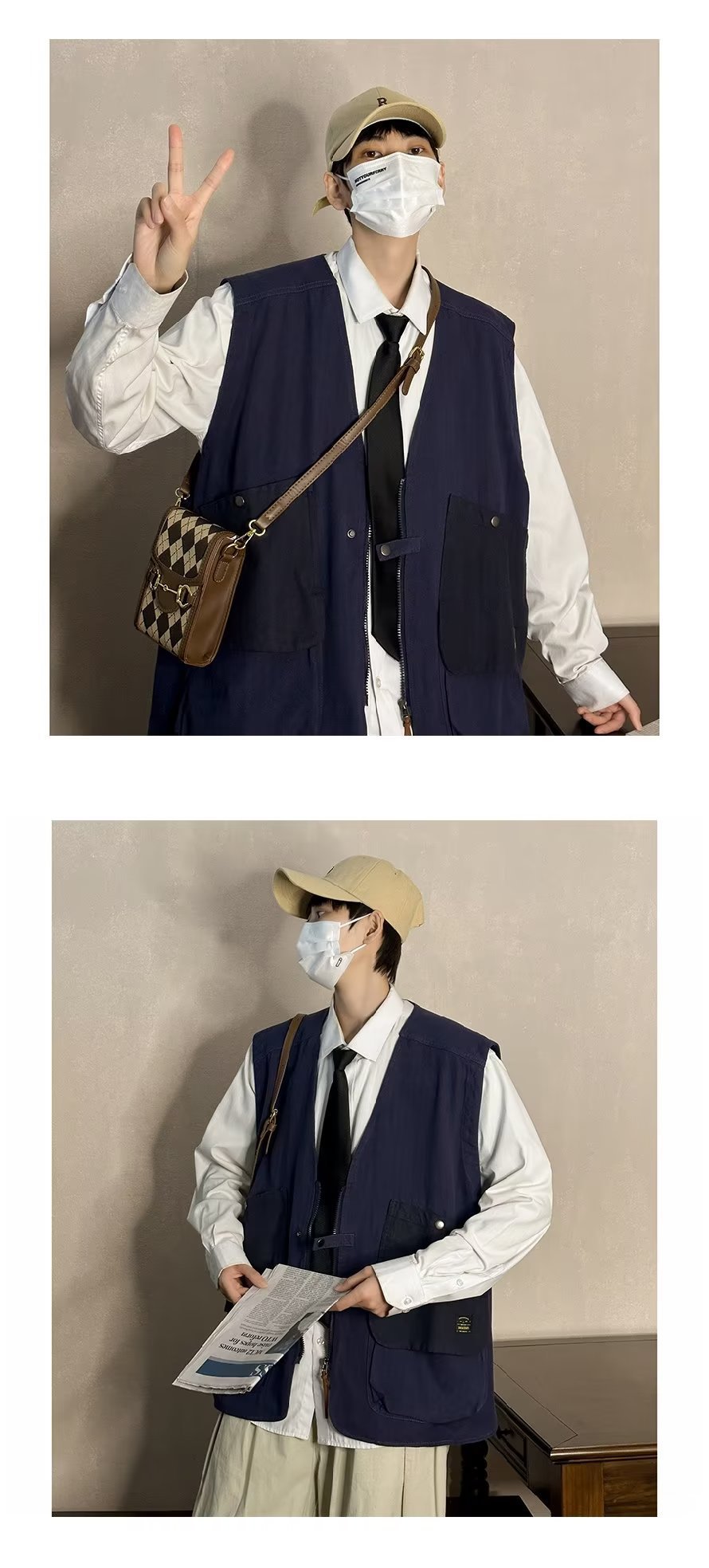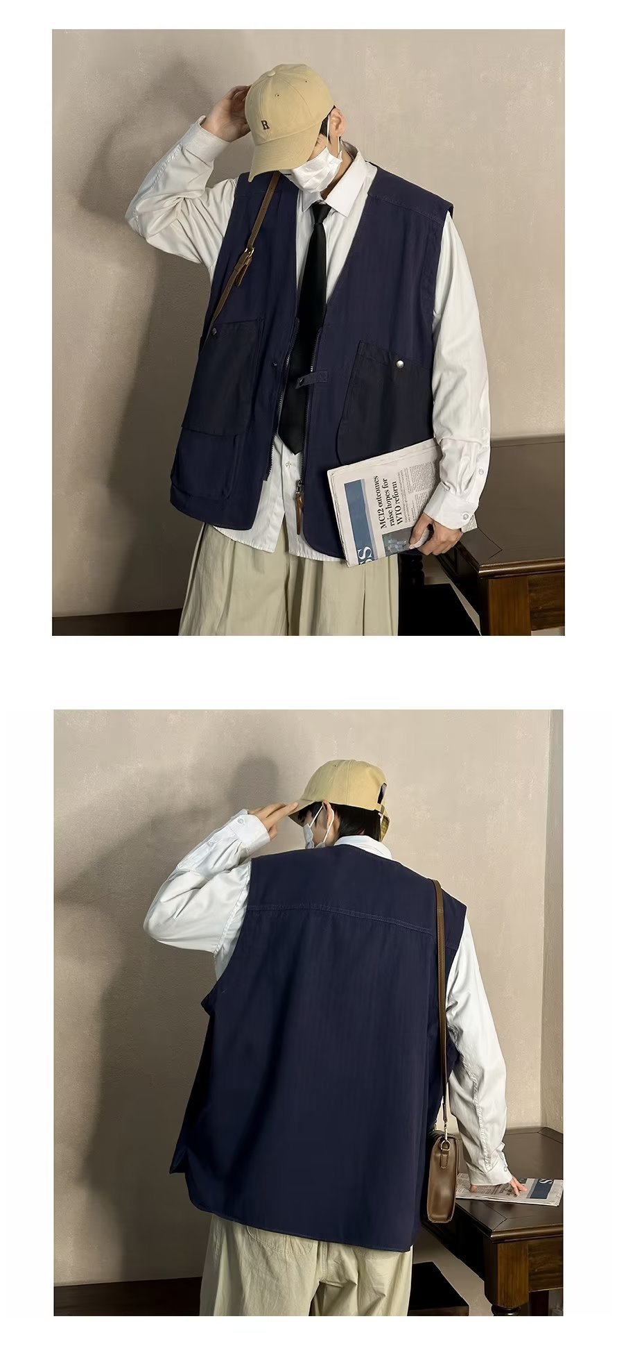 일본식 바느질 포켓 카고 조끼 남성용 빈티지 루즈 재킷 캐주얼 V 넥 탑 민소매 웨어 조끼스토어 가기