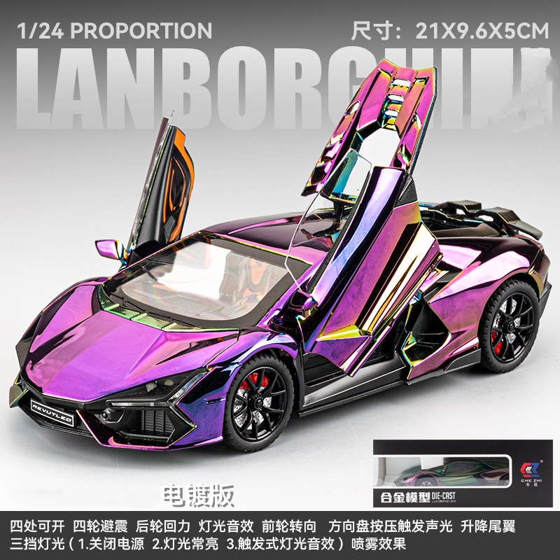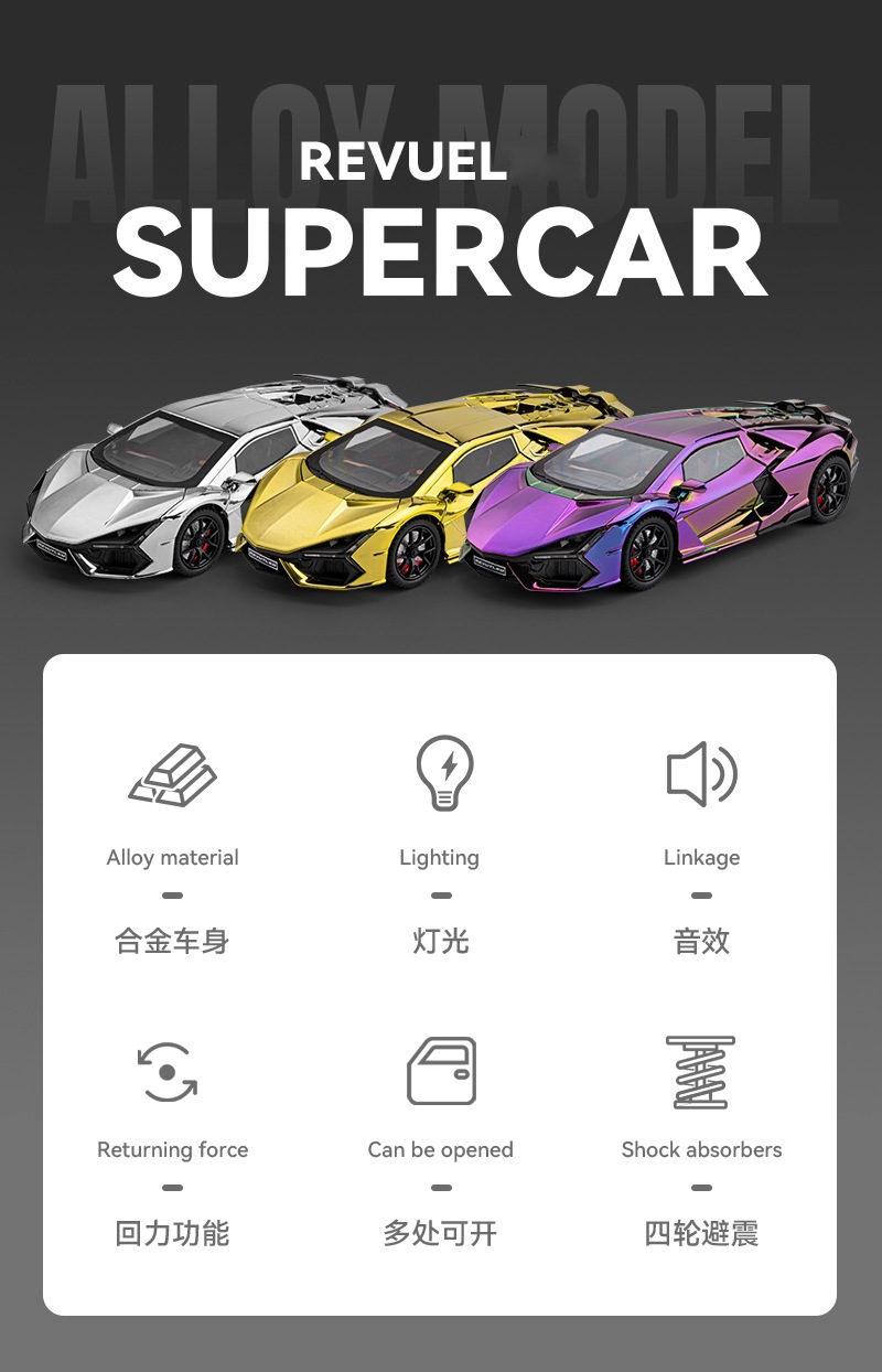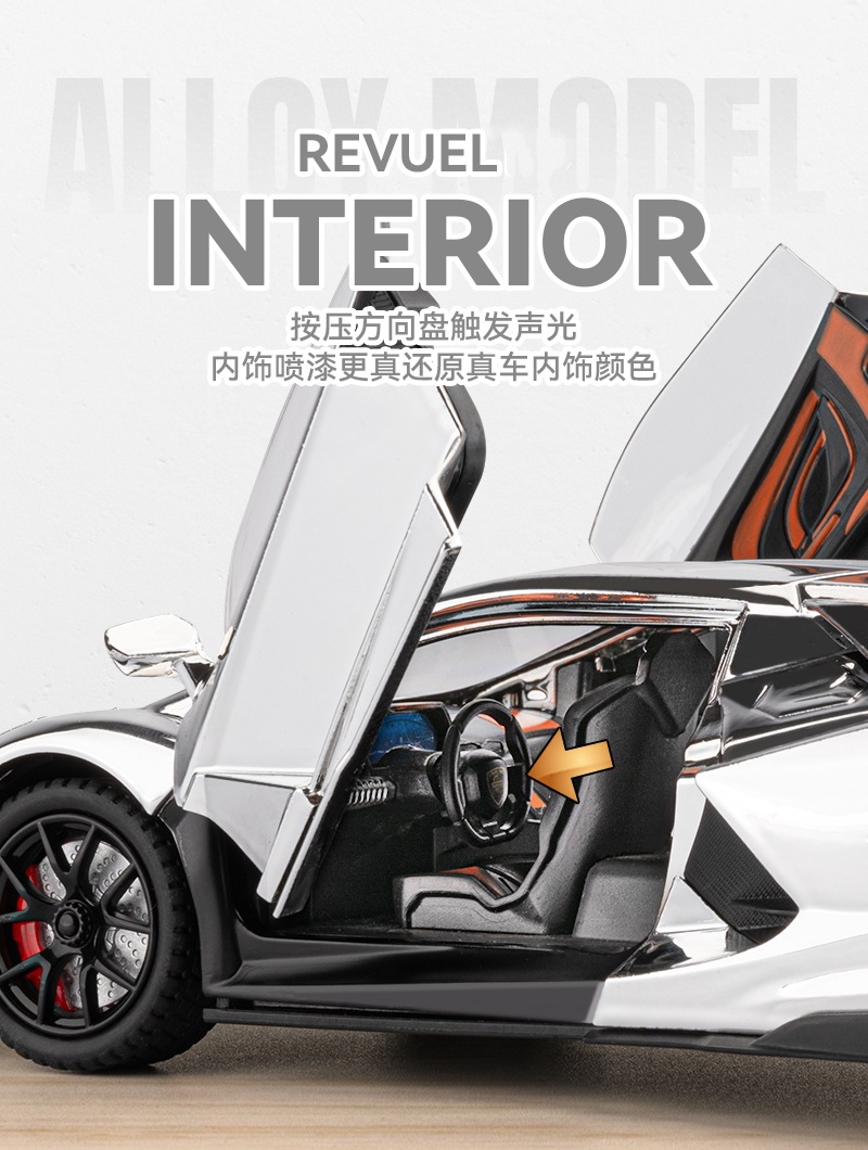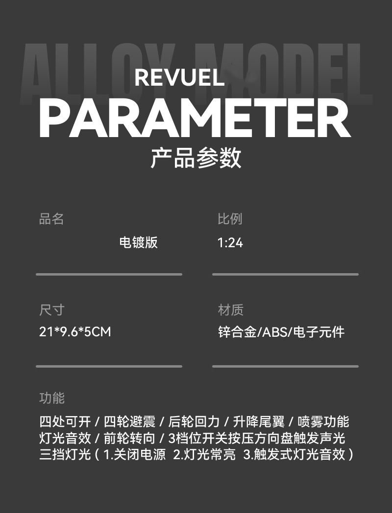 【商品功能】五开,声光回力功能;车尾仿真冒烟喷雾功能!可升降尾翼,前轮摆向,四轮减震;三档按压方向盘/按压前轮触发声光音效和喷雾功能;