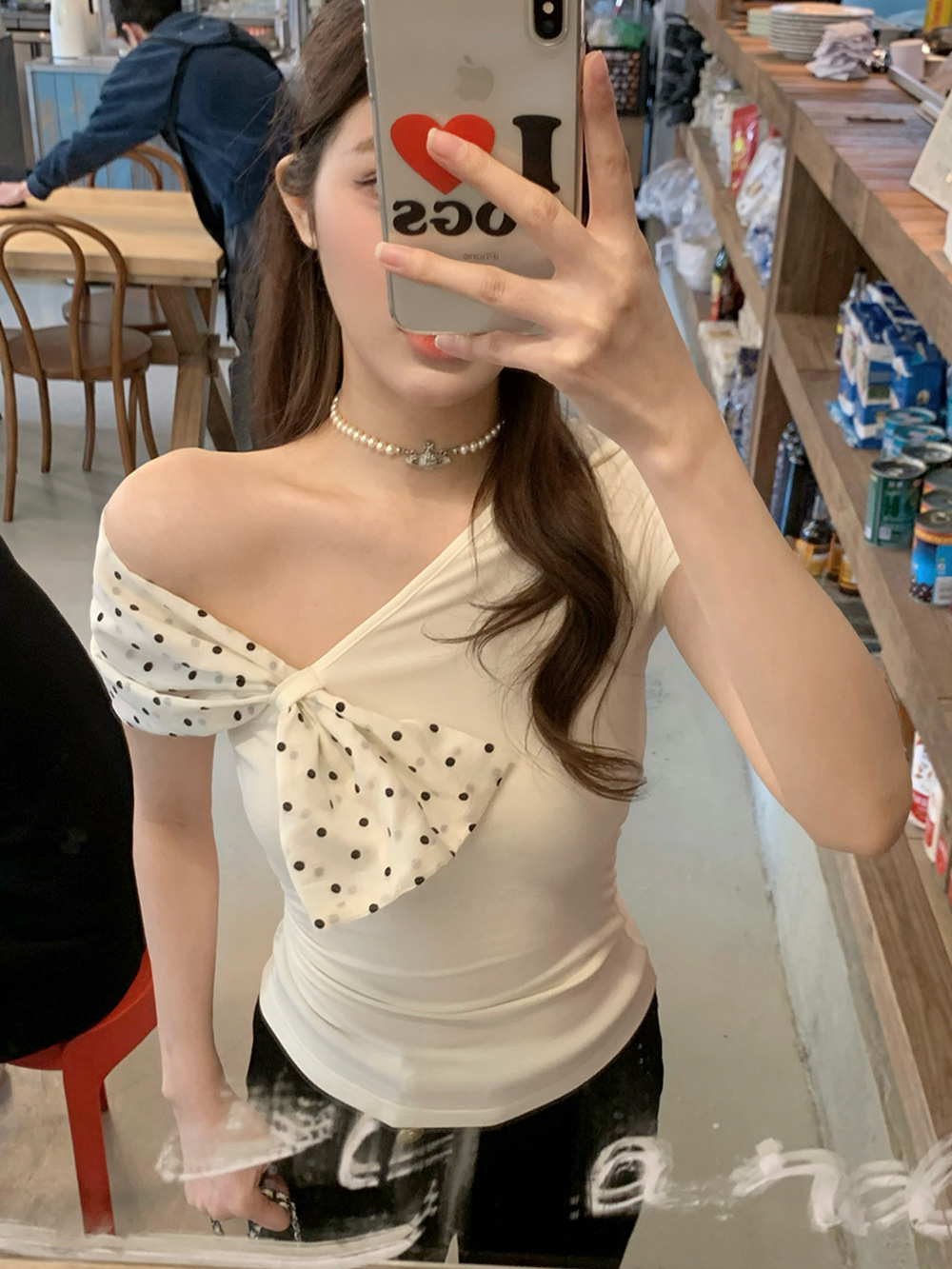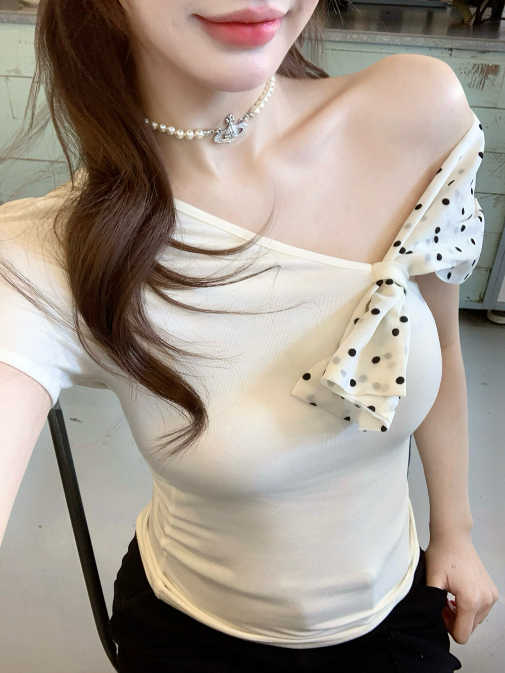 화이트 프랑스 패션 폴로 도트 오브리크 칼라 오프 숄더 반팔 티셔츠 여성용 작은 독특한 불규칙한 짧은 탑 트렌디스토어 가기
